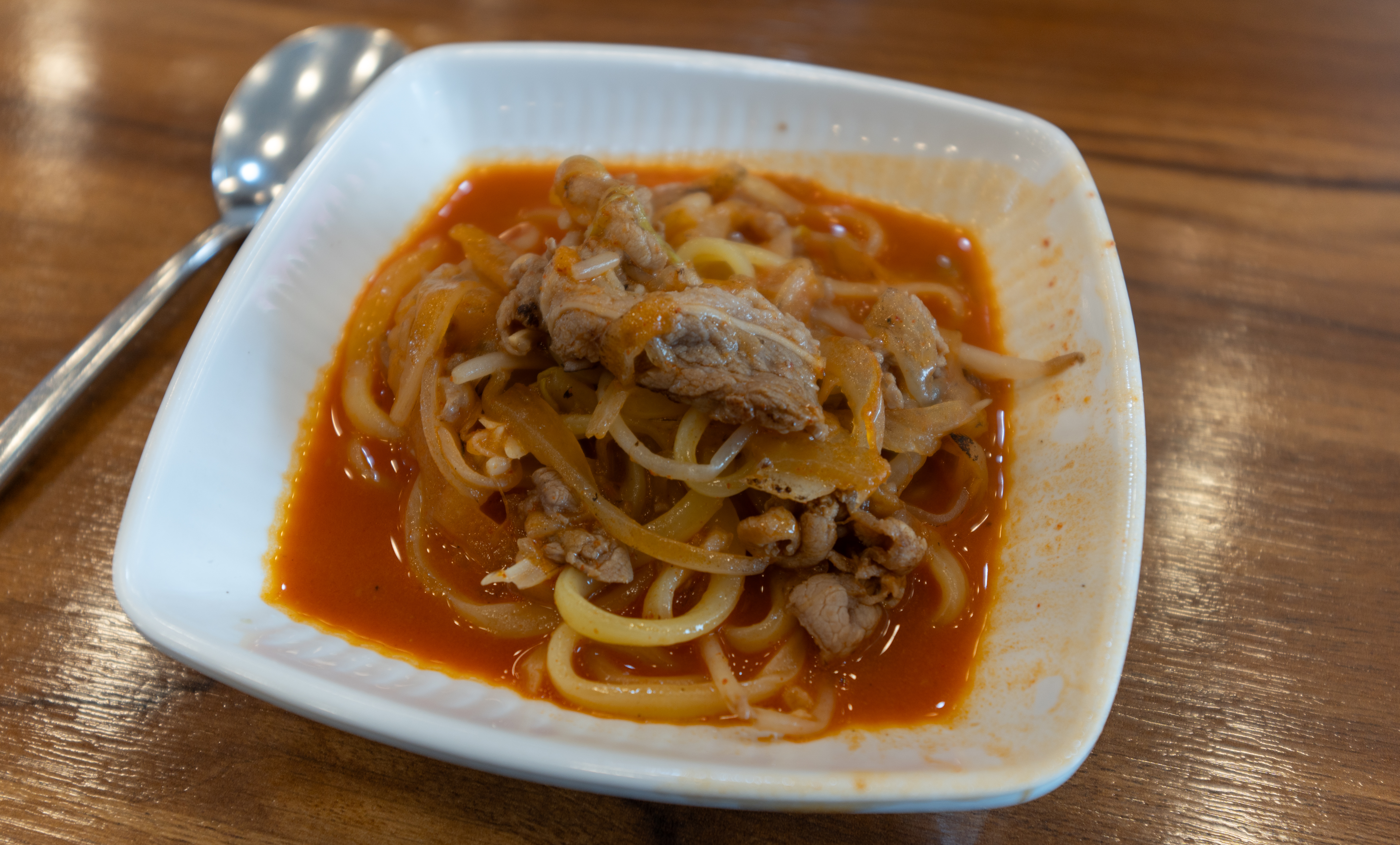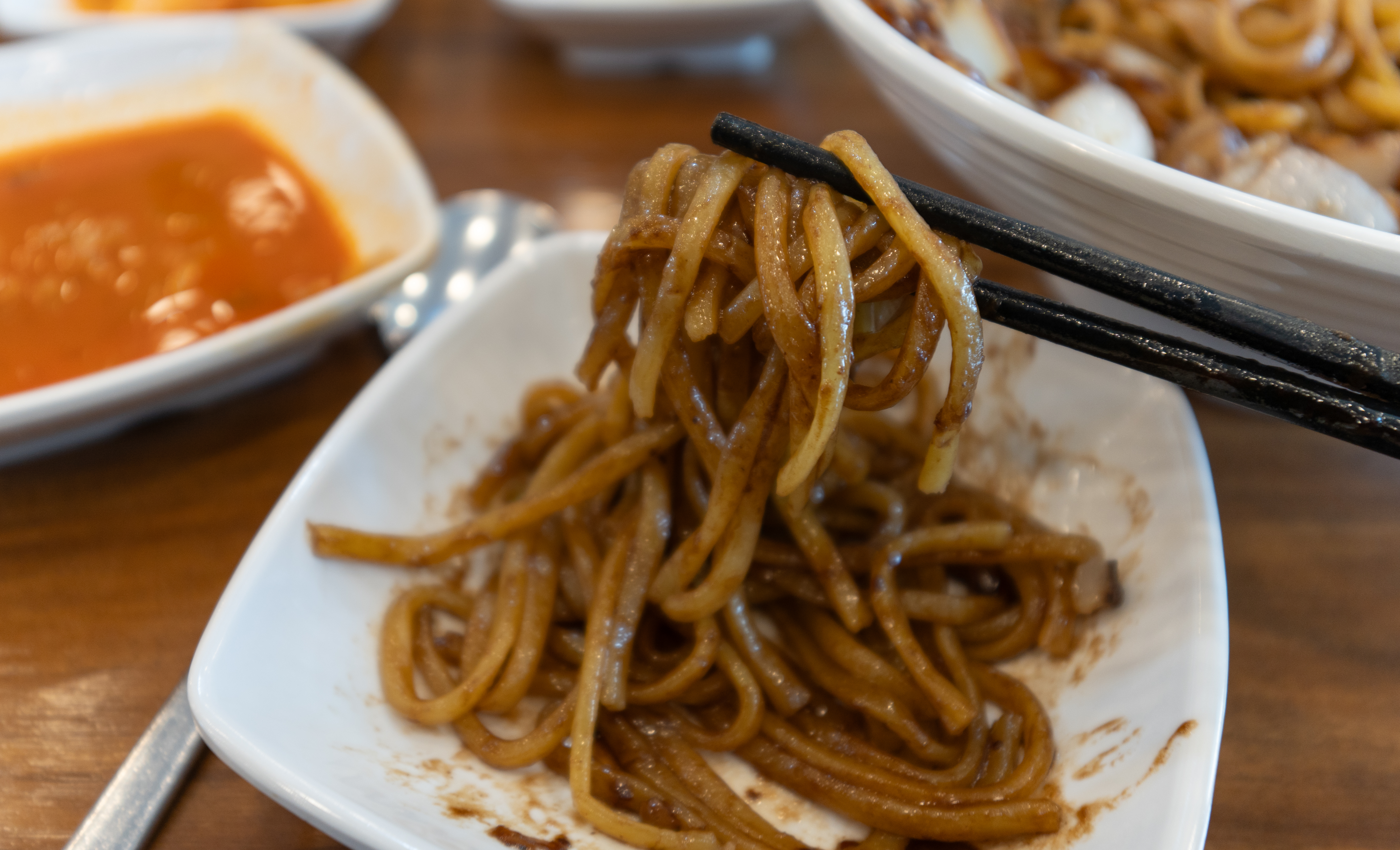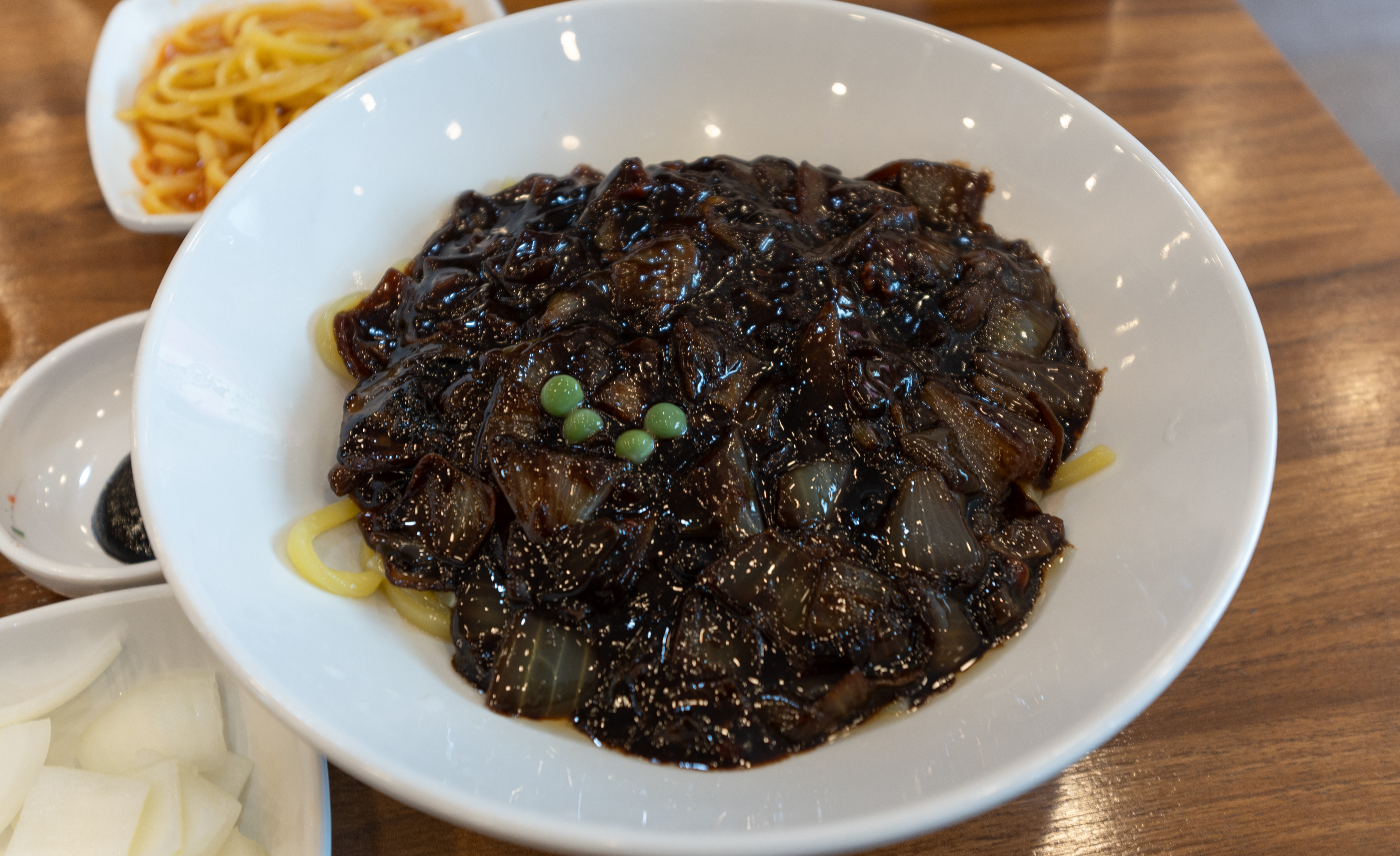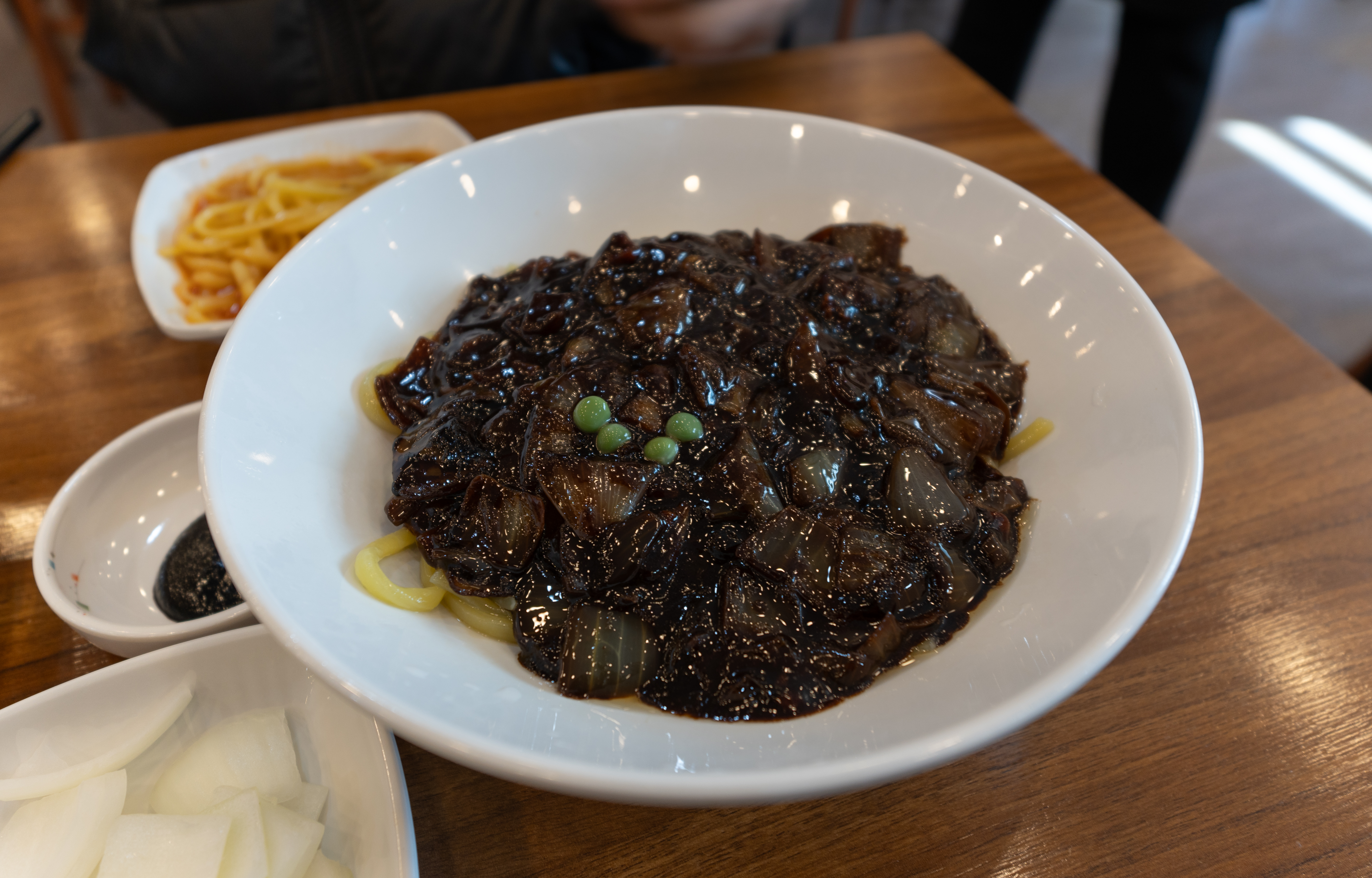 반찬이랑 식기류는 셀프코너에서 직접 가져오면 되었습니다. 저희는 양파, 자차이, 단무지, 춘장을 가져다 먹었고, 이곳에서는 원하는 만큼 밥도 가져다 먹을 수 있도록 되어있었습니다.