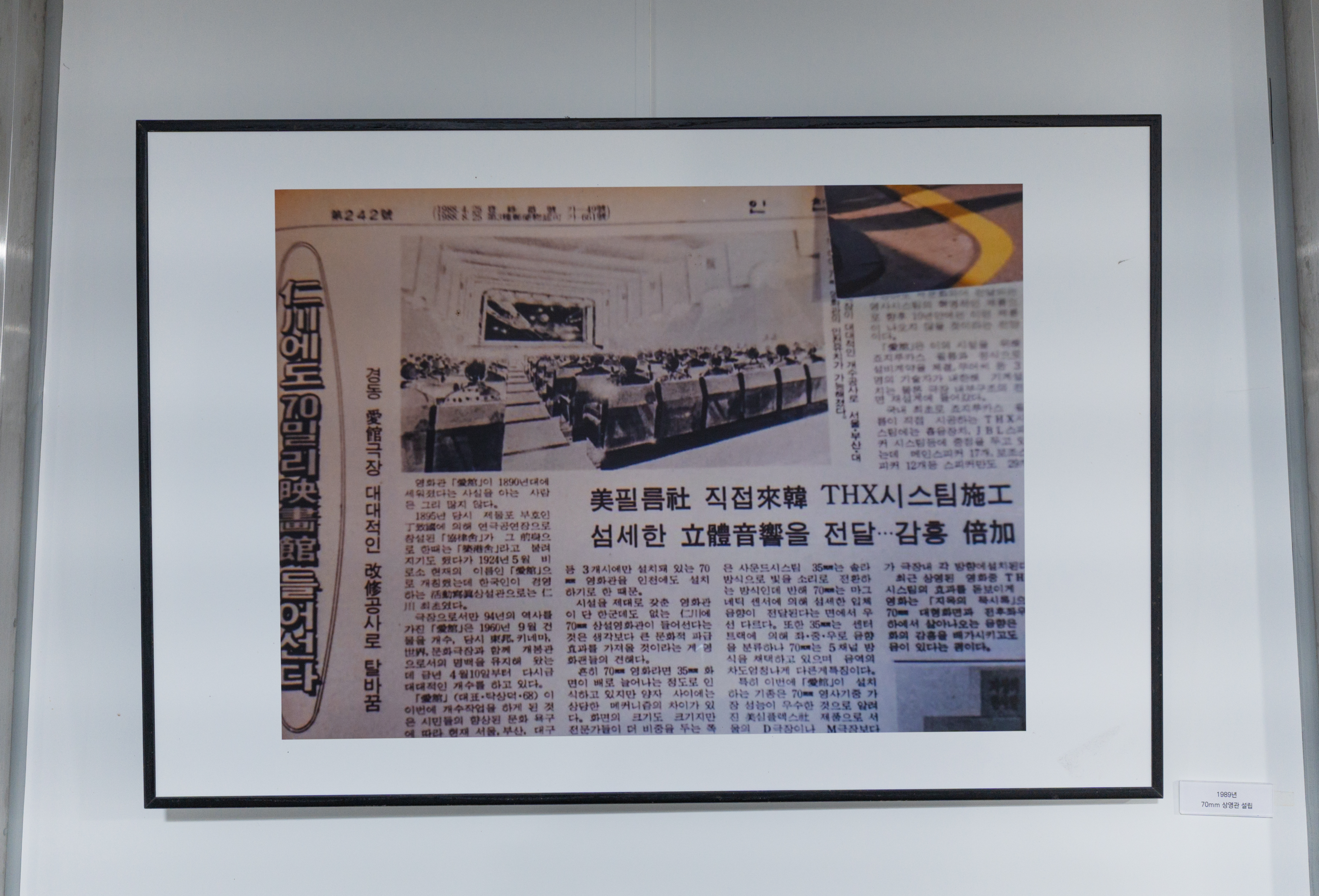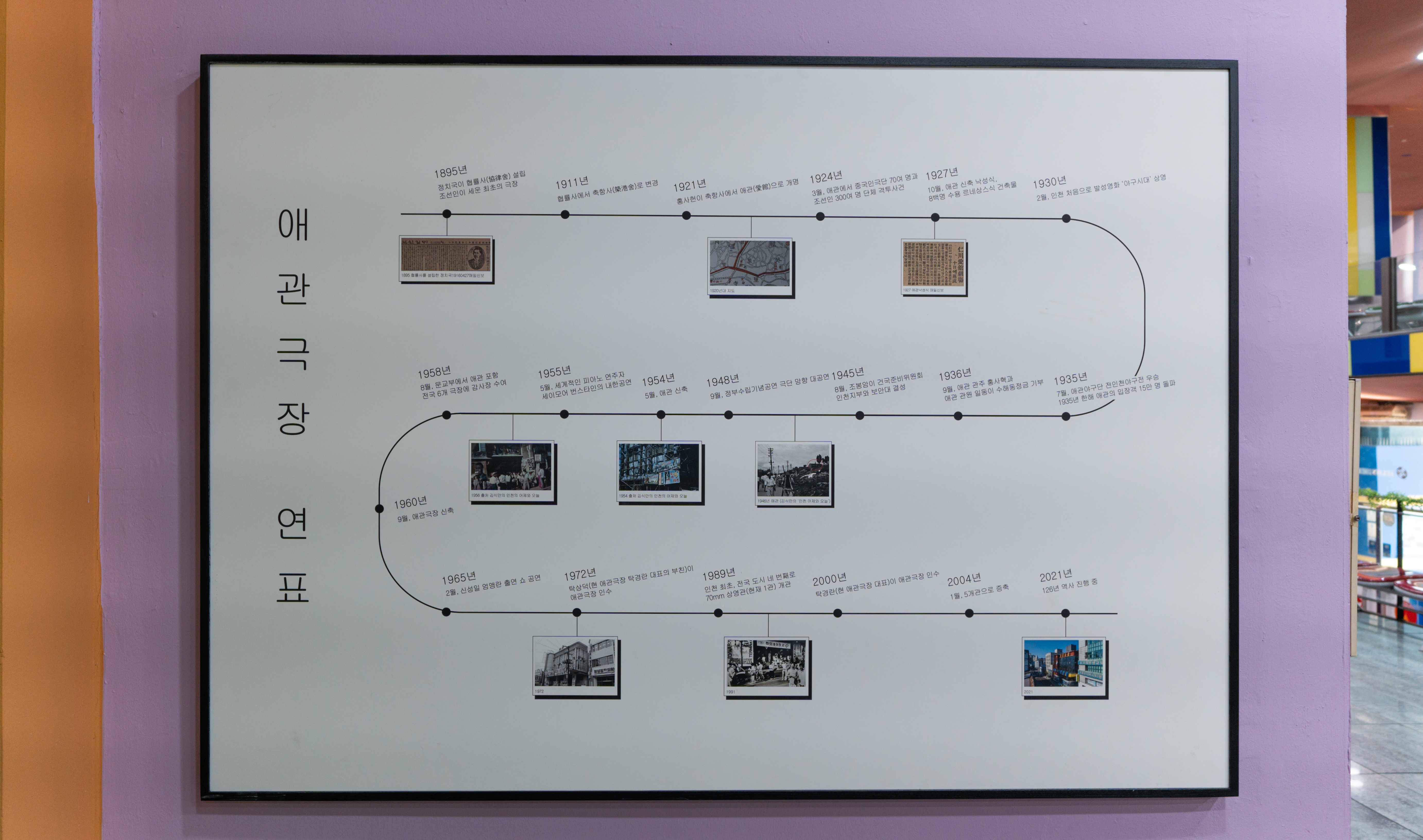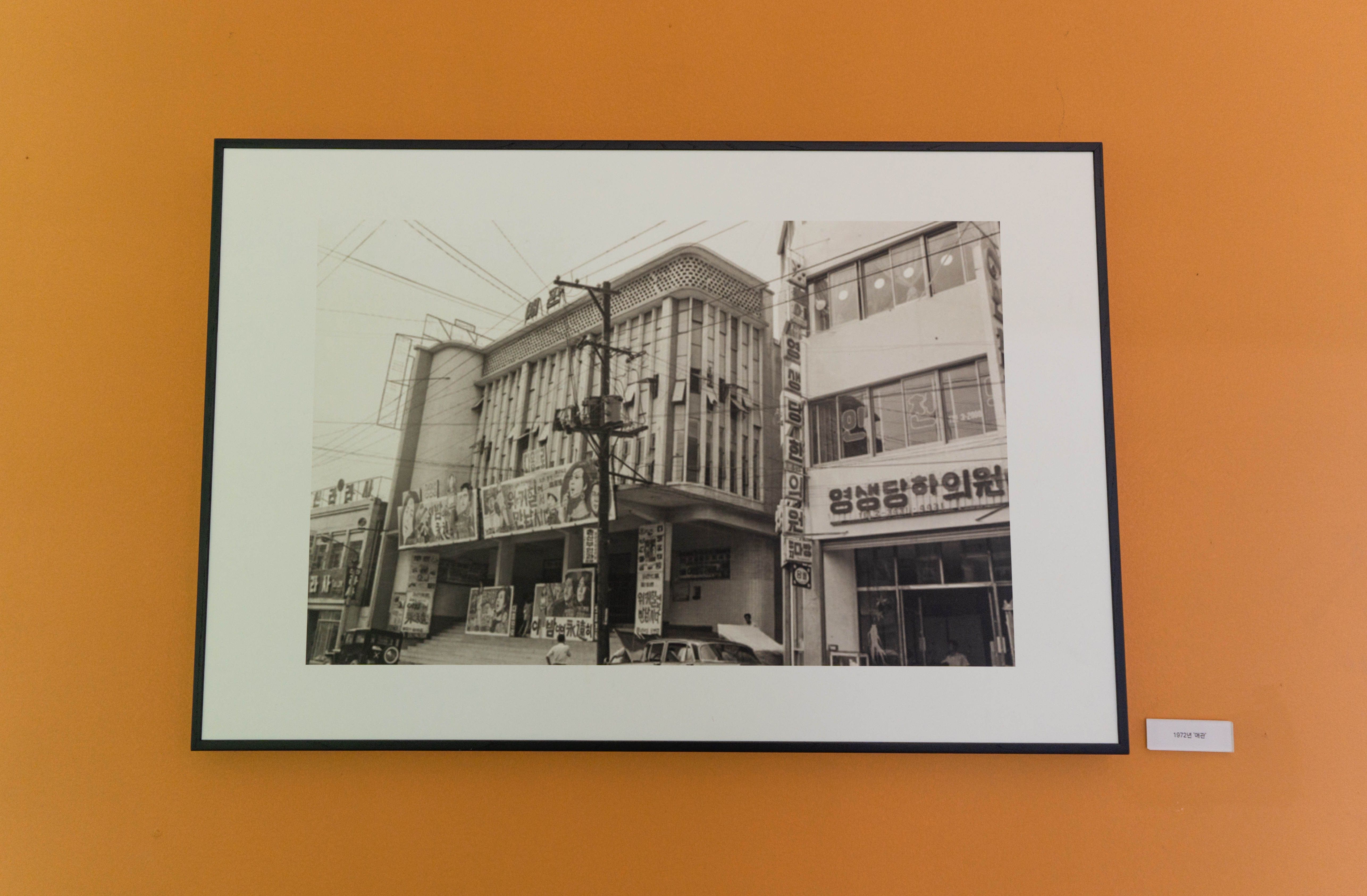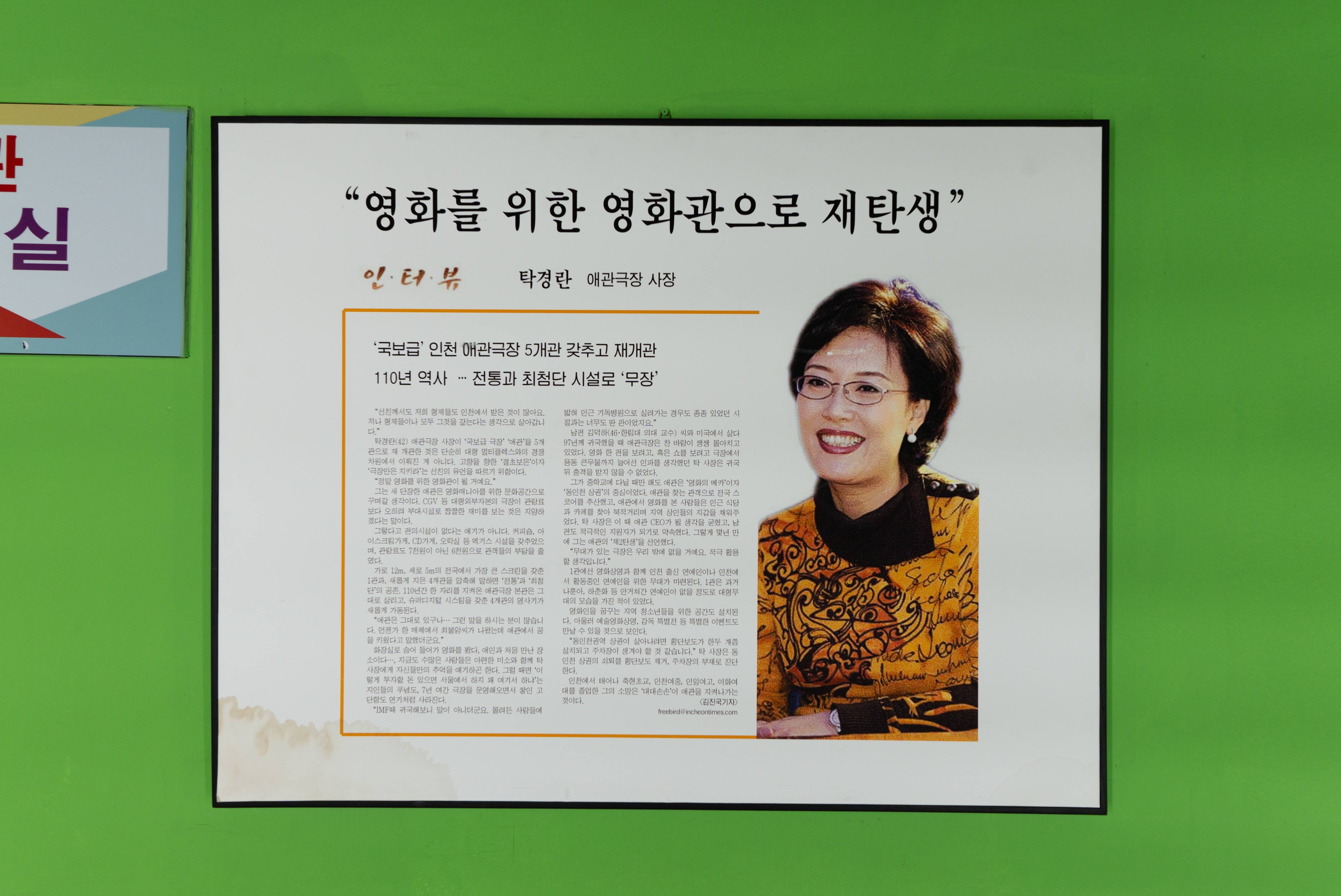 영화관에 대한 정보들은 영화관 곳곳에 게시된 액자들을 통해 어렵지 않게 확인할 수 있었습니다. 애관극장은 1895년 협률사로 개관된 이후 여러 사연들을 담고 있는 건물이었습니다. 1911년 축항사로 이름이 바뀌었다가 1921년 애관으로 개명된 이후 애관극장은 한국전쟁 중 소실되었다가 1960년 9월 재건축되었다고 합니다. 이후 영화관으로 쭉 명맥을 이어오고 있었습니다.