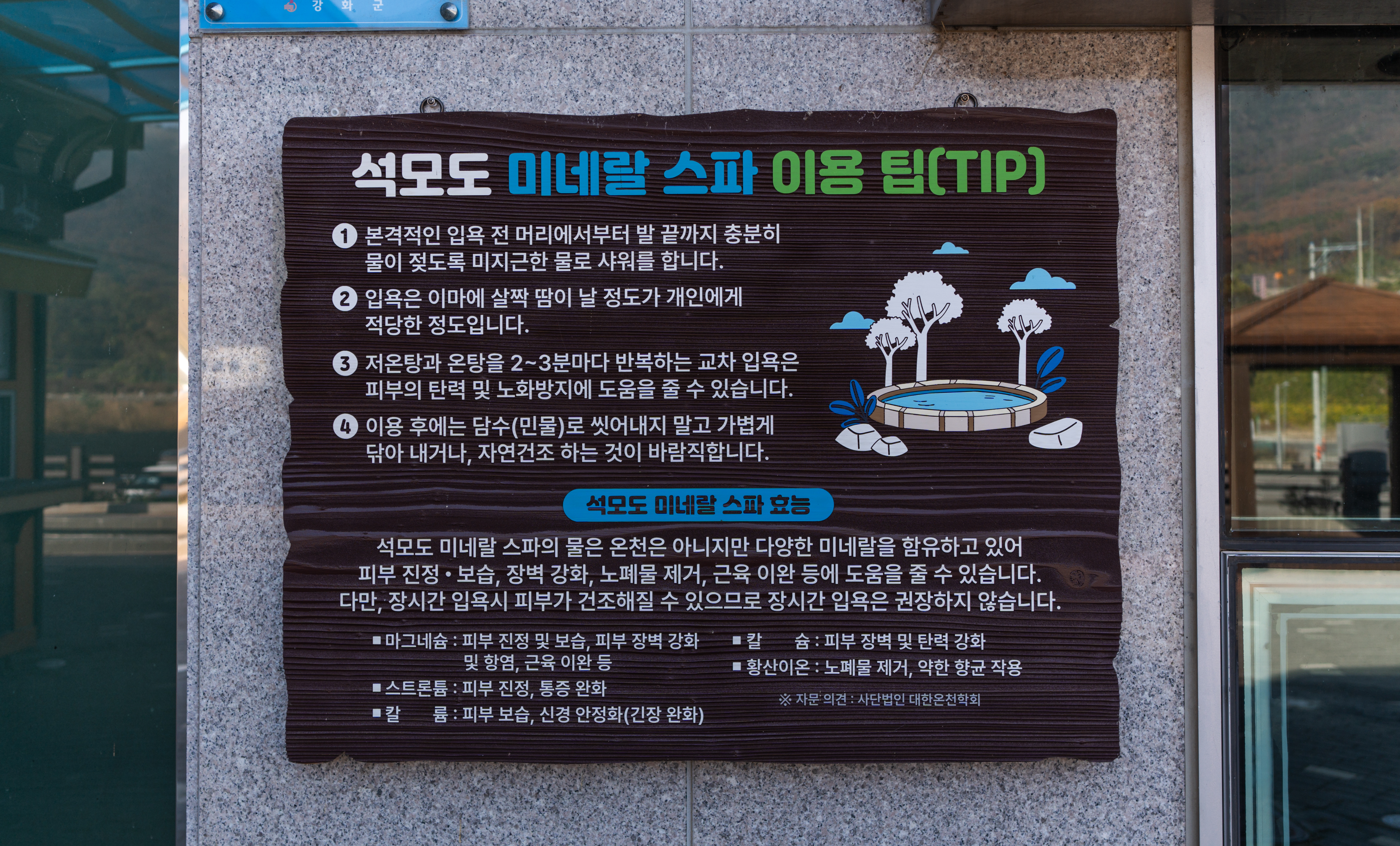 석모도의 유명한 온천인 미네랄 스파 이용 방법은 머리끝부터 발끝까지 충분히 물에 젖도록 샤워를 한 뒤, 온천을 이용합니다. 저온탕과 온탕을 번갈아가며 입욕을 하면 피부의 탄력 및 노화방지에 도움이 된다고 합니다. 이용후에 담수로 씻어내지 않고 자연건조 하는 것을 추천하고 있었습니다.