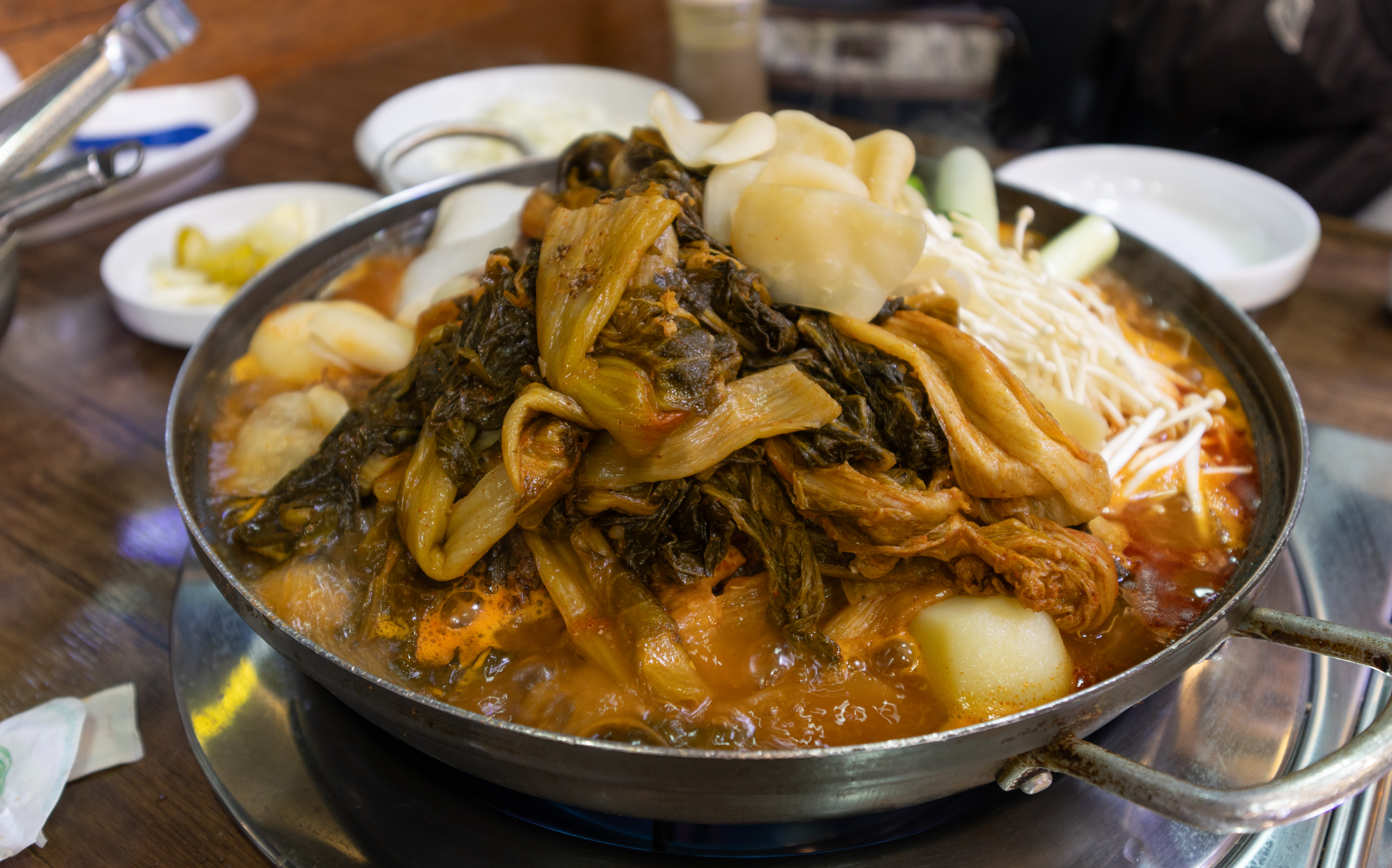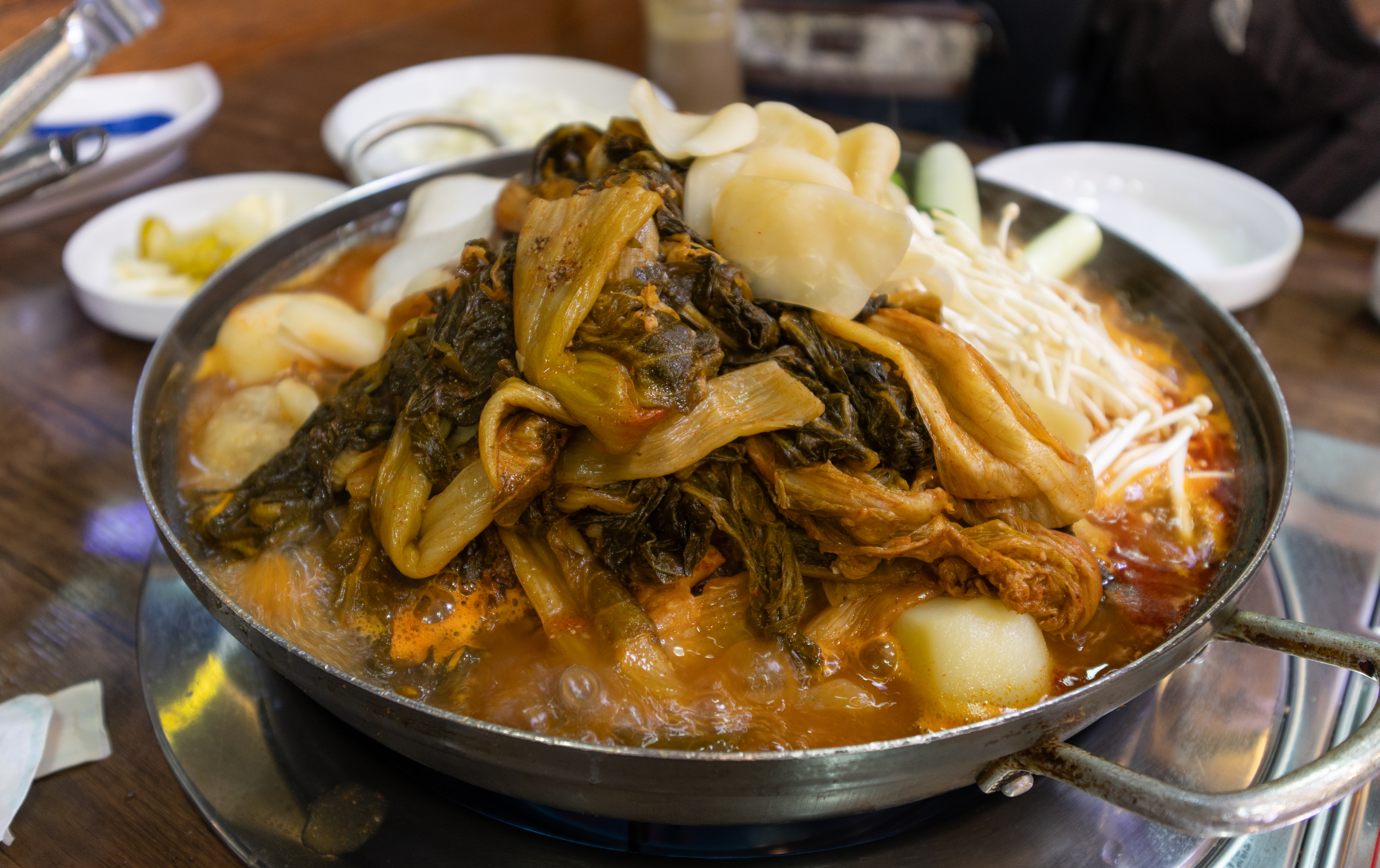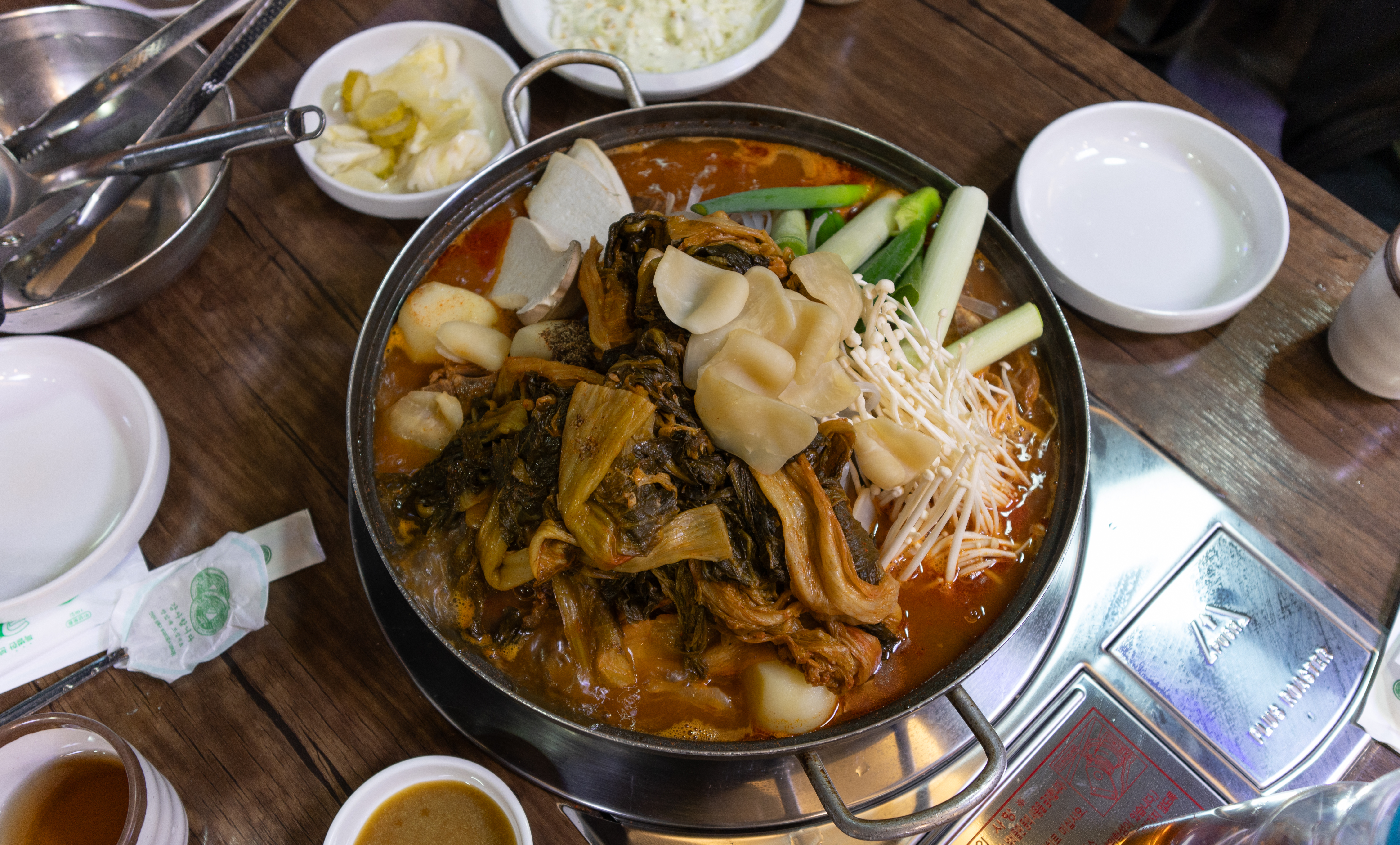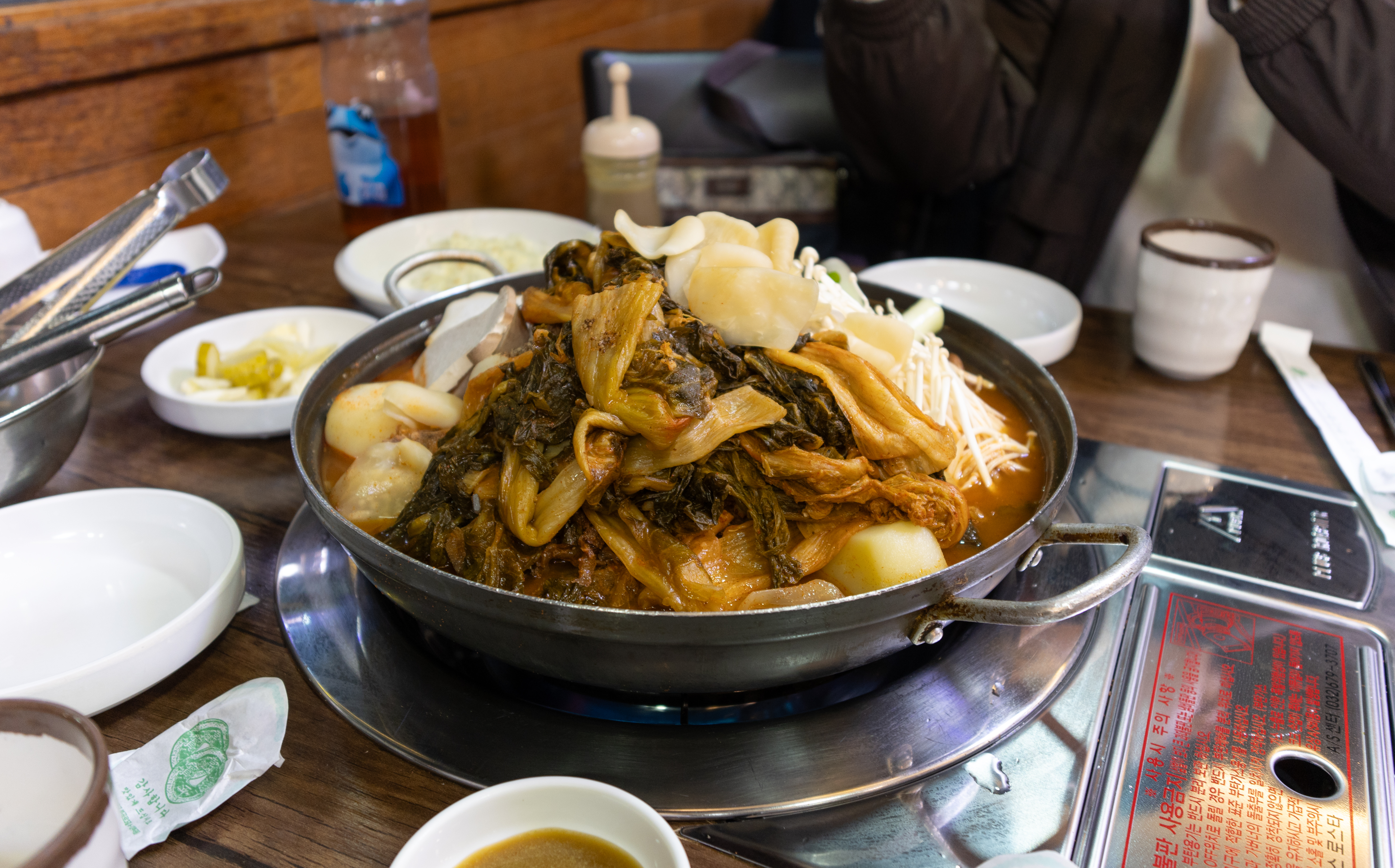 마곡동 신촌감자탕해물뼈찜의 우거지감자탕(토종감자탕) 대 자의 모습입니다. 피클, 샐러드, 양파, 깍두기 등이 나왔습니다. 감자탕에는 버섯과 감자, 떡 등이 들어있었고, 우거지도 꽤나 넉넉히 들어가 식감도 좋았고 맛도 좋았습니다.