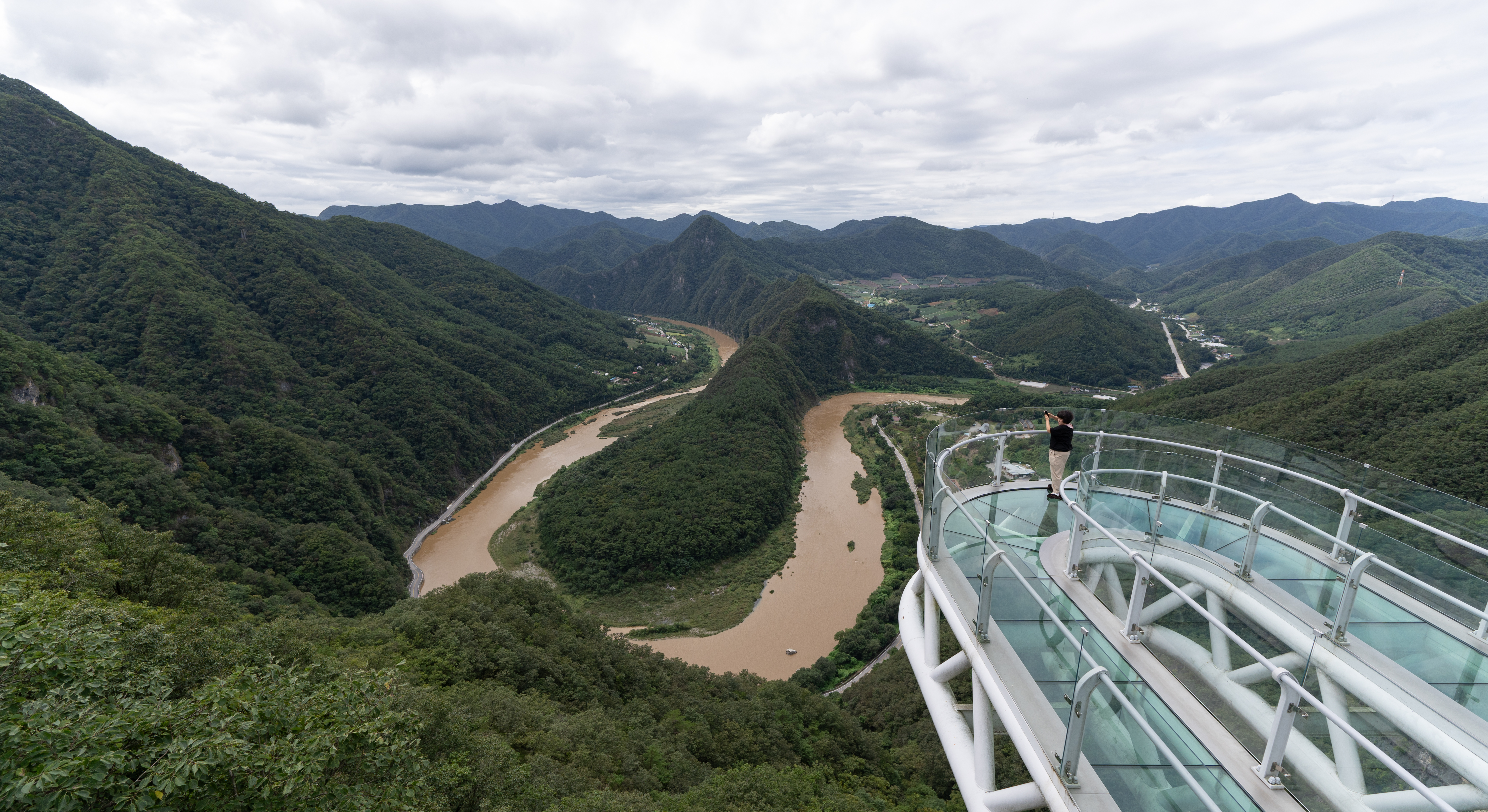 병방치스카이워크에는 덧신을 신고 입장하게 되어있었습니다. 이곳은 해발 583m 에 위치한 스카이워크로, 건너편 한반도 모양의 밤섬을 180° 둘러 흐르는 동강의 모습을 내려다볼 수 있는 전망대였습니다.