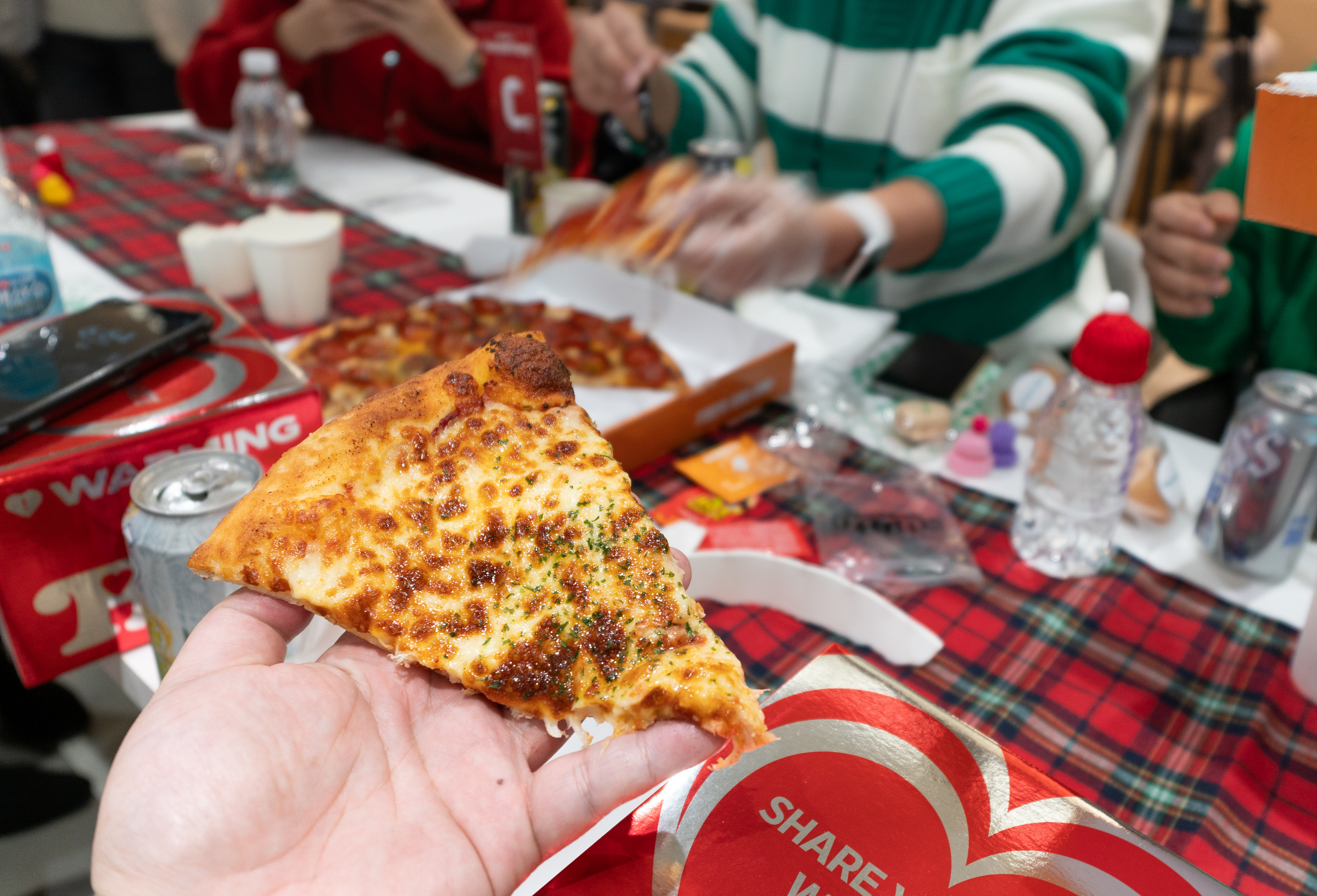 트립홀릭 페어웰 파티에는 다양한 종류의 이쁘고 먹음직스러운 핑거푸드가 준비되어 있었습니다. 여기어때에서 준비한 음식들 하나하나가 다 맛있어서 같은 조원 분들은 두 번씩 드시더라고요. 이어서 테이블마다 피자도 제공되었습니다. 스티커 교환에 이은 피자교환까지 페퍼로니 피자를 더 좋아하긴 하지만, 치즈피자도 좋아하니 다른 조의 피자와 교환해서 먹었습니다.