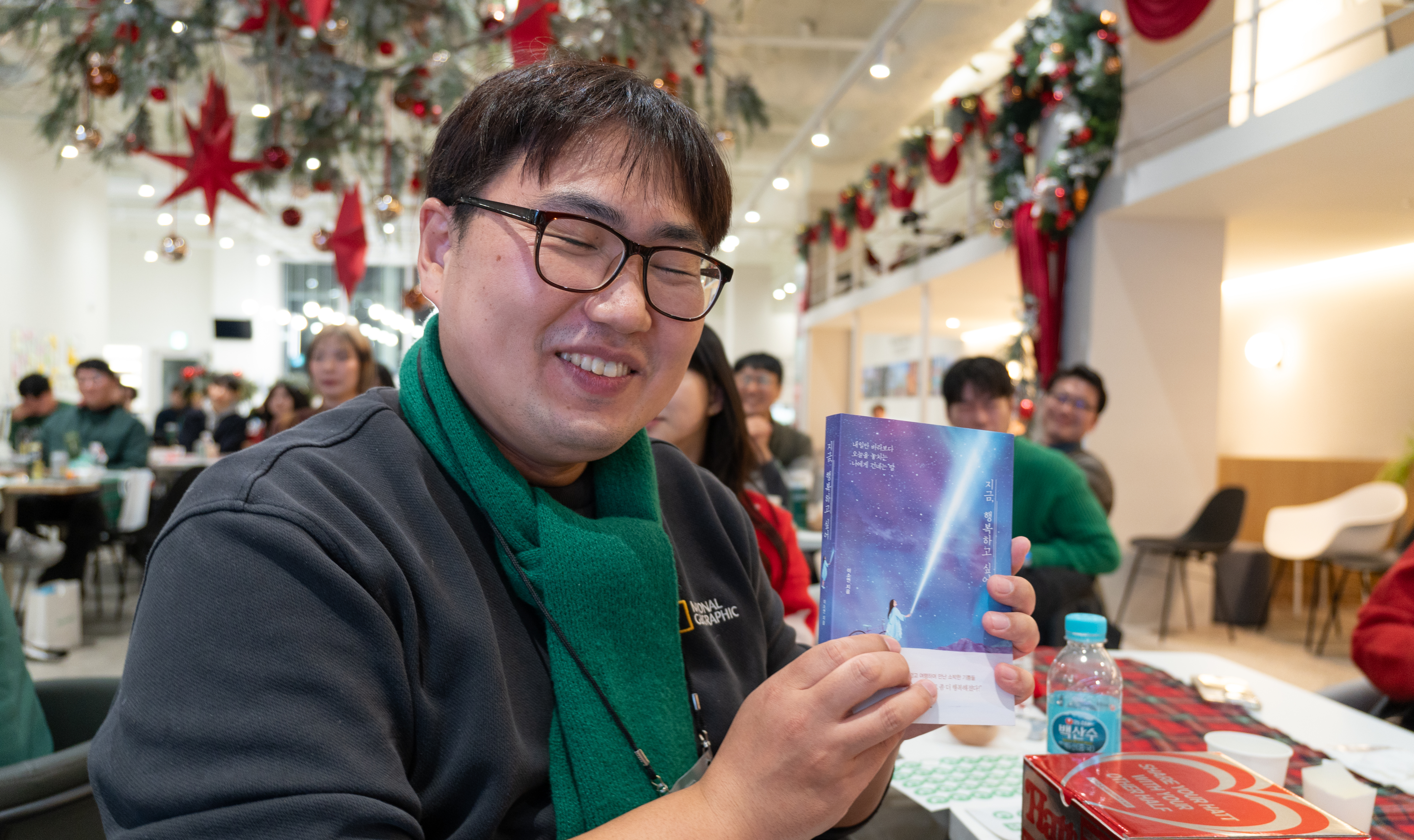 유튜버 쏘이님과 저와 같은 C조의 조원인 '보라돌이23'님 그리고 다른 트립홀릭 멤버들인 '서울갈매기v', '언럭키전기과'님의 단체사진 시간입니다. 선물 증정도 있었는데요. 그 선물은 쏘이님이 쓴 '지금 행복하고 싶어'라는 여행 에세이였습니다.