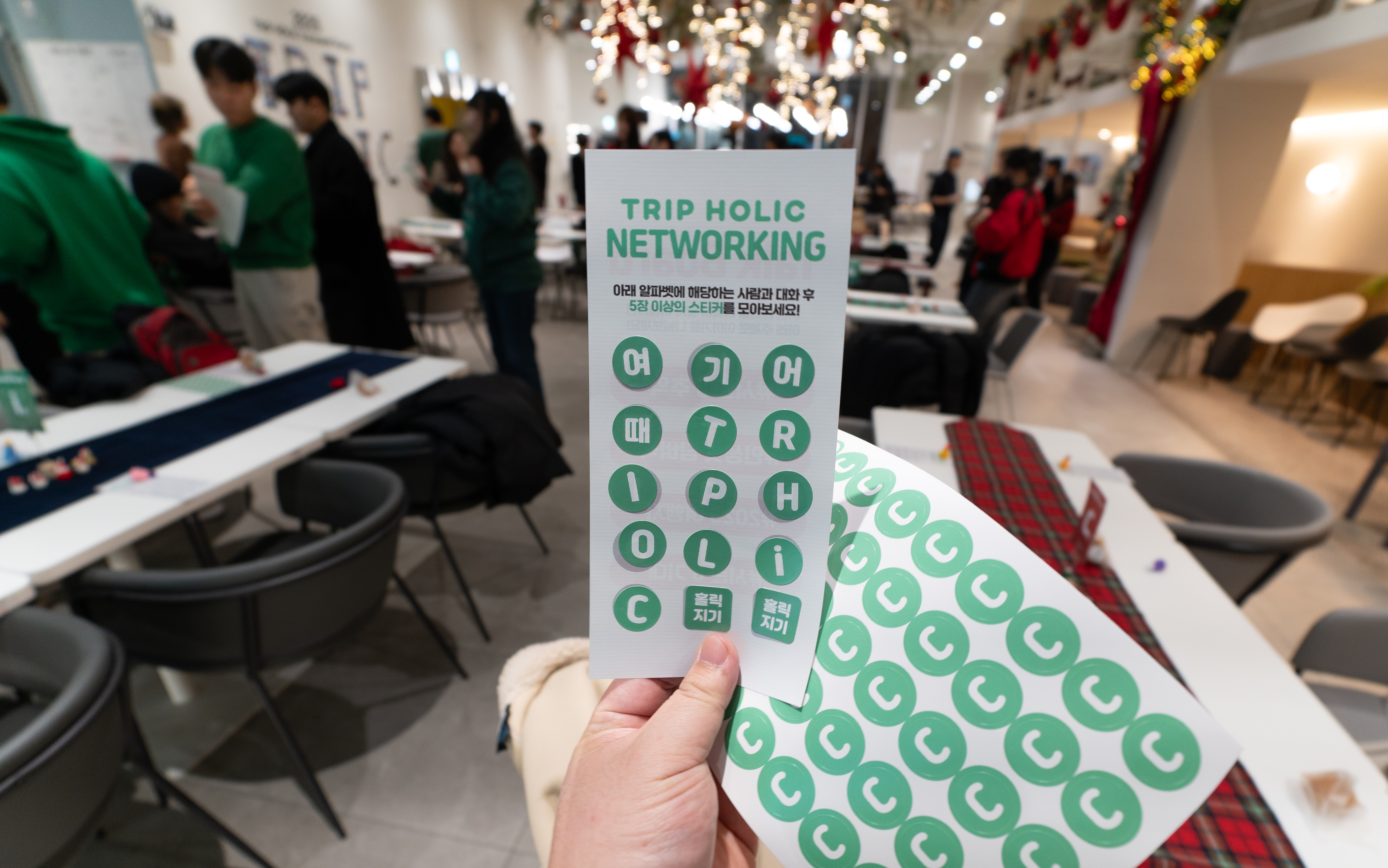 네트워킹 시간에는 각자 받은 스티커와 모음판에 여, 기, 어, 때, T, R, I, P, H, O, L, i, C, 홀릭지기*2 까지 총 15개의 스티커를 모아오면 되었습니다. 그래도 페어웰 파티에 참석한 저 역시 저희 'C조'의 스티커를 가지고 있었기에 C 스티커는 이미 붙인 상태에서 시작했습니다.