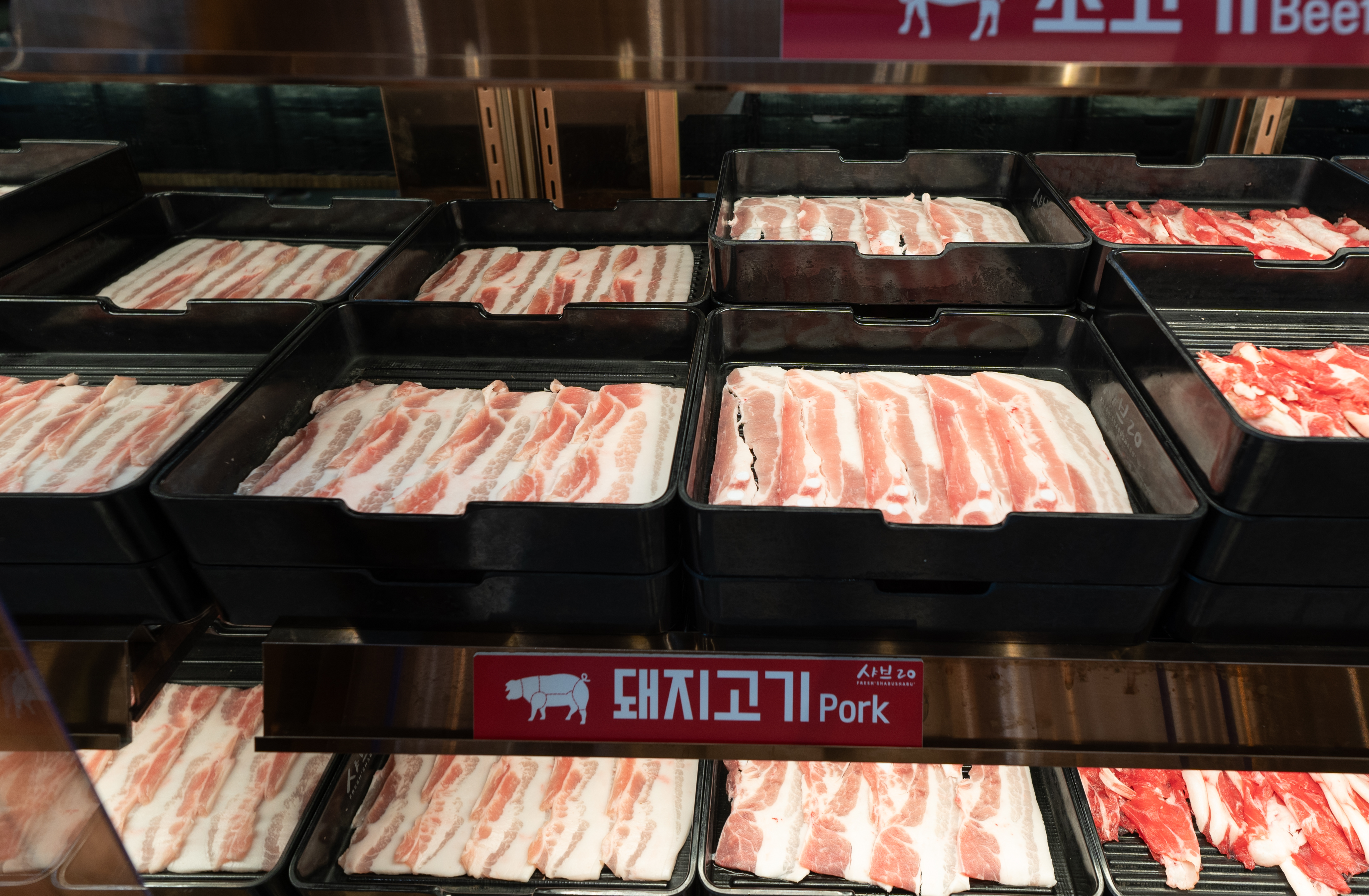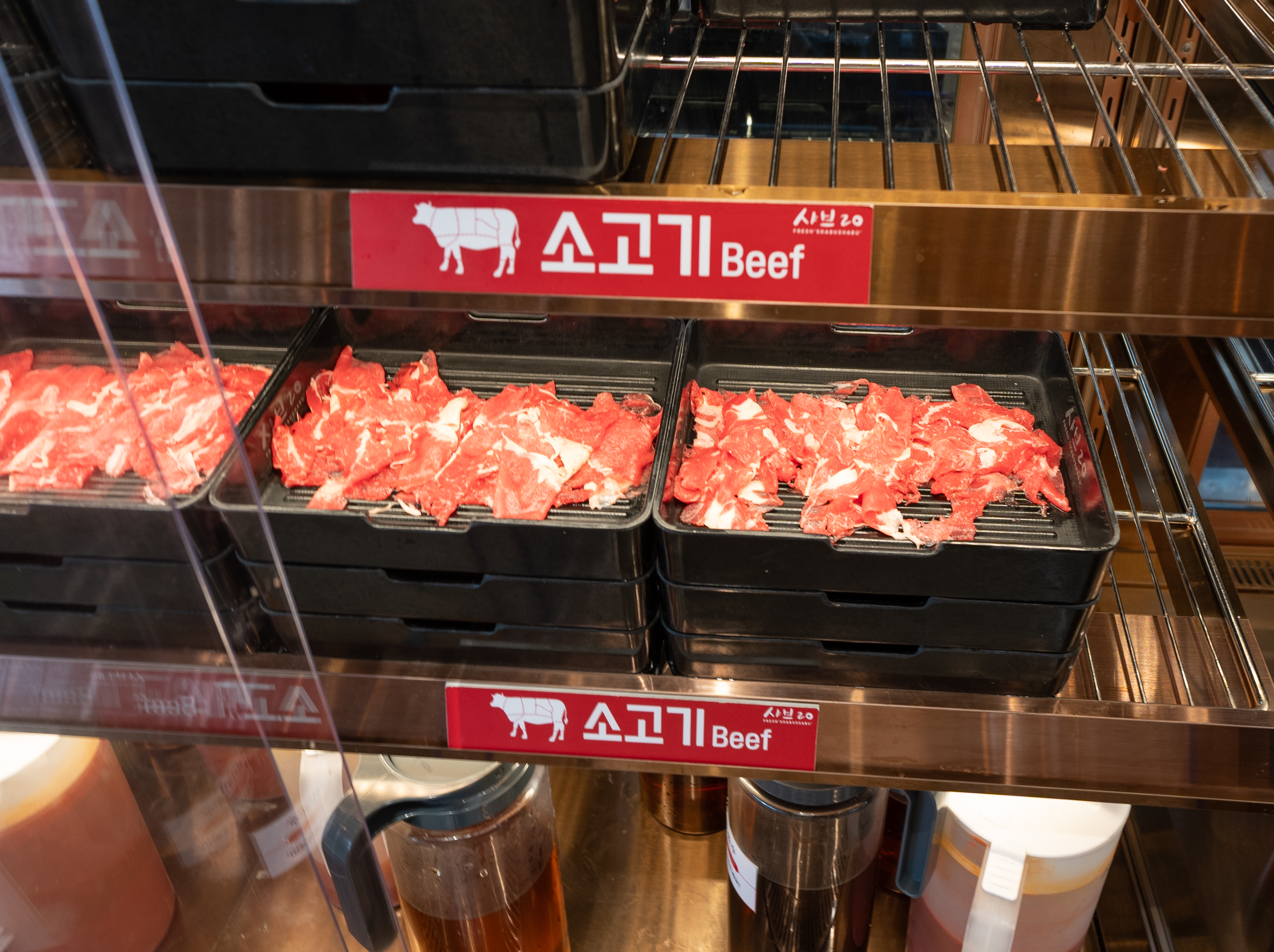 샤브20 송파감일점의 메뉴는 일단 고기가 중요합니다. 이곳은 고기냉장고와 육수냉장고를 함께 사용하고 있었는데, 소고기가 특히 냉동이 아니라 맛이 좋았습니다. 보통 샤브샤브 무한리필 가게에 가면 냉동 소고기를 사용해 국물에 이물질이 많이 뜨곤 하는데, 샤브20의 돼지고기와 소고기 모두 생고기 형태여서 비린맛도 없고 좋았습니다.
