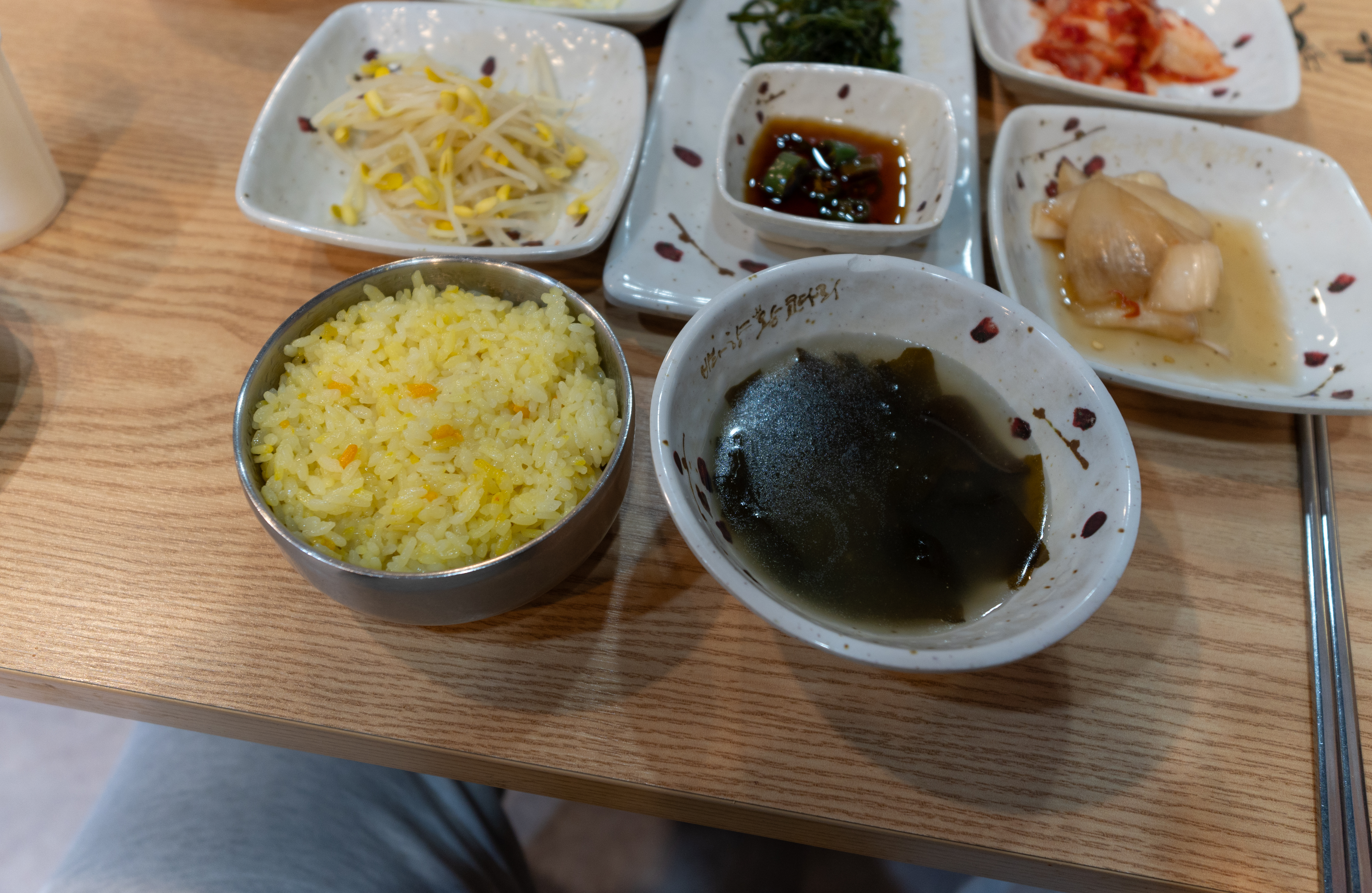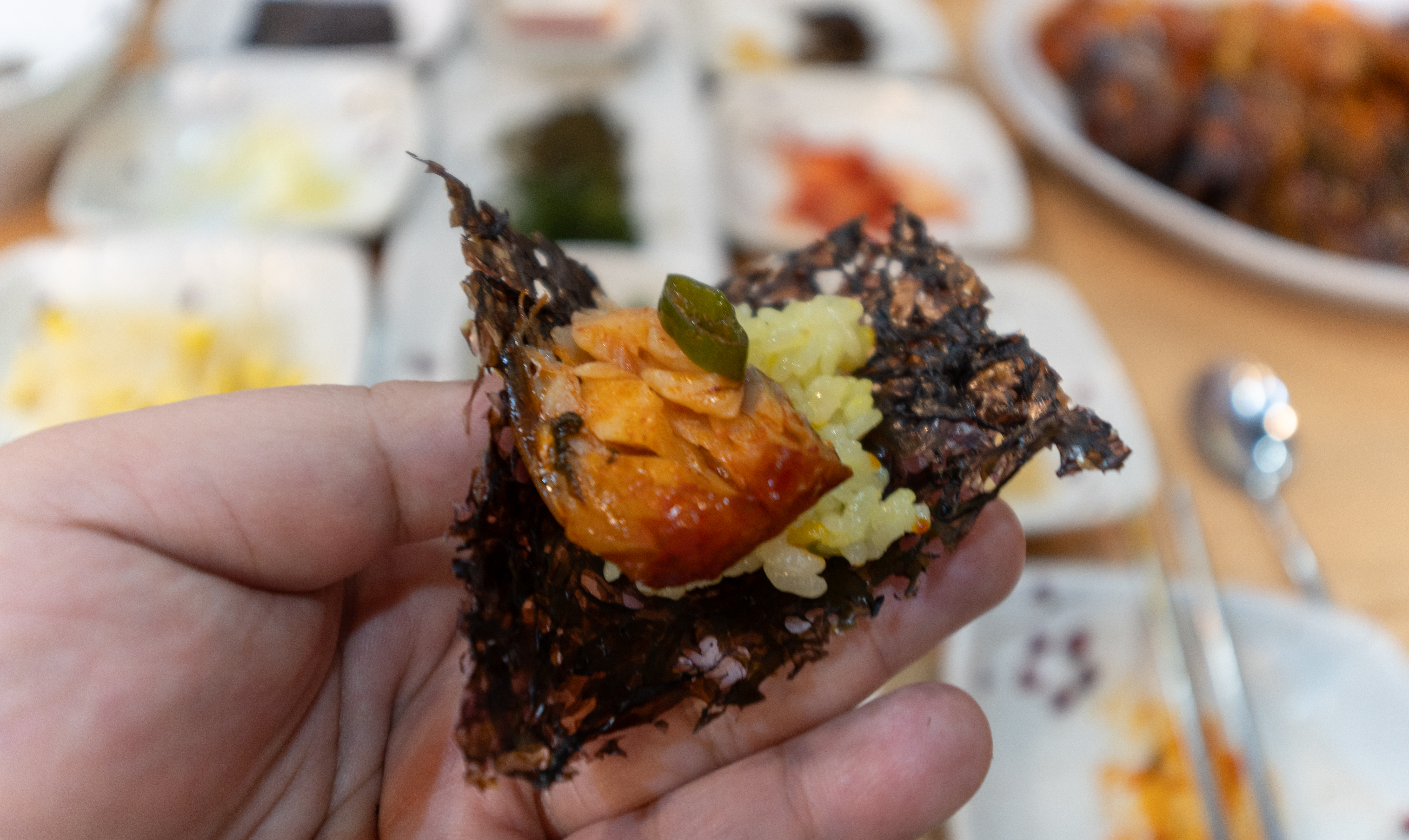 바다향왕코다리의 코다리조림에 시래기를 추가해서 먹었습니다. 기본 반찬으로 다양한 해조류와 콩나물, 샐러드, 목이버섯, 김치, 양파장아찌, 미역국 등이 나왔습니다.