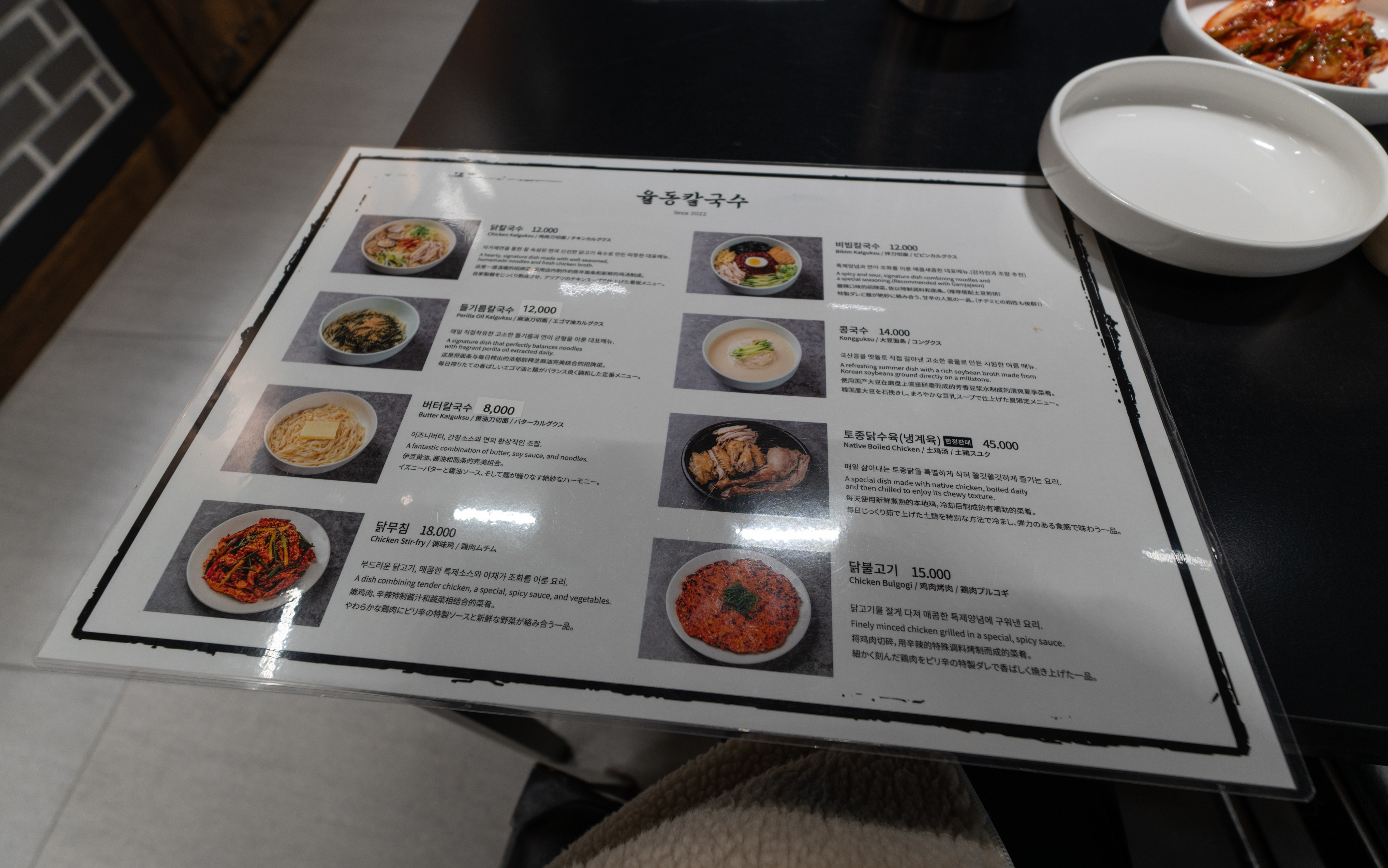 안국역 율동칼국수의 메뉴는 닭칼국수, 들기름칼국수, 버터칼국수, 닭무침, 비빔칼국수, 콩국수, 토종닭수육, 닭불고기, 닭전, LA갈비, 치킨, 고기만두, 해물파전, 감자전, 쑥갓무침 등이 있었습니다. 저는 버터칼국수가 궁금했기 때문에 버터칼국수에 고기만두를 곁들여 먹었습니다.