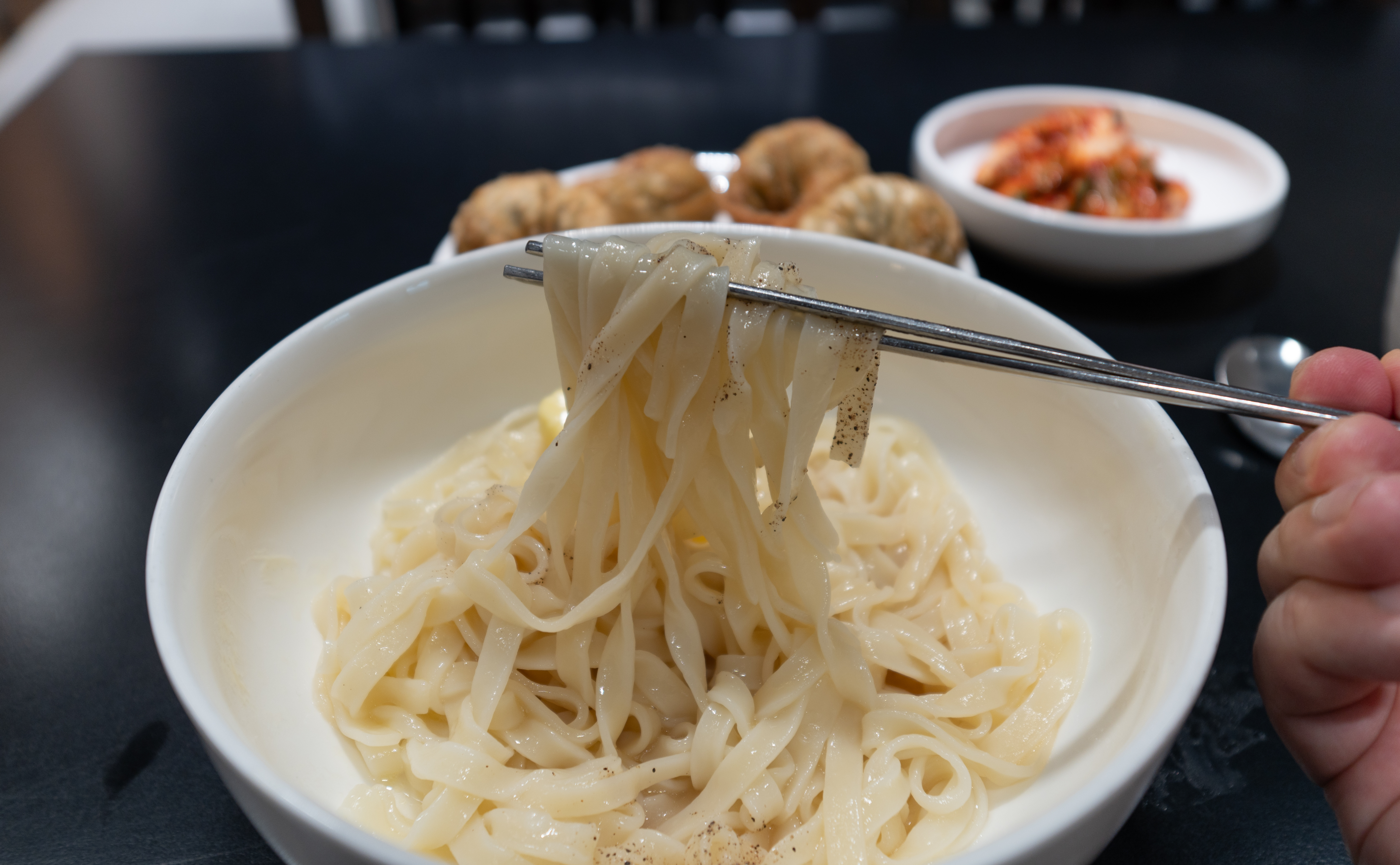 버터칼국수는 사실 어떤 맛일지 궁금하고 기대가 많이 되면서도, 대략 어떤 맛일지 예상이 되기도 했었습니다. 집에서 입맛 없을 때 버터나 간장 넣고 비벼 먹는 느낌과 비슷하다고 할 수 있는 메뉴였습니다. 부드러운 식감의 면에 은은한 간과 버터의 고소한 풍미와 향이 배어 맛이 의외로(?) 괜찮았습니다.