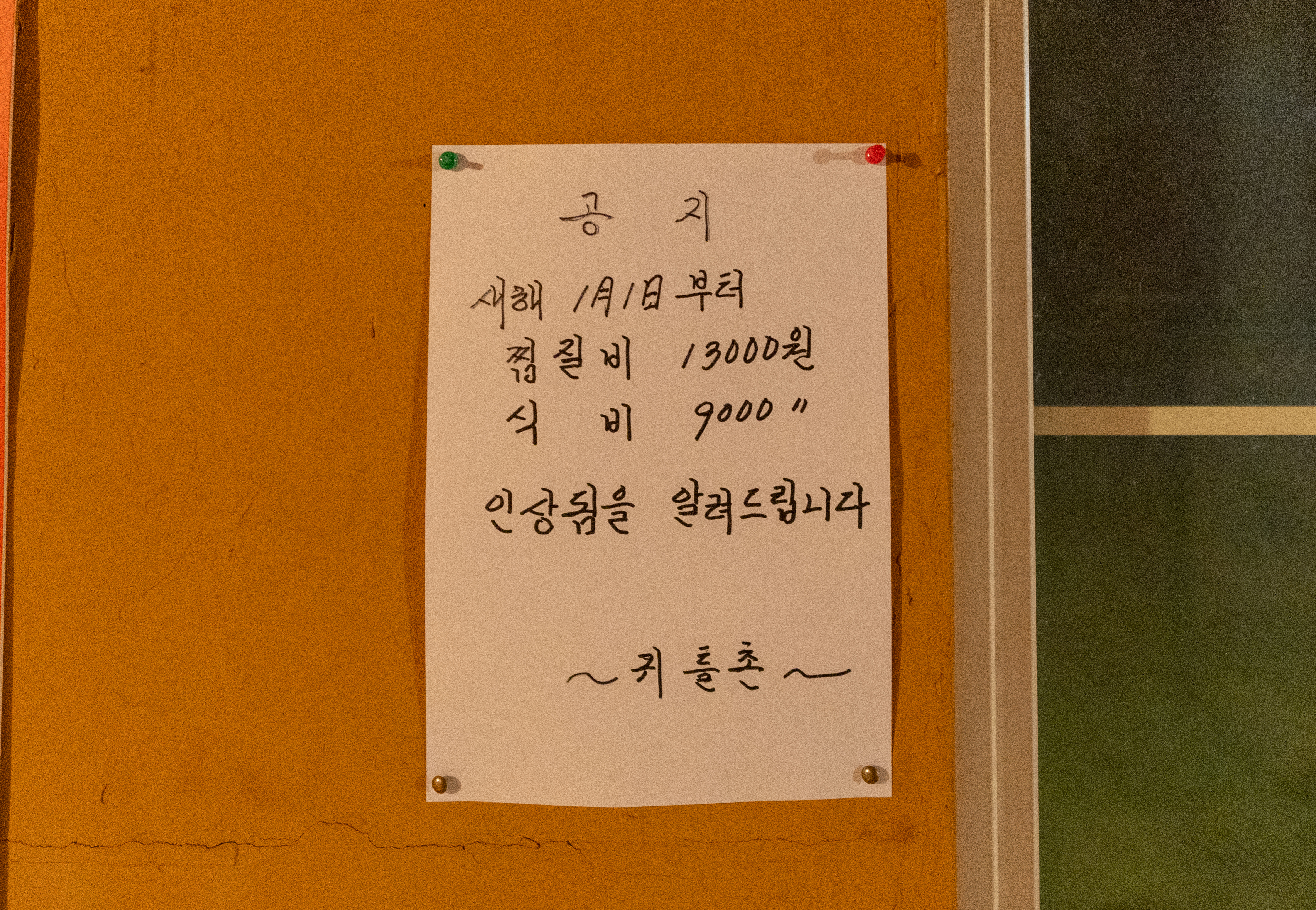 춘천의 귀틀촌 찜질방의 이용요금이 2026년 1월 1일부터 찜질비 13,000원, 식비 9,000원으로 1,000원씩 인상 될 예정이라고 합니다. 이용에 참고하시기 바랍니다.