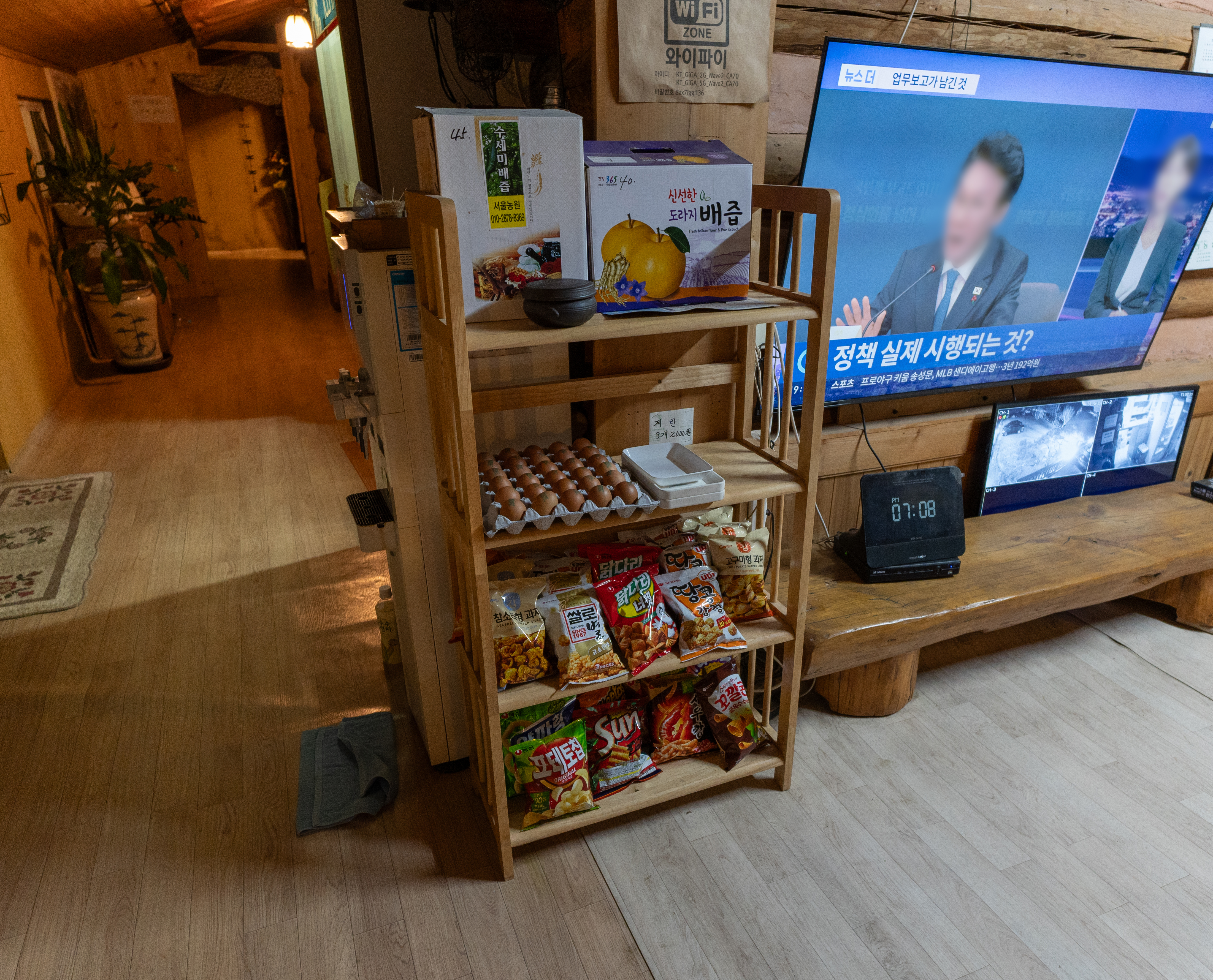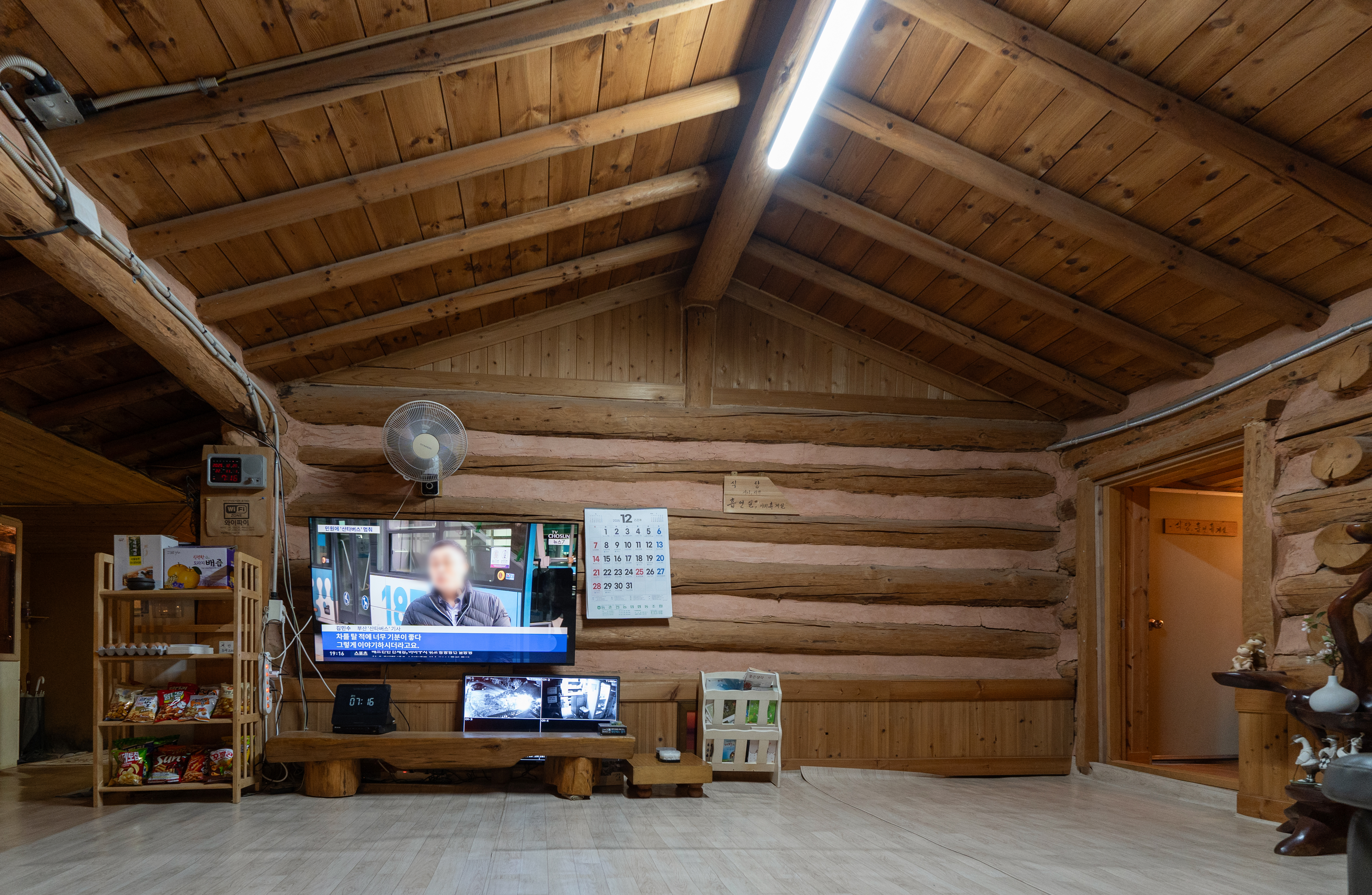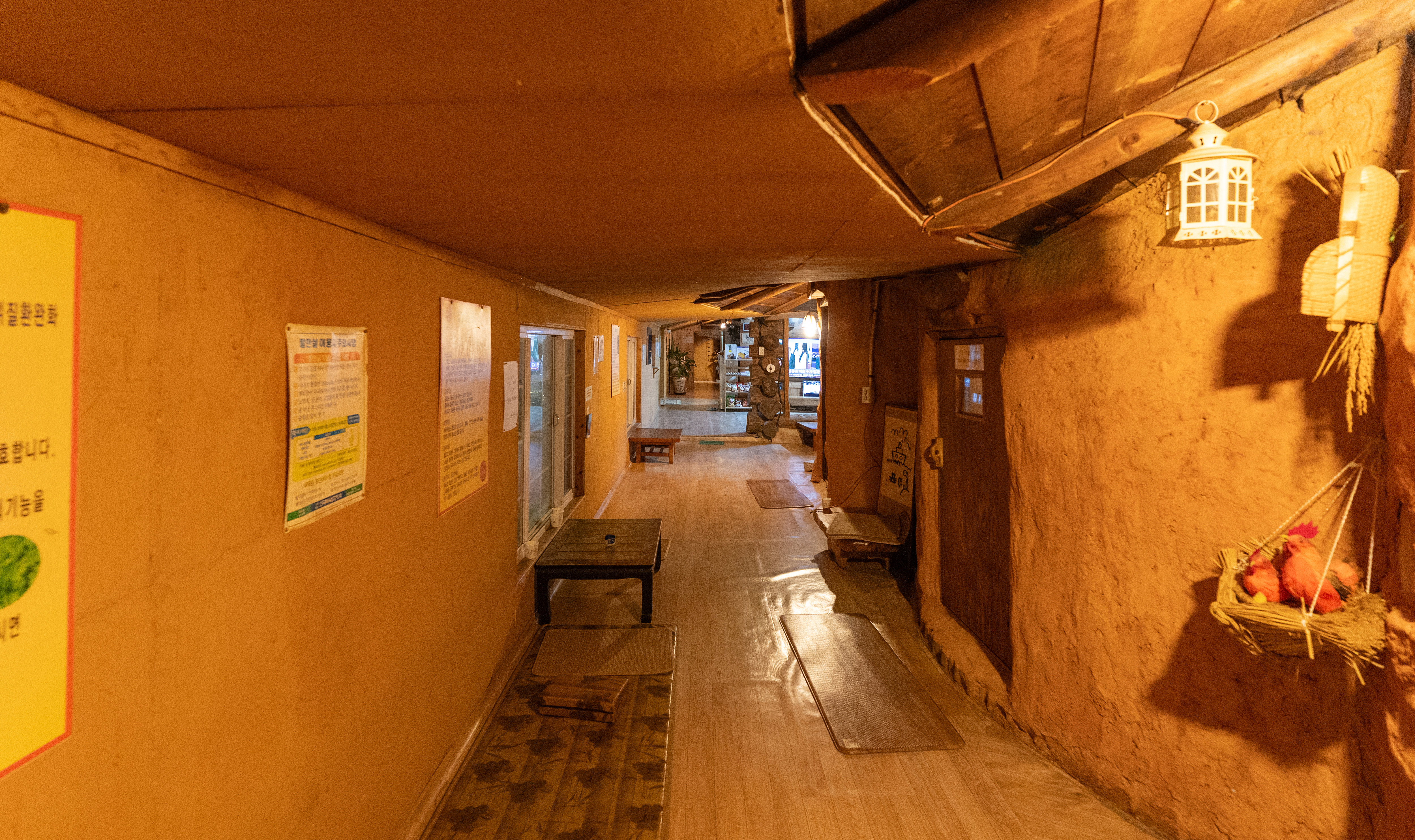 찜질방은 기다란 복도가 있었고, 가운에 큰 거실 같은 공간이 있어 TV 시청을 할 수 있었습니다. 이곳은 주로 사장님 부부가 머무르시는 공간이었는데, 사장님이 친절하셔서 편리하게 이용할 수 있었습니다.