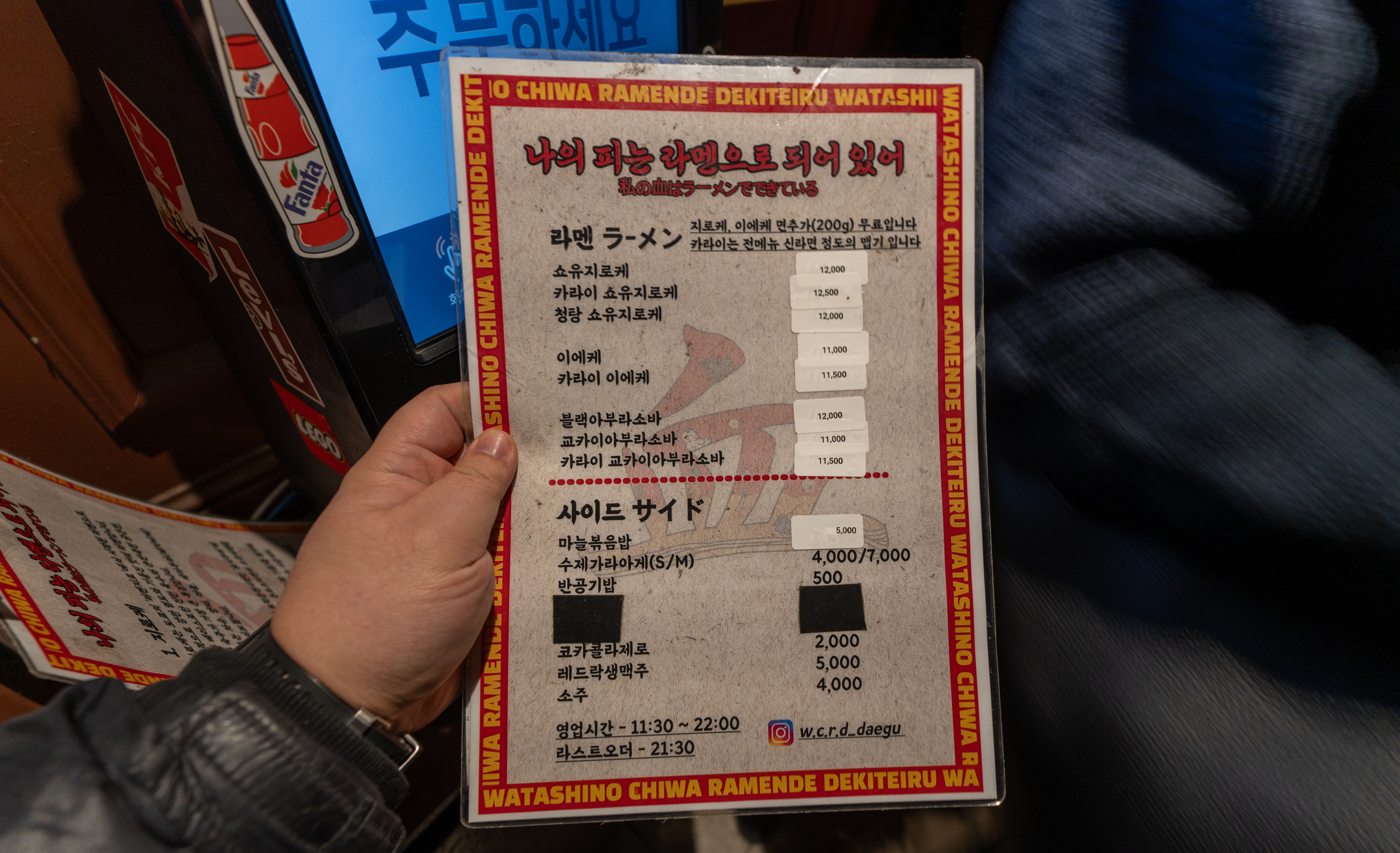 대구 나의피는라멘으로되어있어(WCRD) 가게는 대구 중구 공평동 70, 1층에 위치해 있었습니다. 'WCRD' 의 뜻이 궁금했었는데, 가게의 캐노피에서 그 의미를 확인할 수 있었습니다. 'Watashino Chiwa Ramende Dekiteiru' 의 약자로 굳이 번역을 안 해도 그 뜻을 이해할 수 있었습니다.
