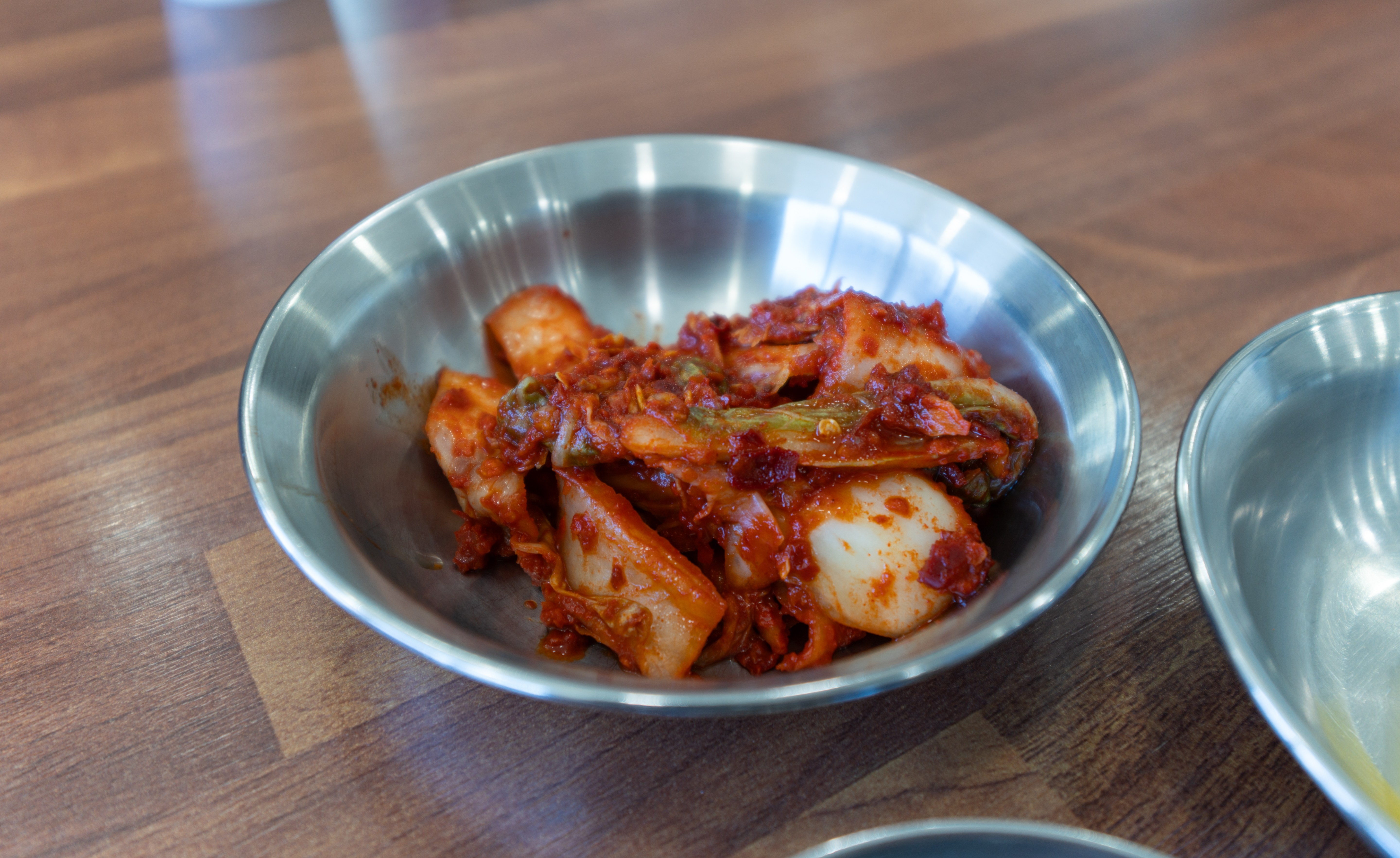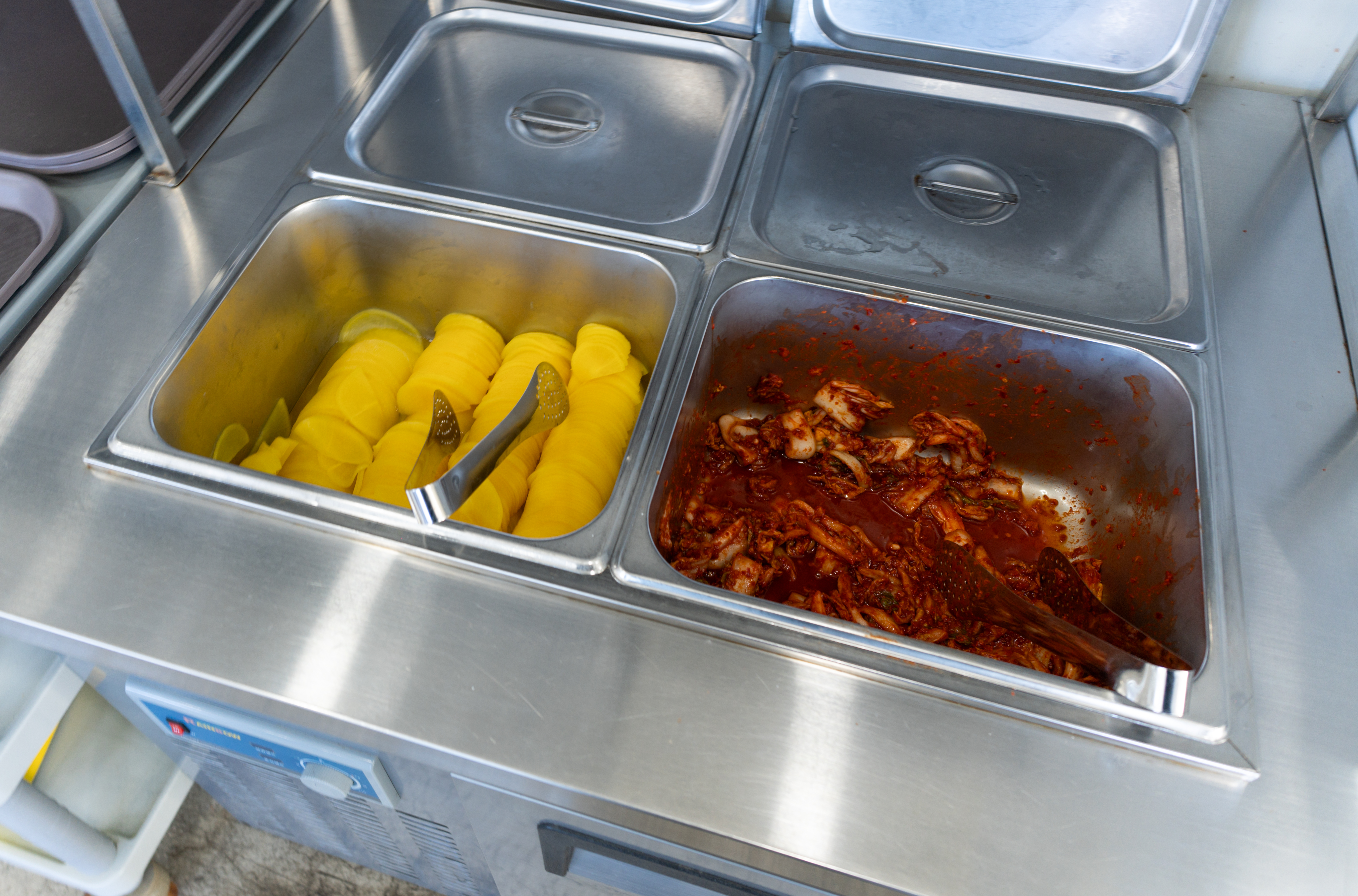 호계동 언양닭칼국수의 메뉴는 닭칼국수, 닭곰탕, 언양식칼국수, 쫄깃만두, 곱빼기가 있었습니다. 셀프코너에는 단무지와 배추김치가 있었고, 이곳의 배추김치는 매운 양념으로 유명하더라고요.