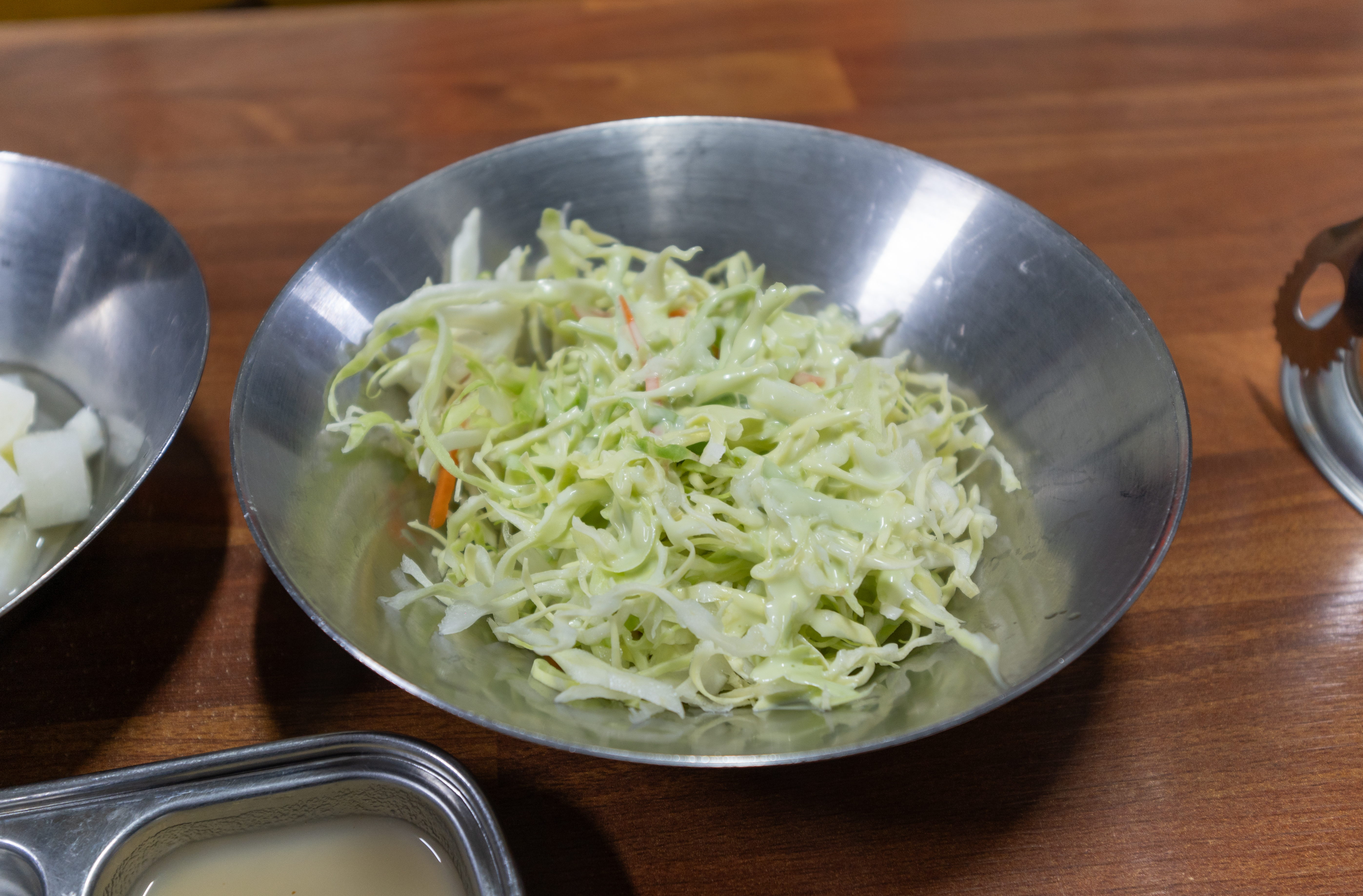 사천 미래통닭의 반반치킨에는 키위드레싱을 한 양배추 샐러드와 직접 담근듯한 치킨무 그리고 소금과 마늘소스가 함께 제공되었습니다. 현지인 맛집이라고 해서 사실 많이 기대하고 방문하긴 했는데요, 결론부터 말씀드리자면 제 입맛과는 잘 맞지 않았습니다. 그 이유는 이어지는 내용에서 소개해드리겠습니다.