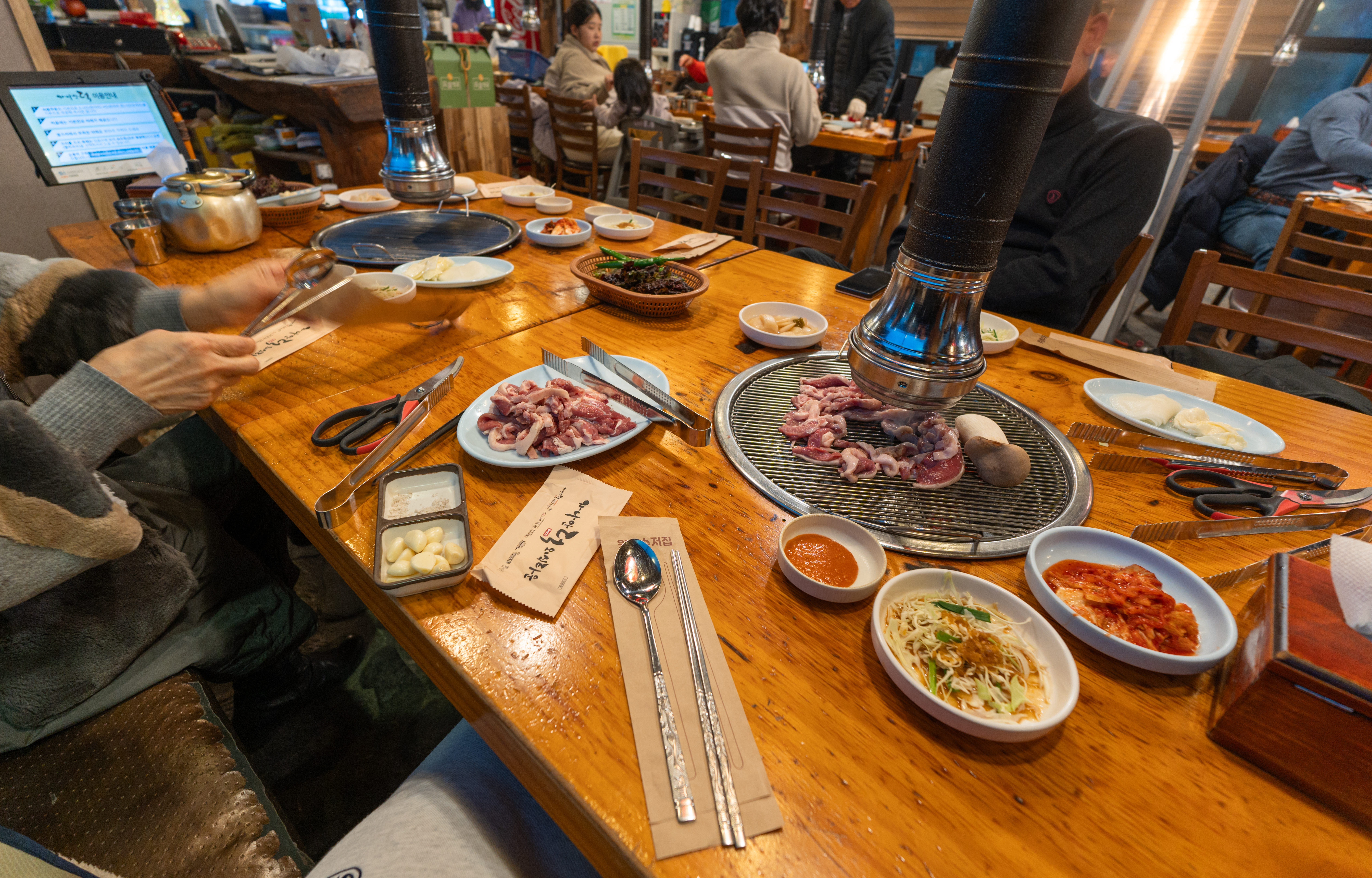 가나안덕의 오리고기를 주문하고 굽기 시작했습니다. 기본적으로 오리고기와 새송이버섯이 함께 제공되고 있으며, 반찬은 김치, 마늘, 양배추샐러드, 양파장아찌, 쌈채소, 쌈장이 나왔습니다. 추가 반찬은 셀프바에서 직접 가져다먹을 수 있었습니다.