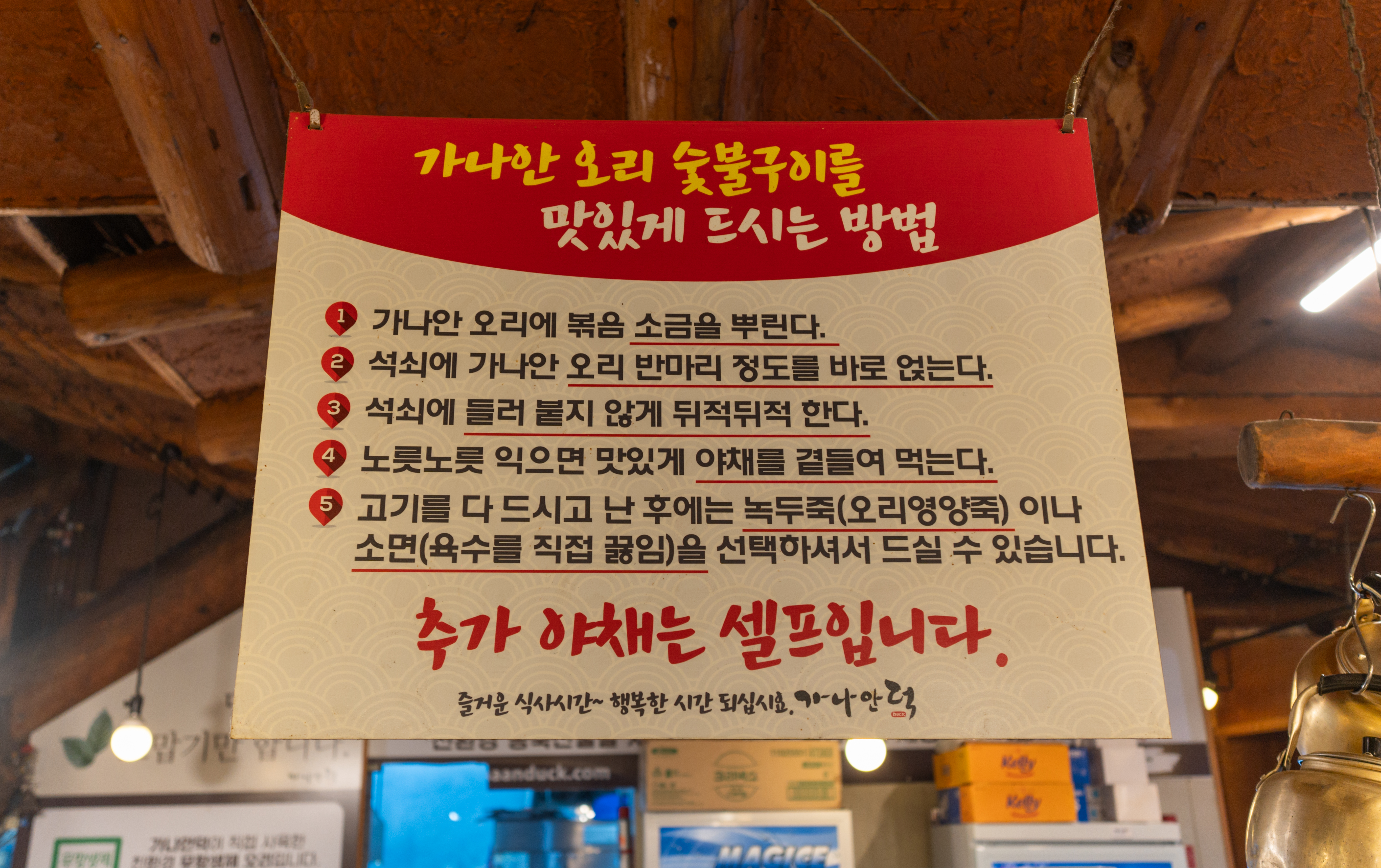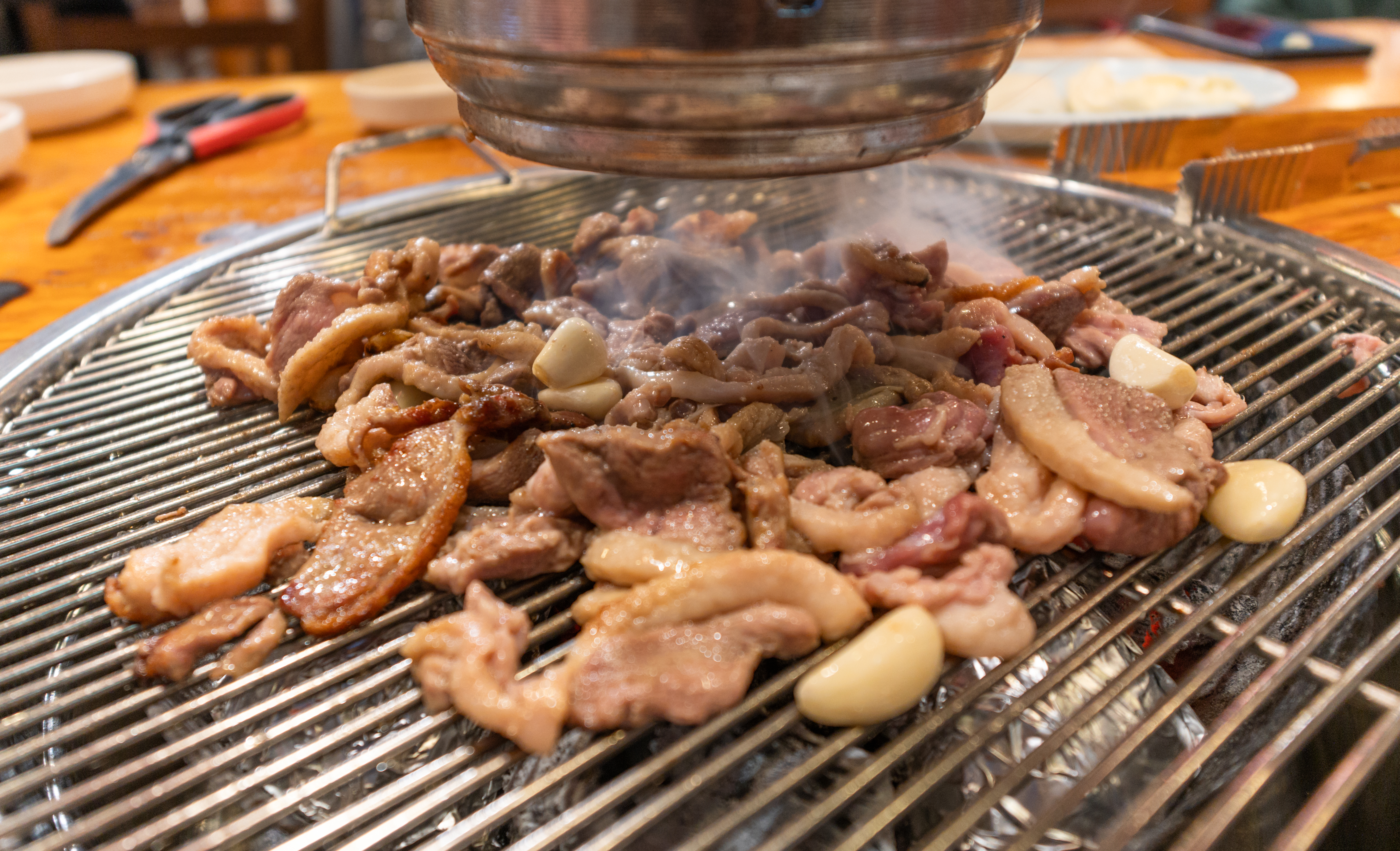 오리고기는 위와같이 절반정도씩 덜어내서 불판에서 구워주면 되었고, 저는 마늘과 함께 구웠습니다. 숯불에 구워 먹는 오리구이는 기름기도 쫙 빠져 좋았고, 훈제오리처럼 목초액 향이 나는 것도 아니어서 담백하게 먹을 수 있어서 좋았습니다.