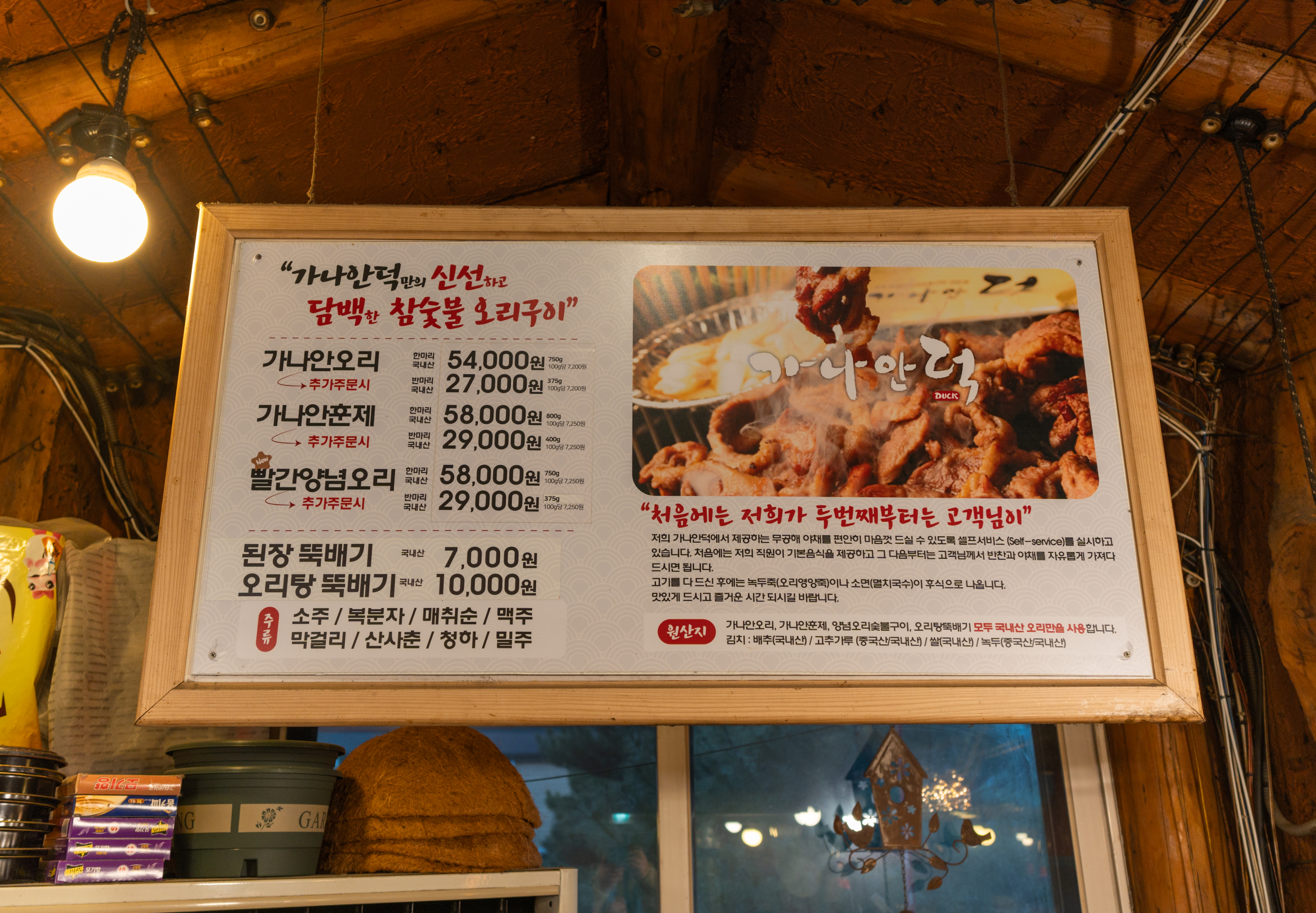 가나안덕의 메뉴는 이렇습니다. 가나안오리, 가나안훈제, 빨간양념오리, 된장뚝배기, 오리탕뚝배기가 있었습니다. 저희는 항상 기본 메뉴인 가나안오리를 즐겨 먹기 때문에 가나안오리 3마리를 주문했습니다. 메뉴 주문은 자리의 태블릿을 통해 주문하면 되었습니다.