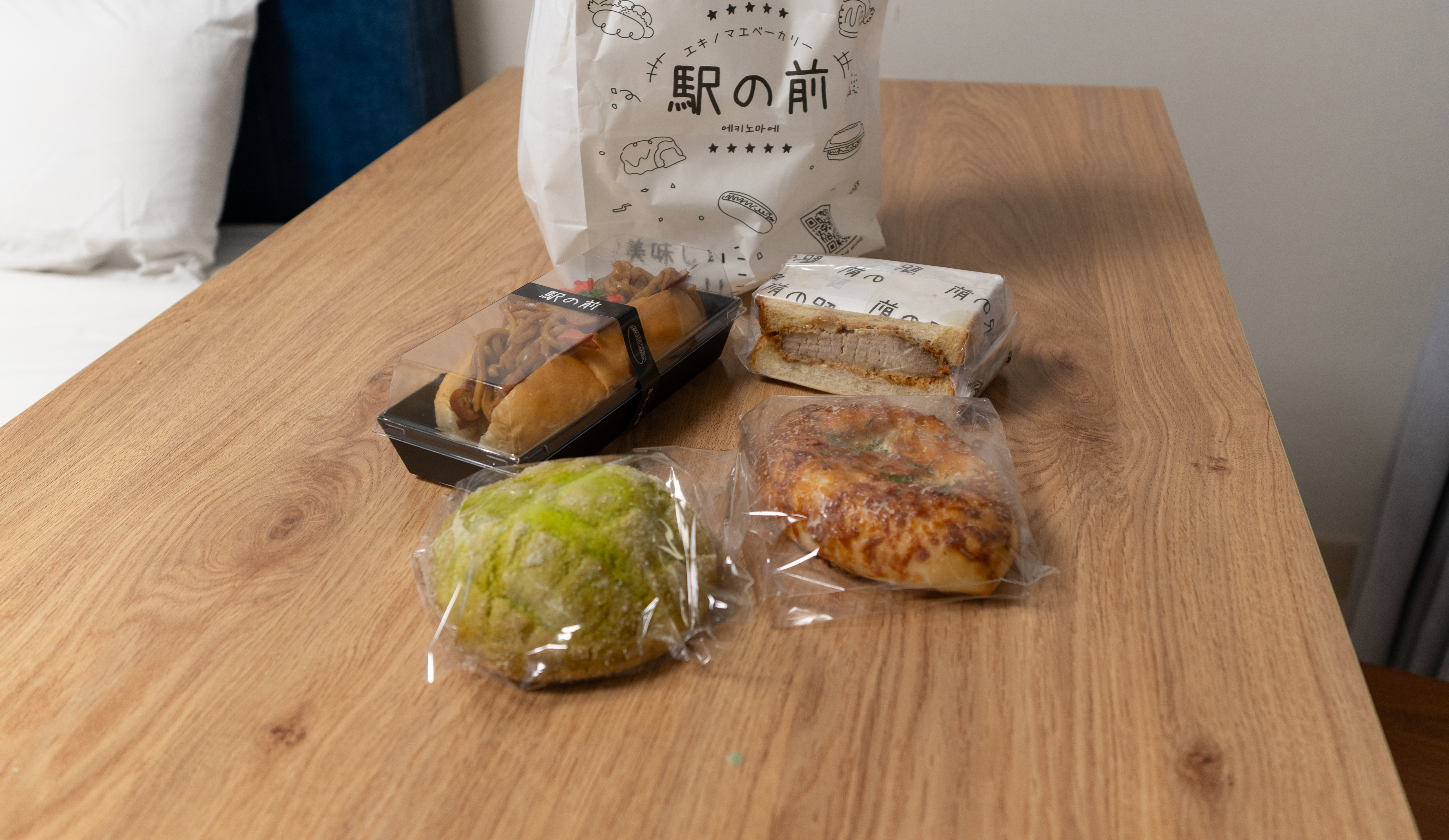 빵 종류도 다양하게 구비되어 있었는데요, 일본의 명물 멜론빵부터 소보루, 단팥빵, 모찌, 오렌지파운드, 소금빵, 카레빵, 고로케, 타마고산도, 카츠산도, 야키소바빵, 타코야끼빵, 맘모스빵, 푸딩 등이 있었습니다. 저는 카츠산도와 야키소바빵, 치즈감자샐러드빵, 멜론크림빵을 선택했습니다.