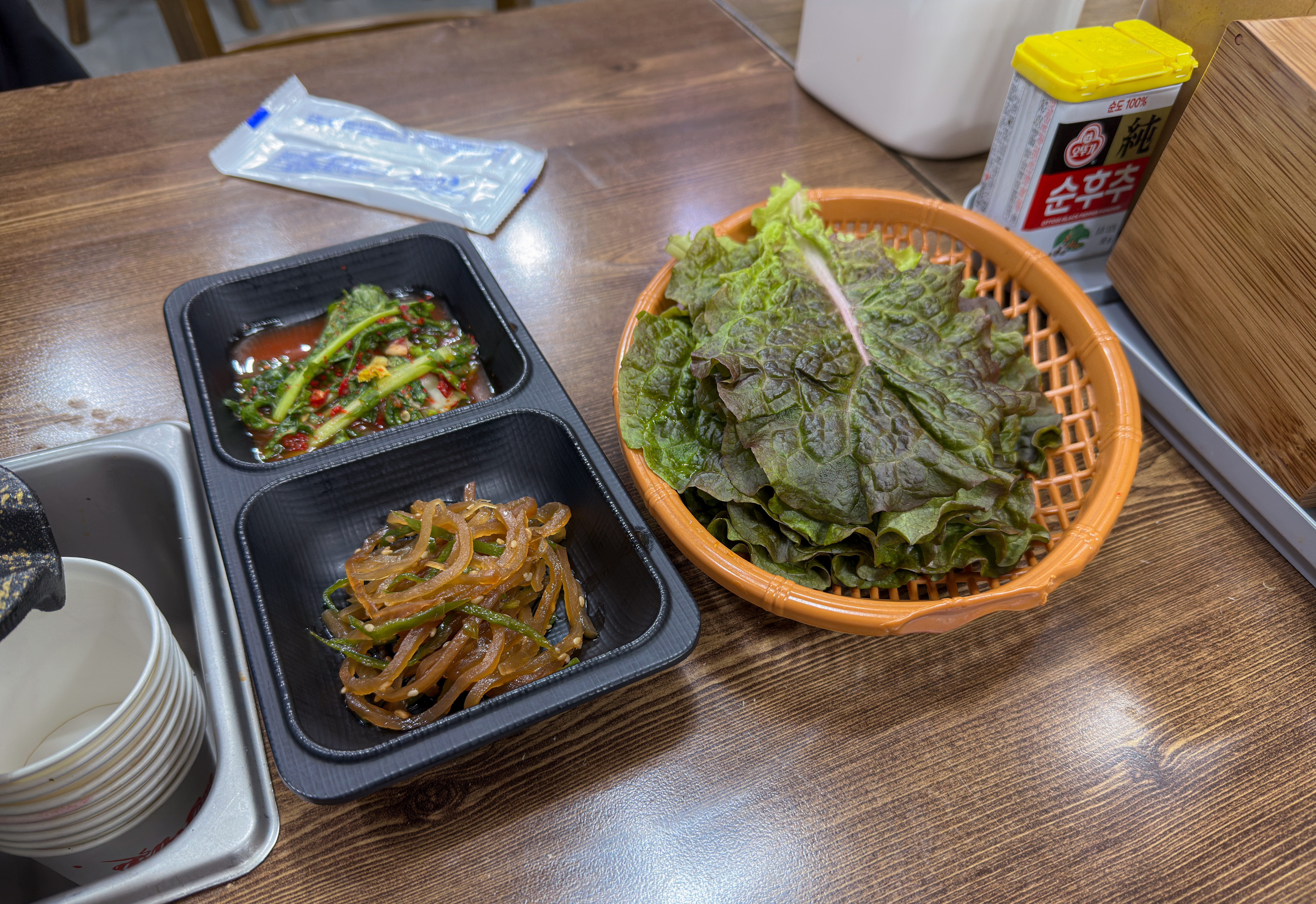 차돌식당은 애초에 테이블에 고기를 구울 수 있는 불판이 놓여 있었고, 메뉴를 주문하면 바로 마늘, 쌈장, 고추, 열무김치, 쌈채소 등을 제공하고 있었습니다.