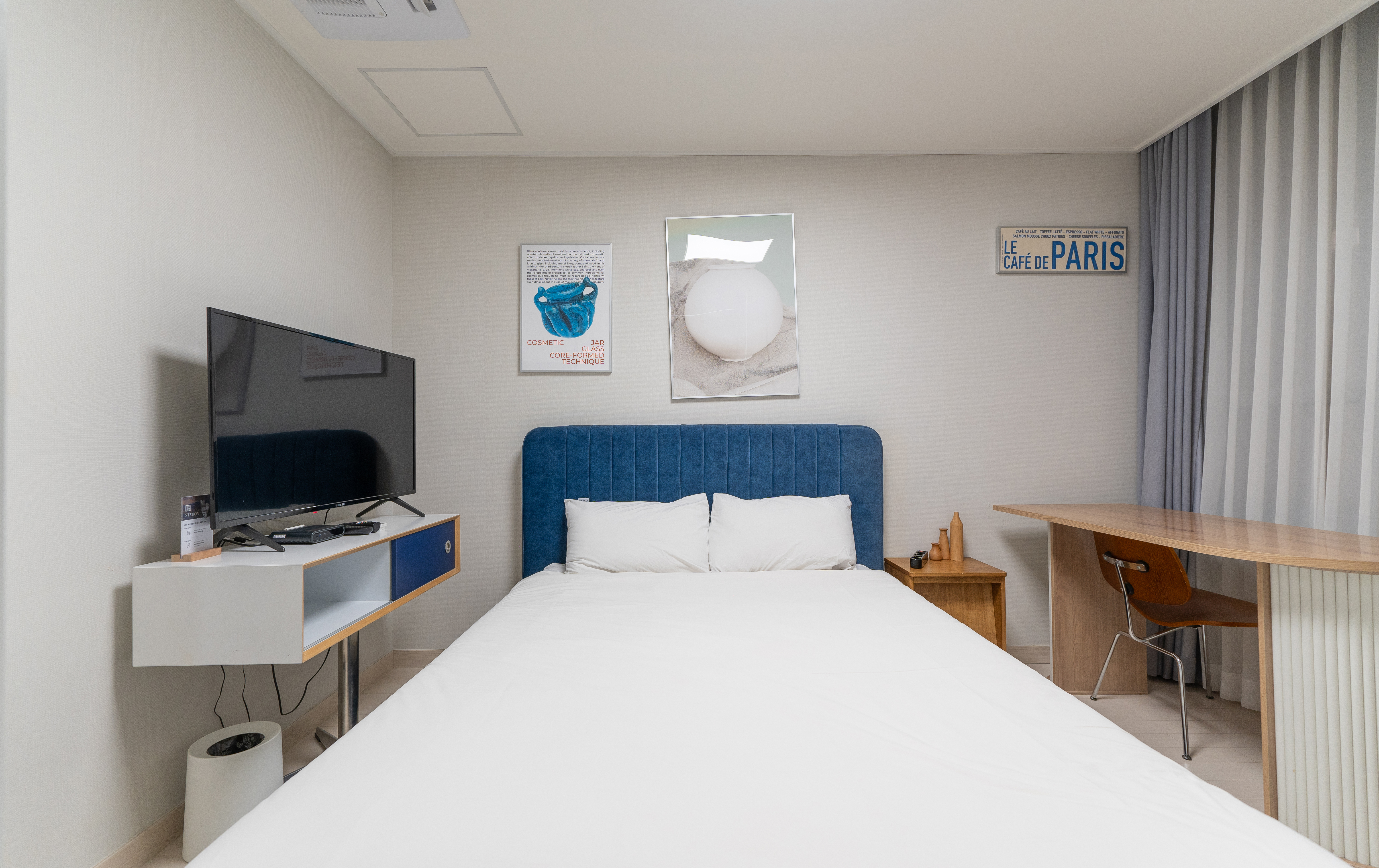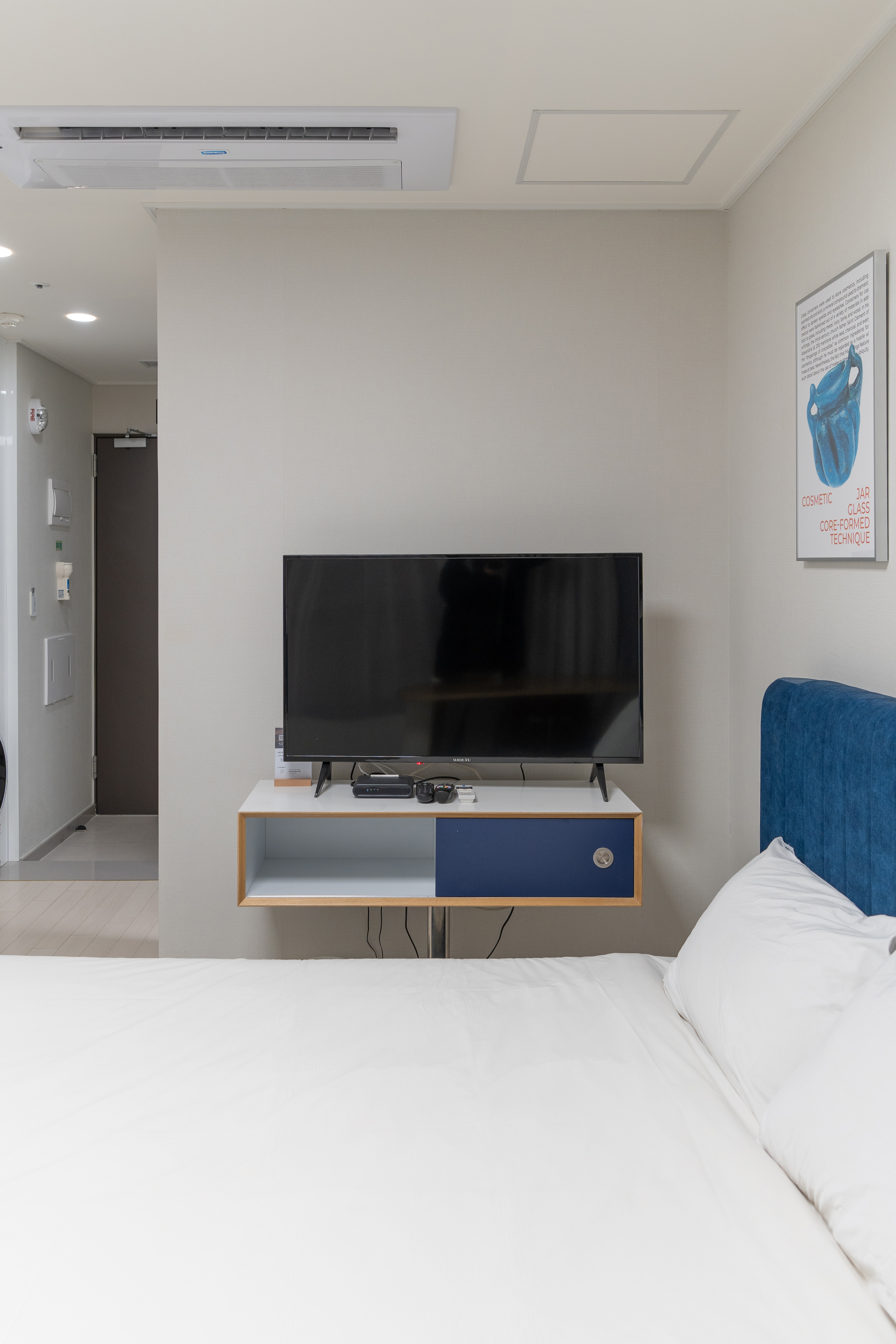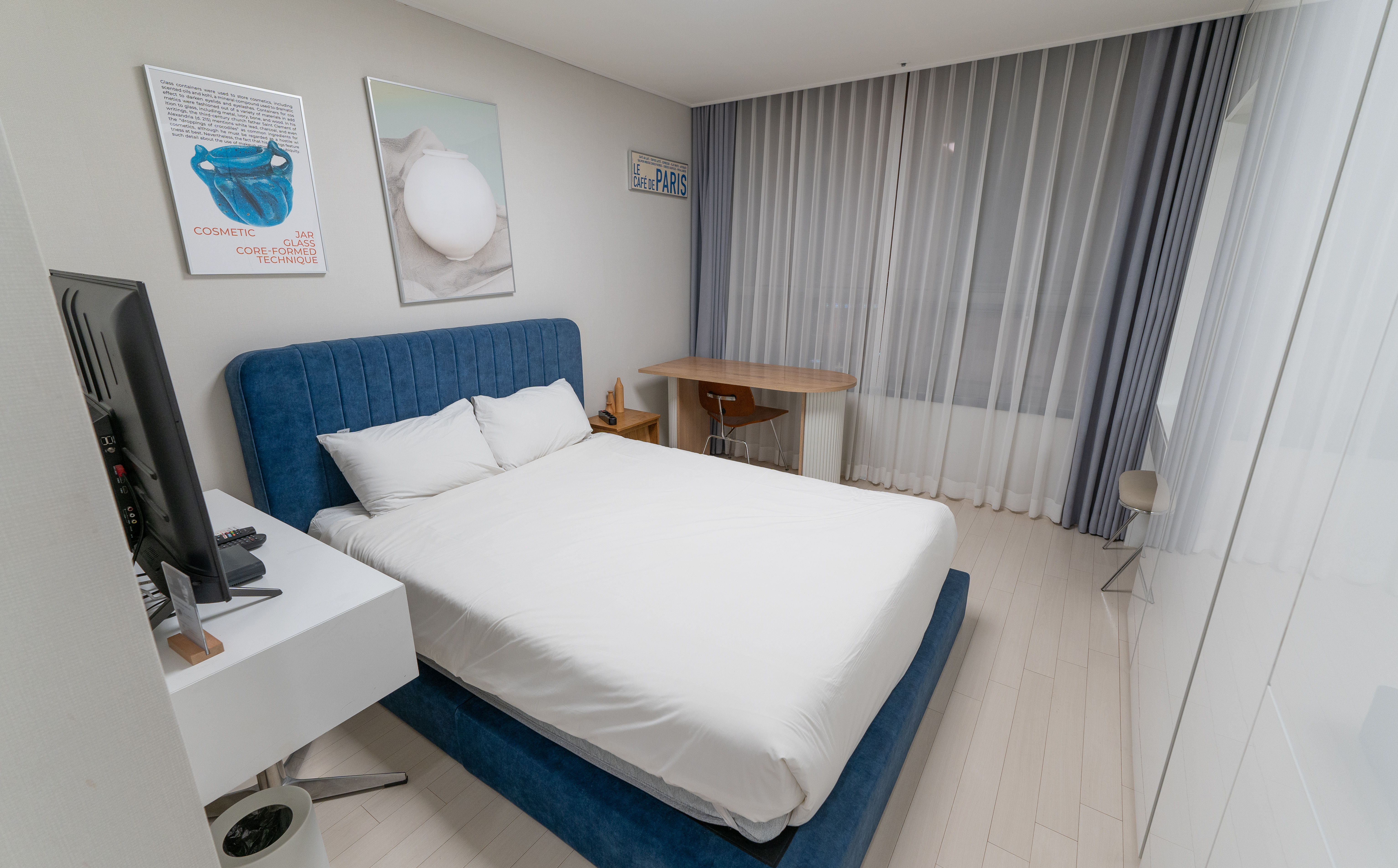 UH FLAT 더송도의 침실의 모습은 위와 같습니다. 이곳은 타 레지던스 대비 살짝 협소한 느낌이 있었지만, 나름 잘 꾸며져 있고, 저 혼자 이용하기에 크게 불편함은 없었습니다. 보통 침대에 누웠을 때 정면에 TV가 설치되어 있는데, 이곳은 이상하게도 침대 옆으로 작은 TV가 놓여있었다는 점이 있었습니다.