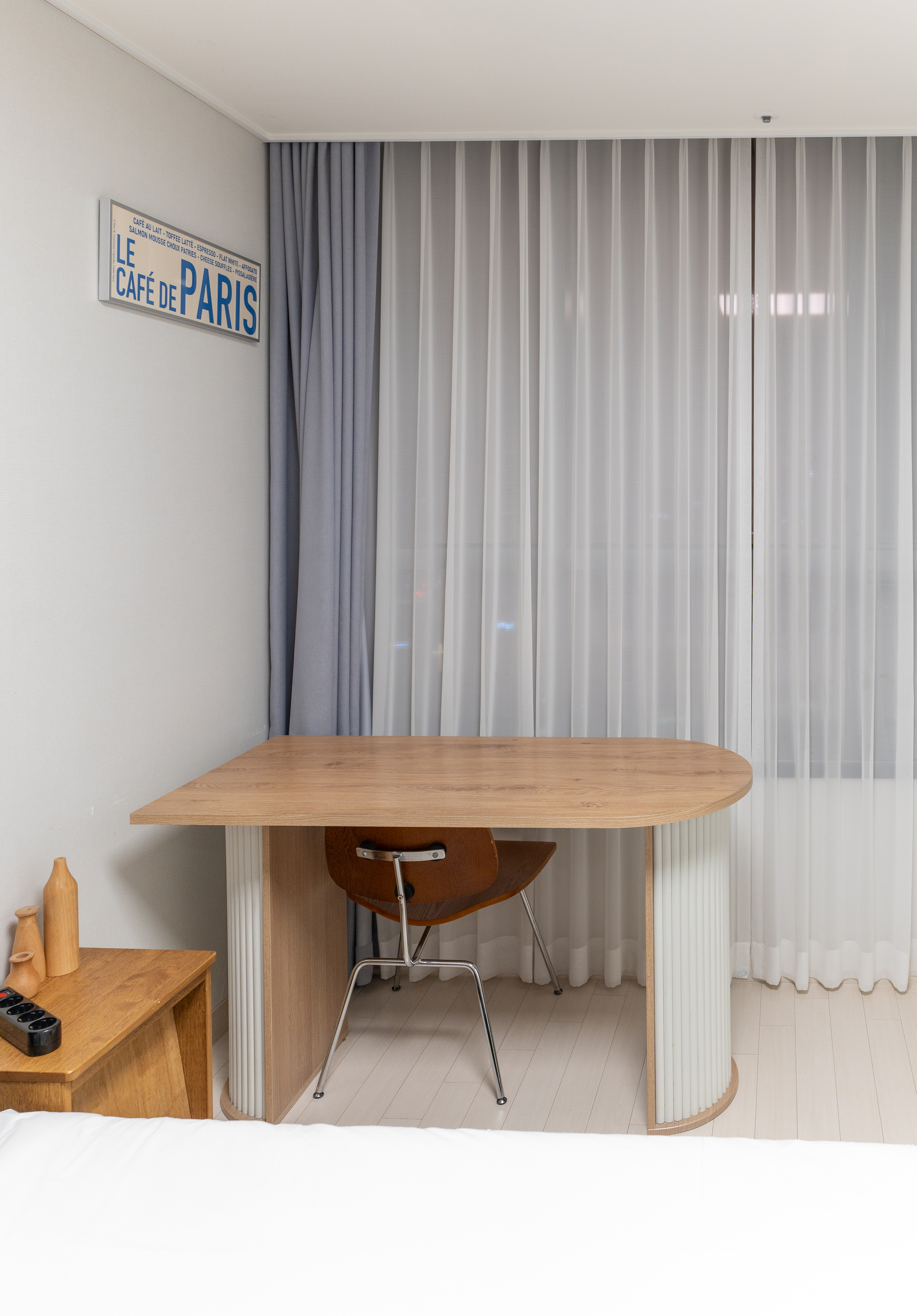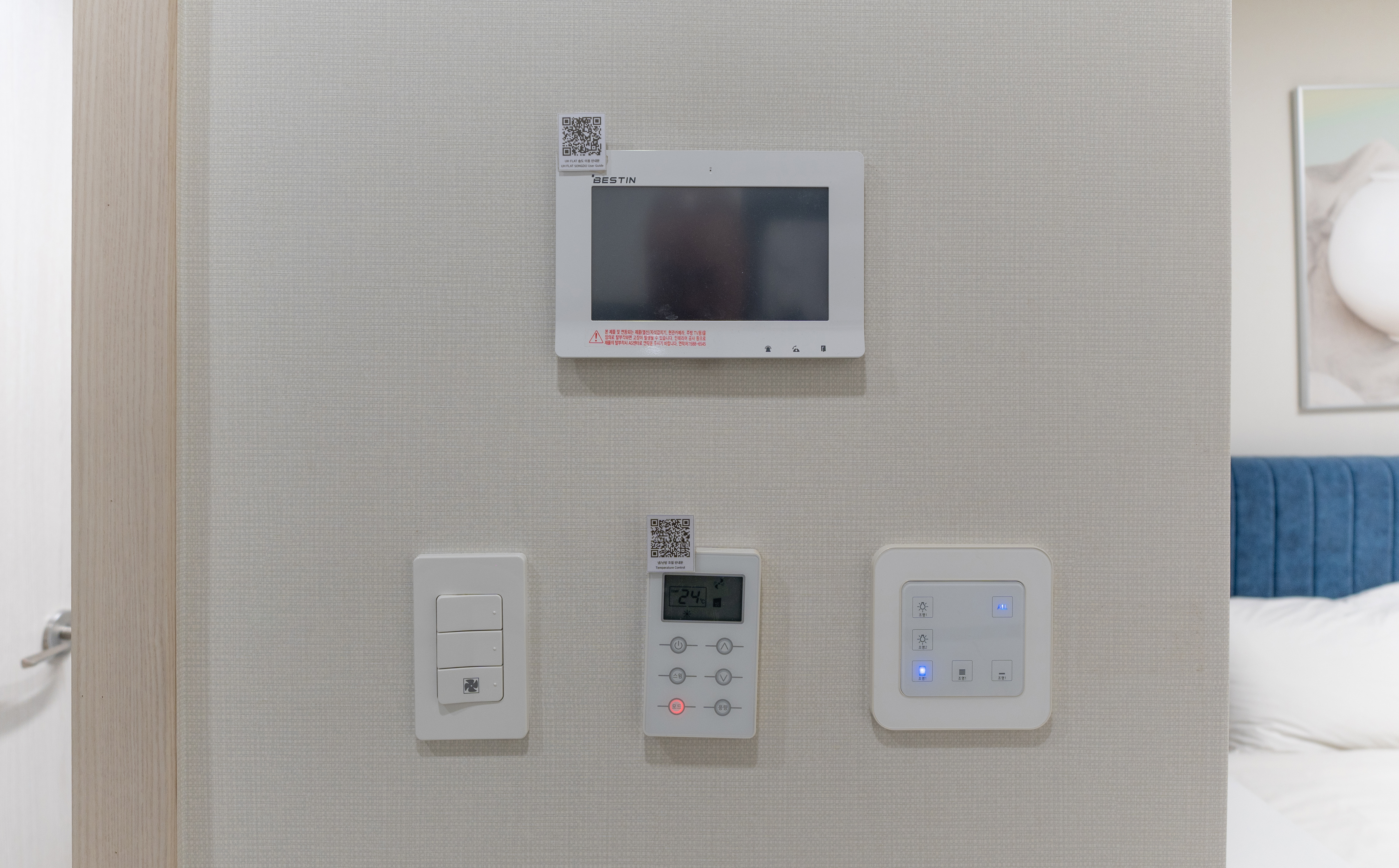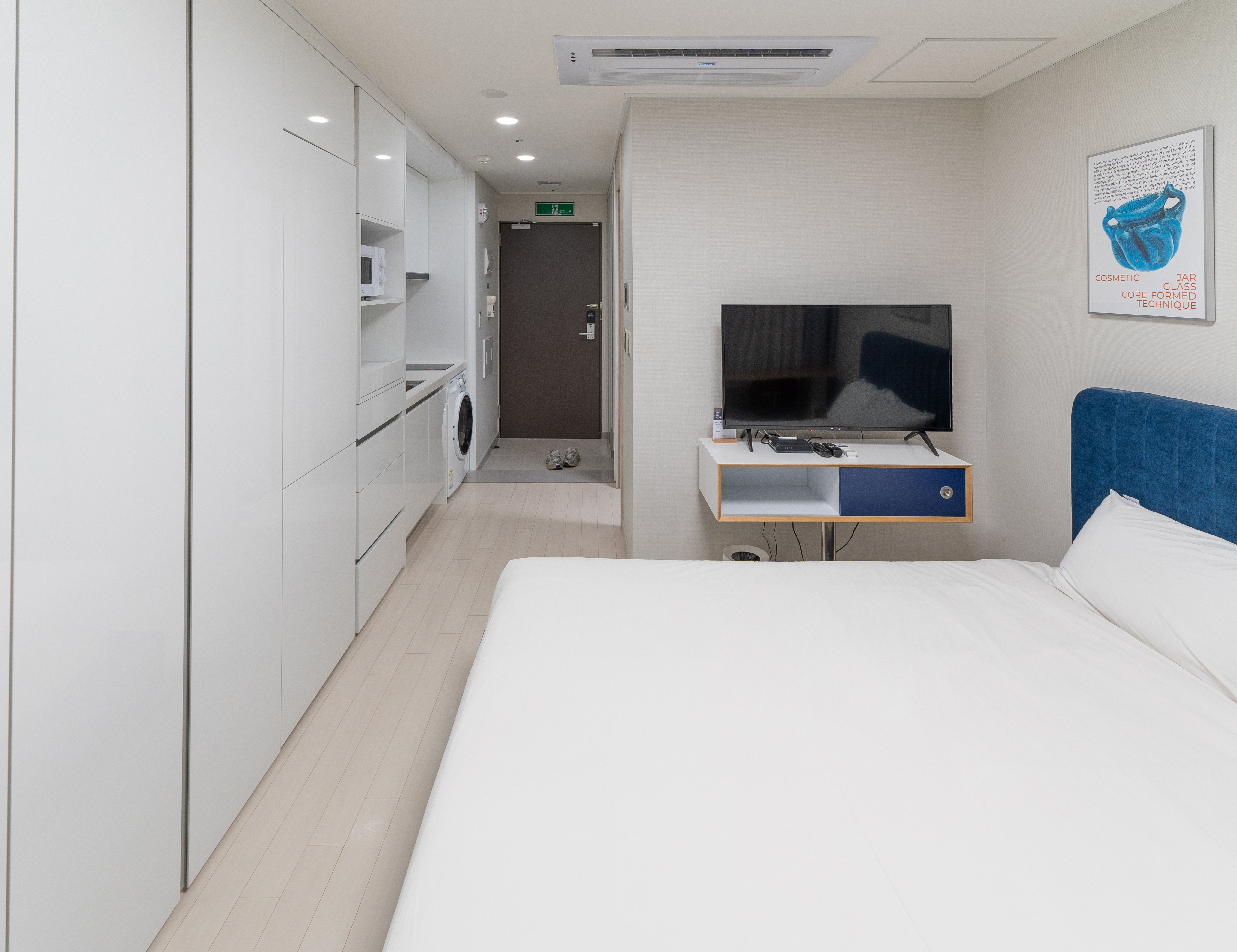 UH FLAT 더송도의 침실의 모습은 위와 같습니다. 이곳은 타 레지던스 대비 살짝 협소한 느낌이 있었지만, 나름 잘 꾸며져 있고, 저 혼자 이용하기에 크게 불편함은 없었습니다. 보통 침대에 누웠을 때 정면에 TV가 설치되어 있는데, 이곳은 이상하게도 침대 옆으로 작은 TV가 놓여있었다는 점이 있었습니다.