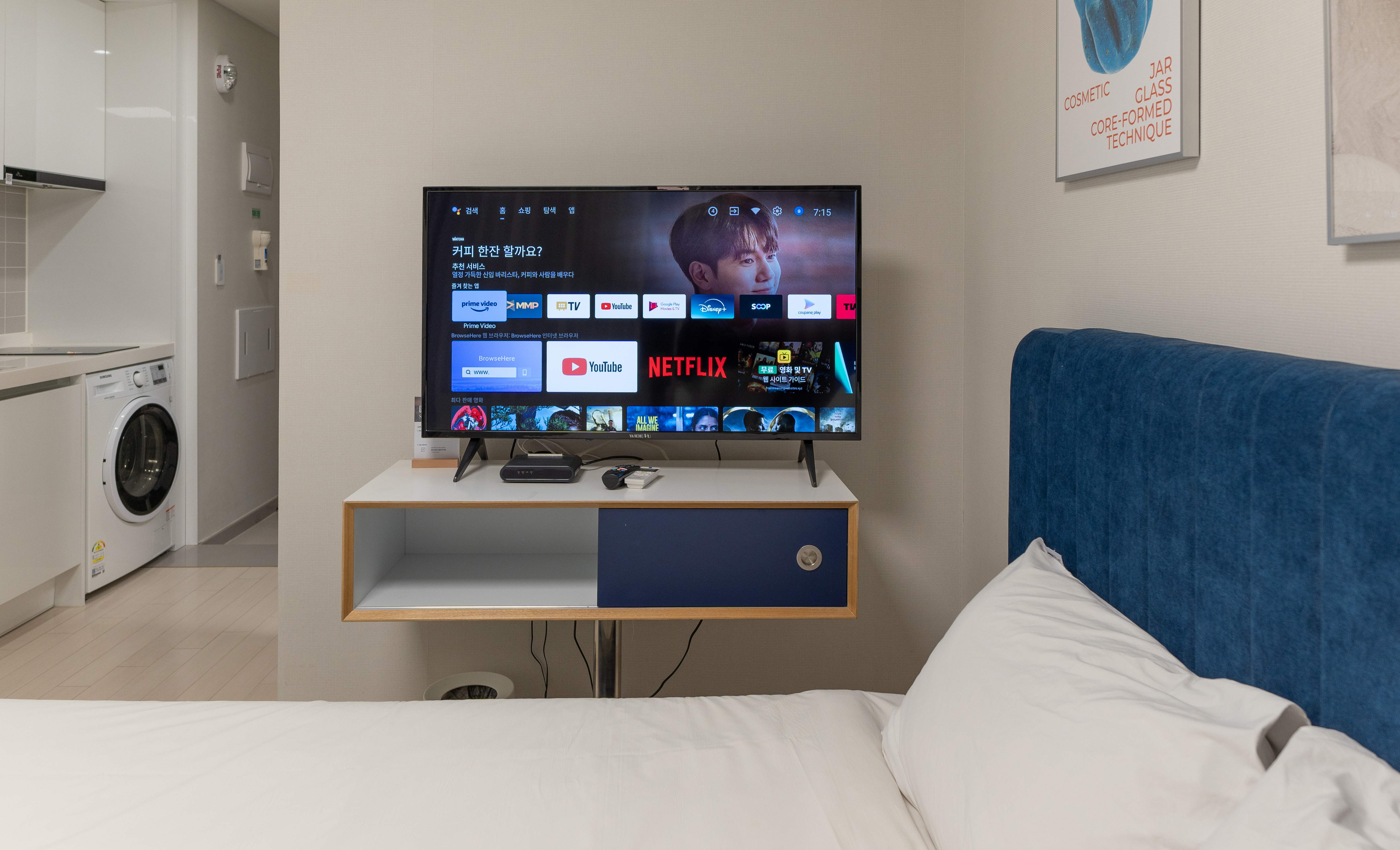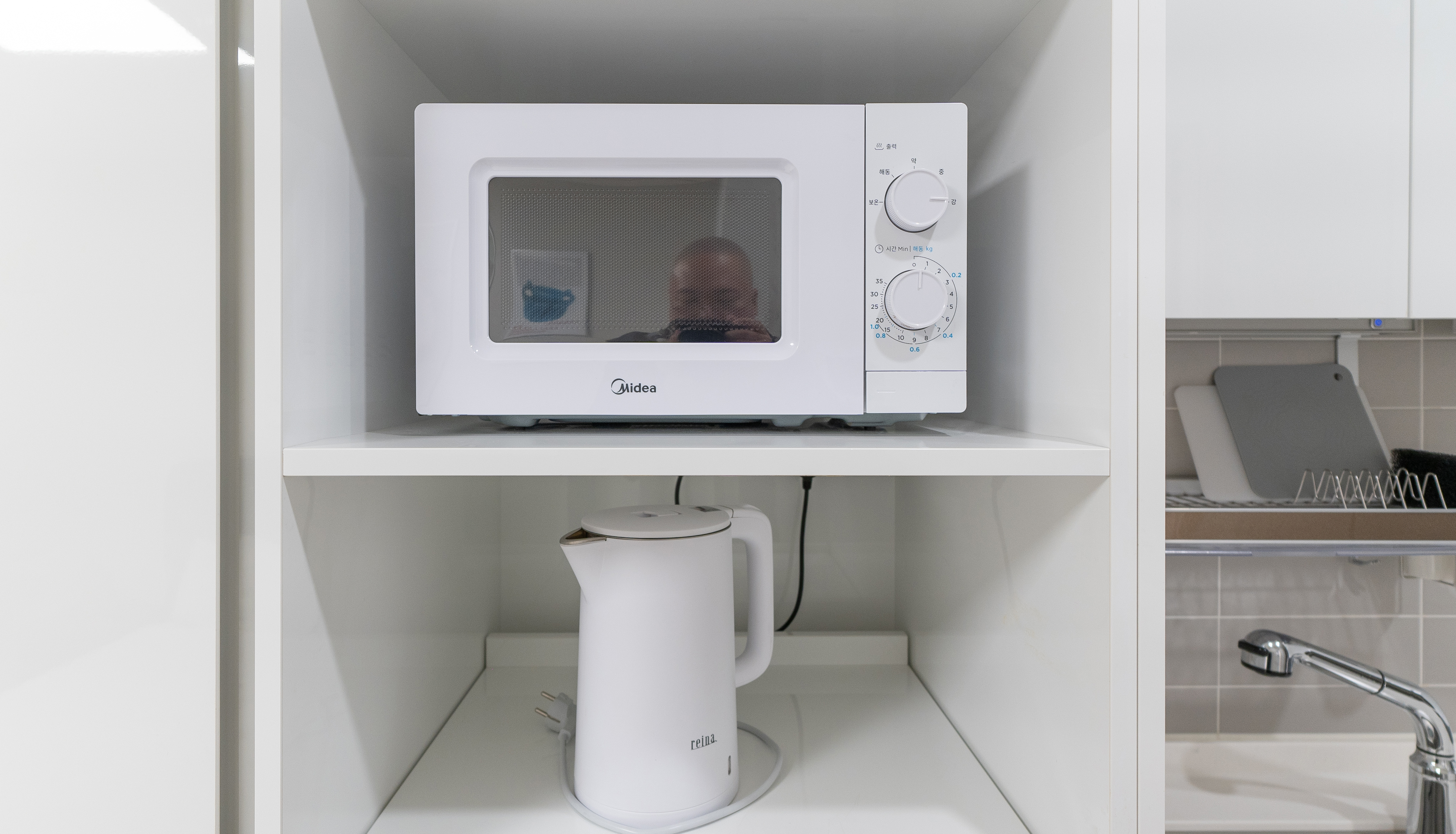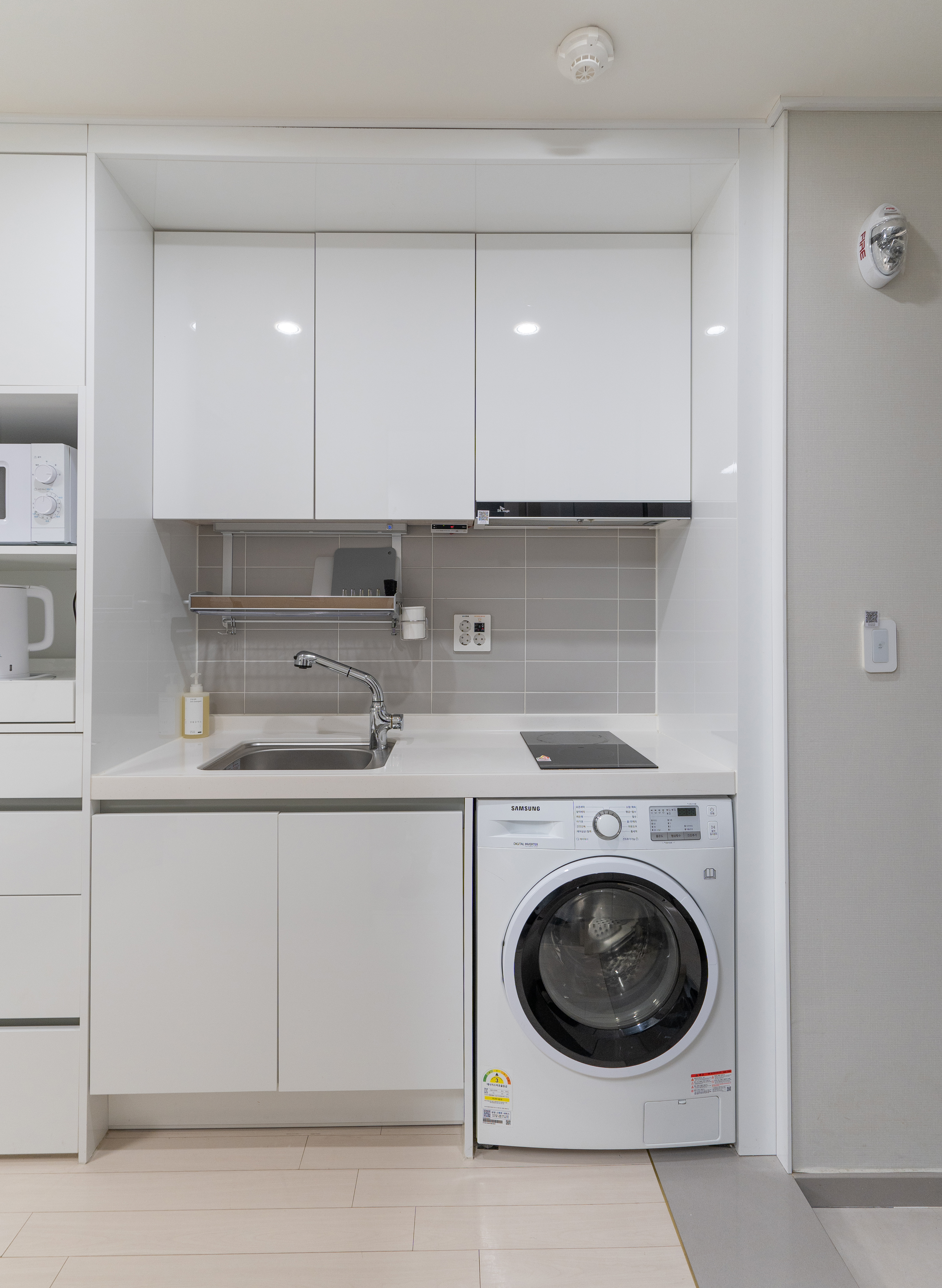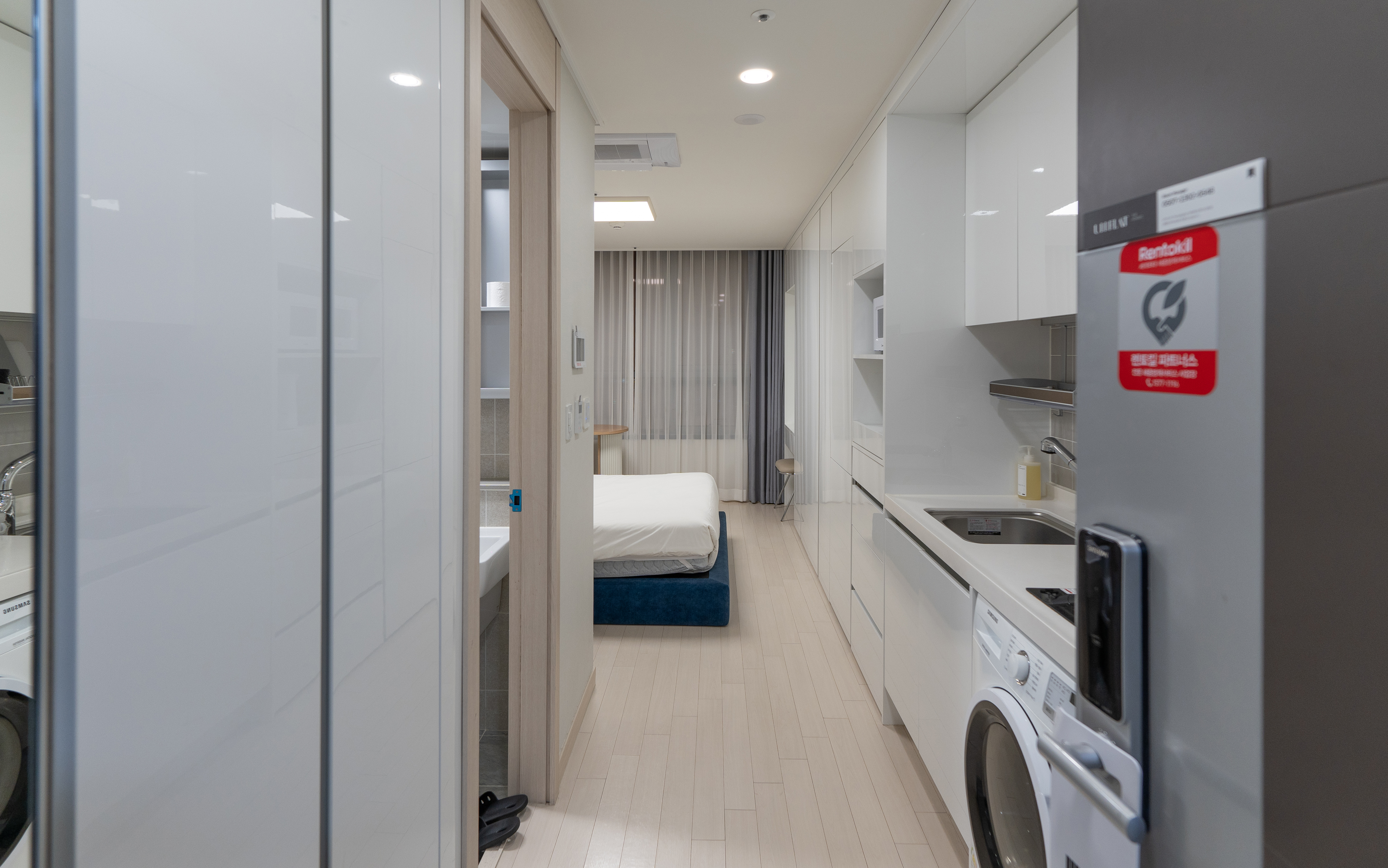 가전 및 가구는 화이트와 블랙으로 깔끔한 느낌이 있었고, 약간 인테리어 견본 하우스 처럼 데스크나 멀티탭마저도 약간 고급스러운 느낌이 있었습니다. 간이 주방에도 간단히 요리하거나 설거지할 수 있도록 되어있었고, 세탁기에는 건조기능까지 달려있어 간단한 세탁이 가능했습니다.