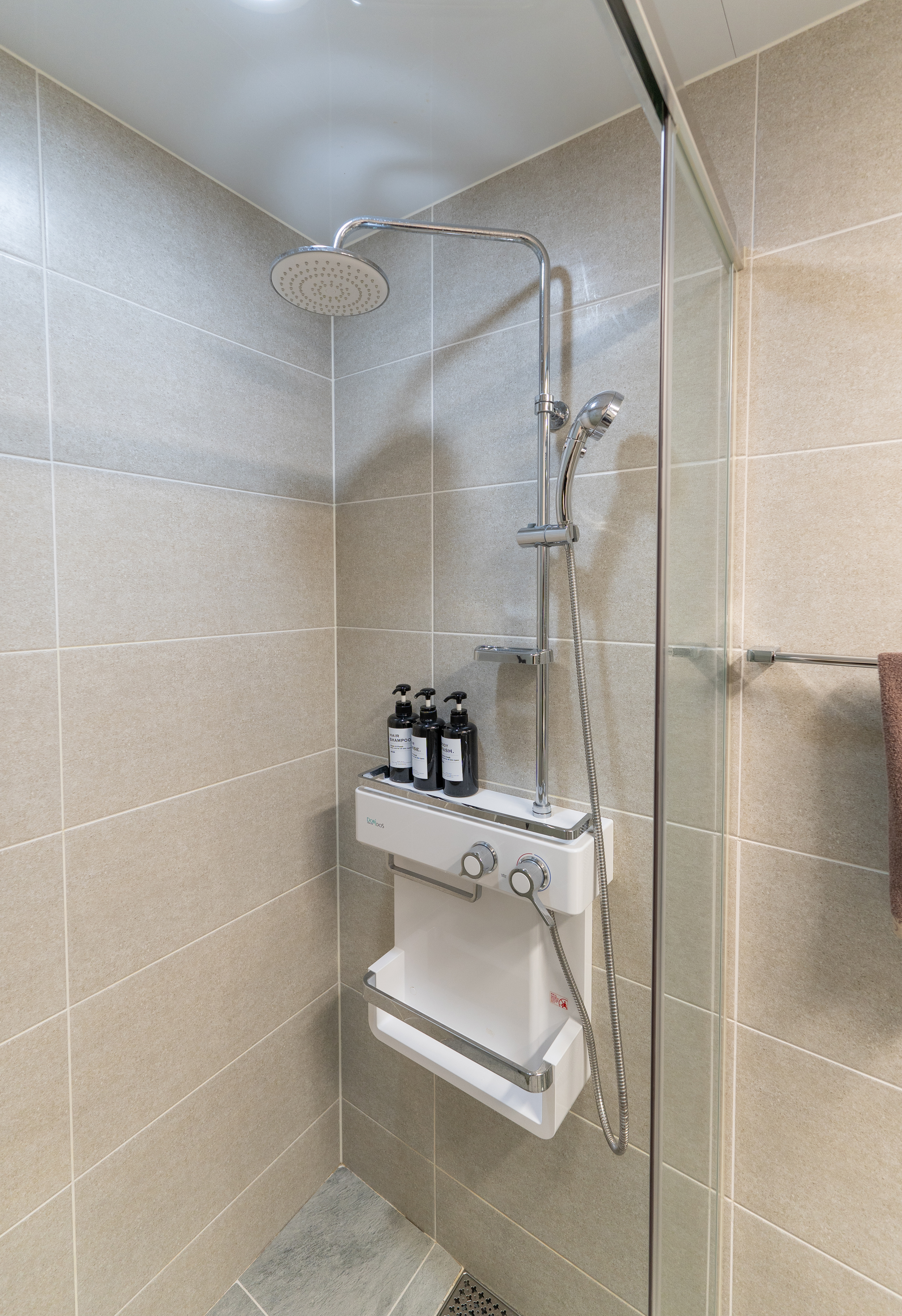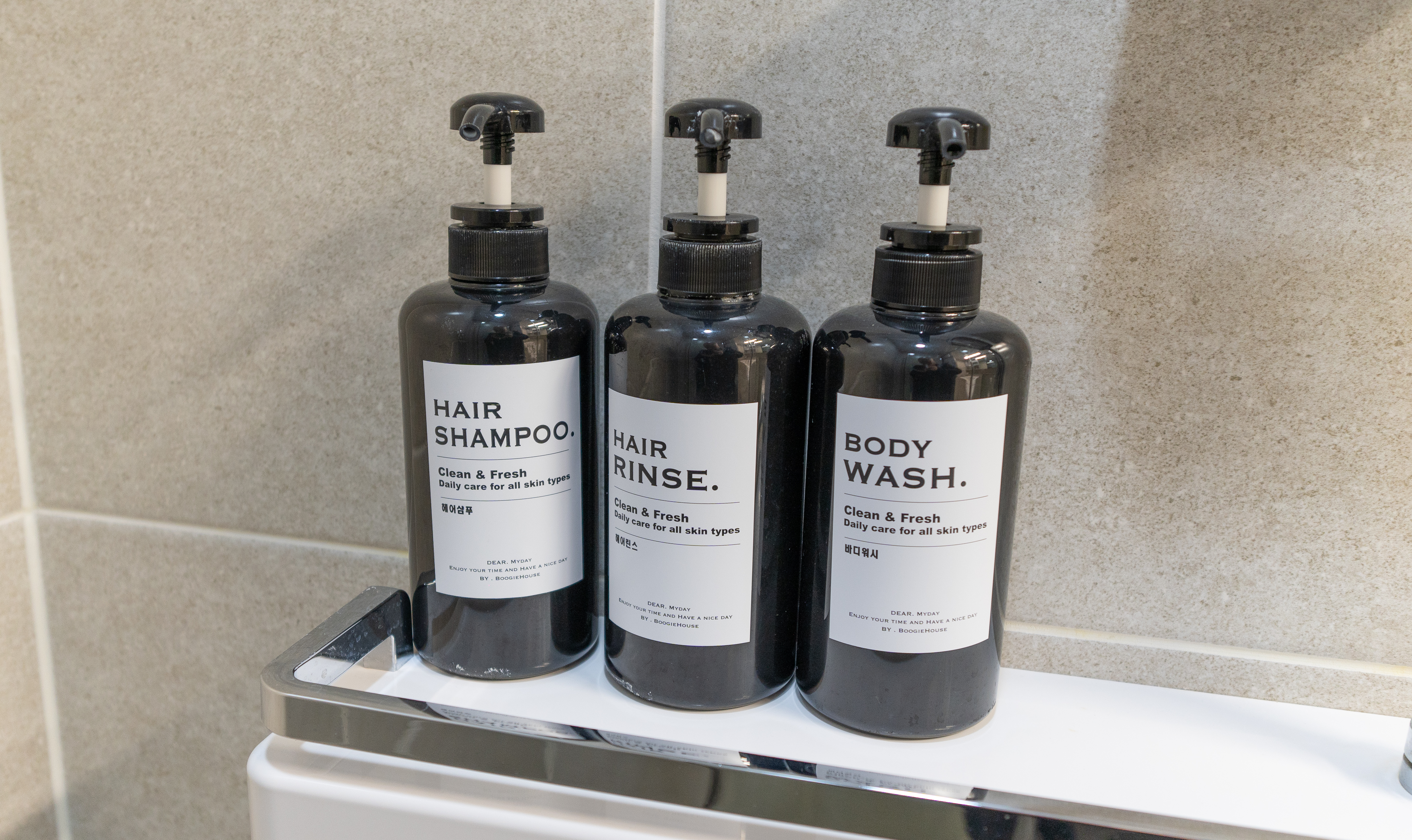 욕실에는 적당한 두께감 있는 도톰한 수건과 핸드워시, 샴푸, 린스, 바디워시 등이 함께 제공되고 있었습니다. UH 플랫 더송도의 욕실은 전체적으로 깔끔하면서도 무난한 욕실이었습니다.