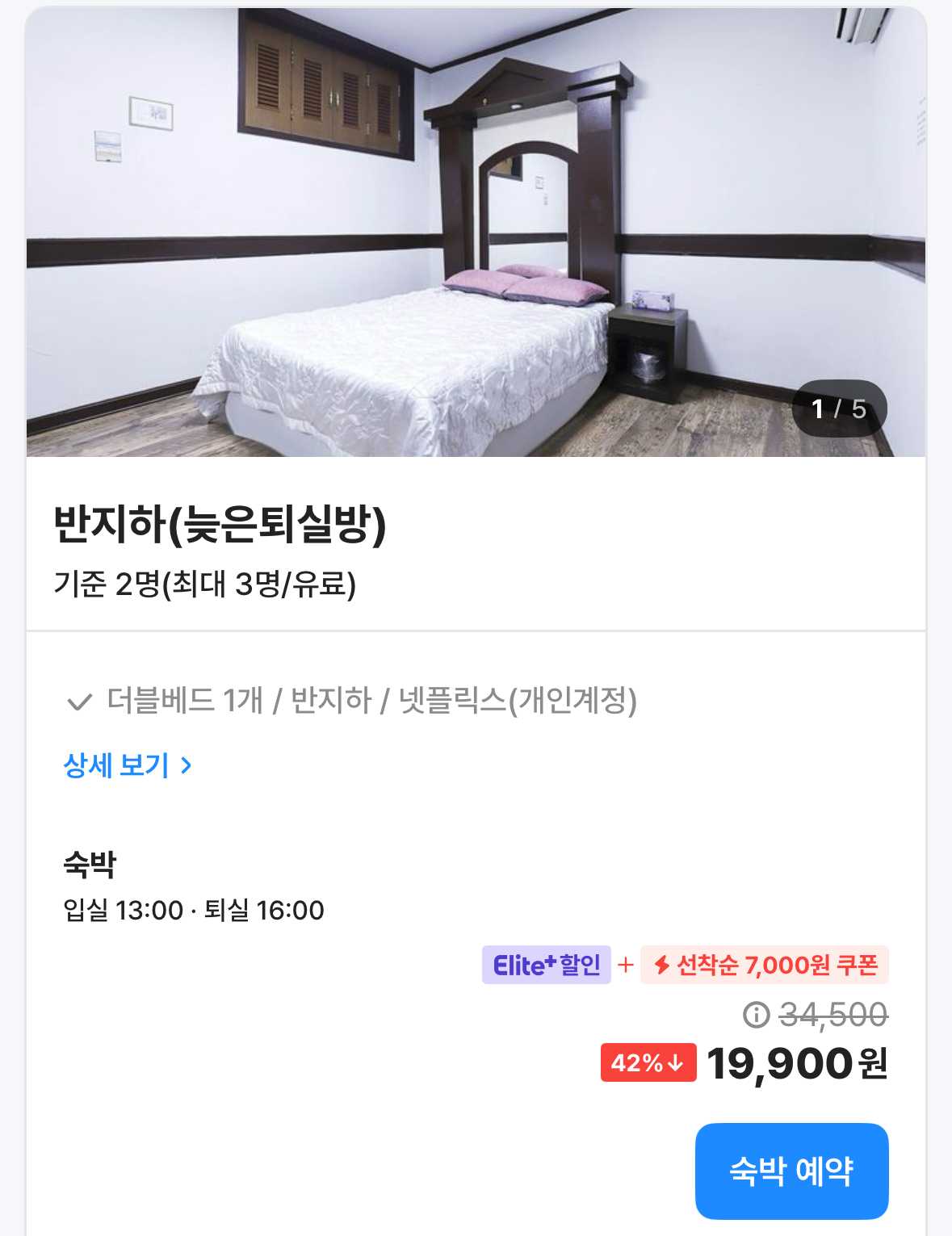 특히 재미있는 점은 이 숙소에는 반지하 옵션 이 있었는데요, 제가 이용하고 있는 OTA 서비스인 숙박앱 '여기어때'를 통해 할인받아 예약하면, 만원 대인 19,900원에 숙소를 예약할 수 있었습니다. 바다 바로 앞에 있지만, 반지하에 있는 이 숙소, 과연 오션 뷰를 볼 수 있을까요?