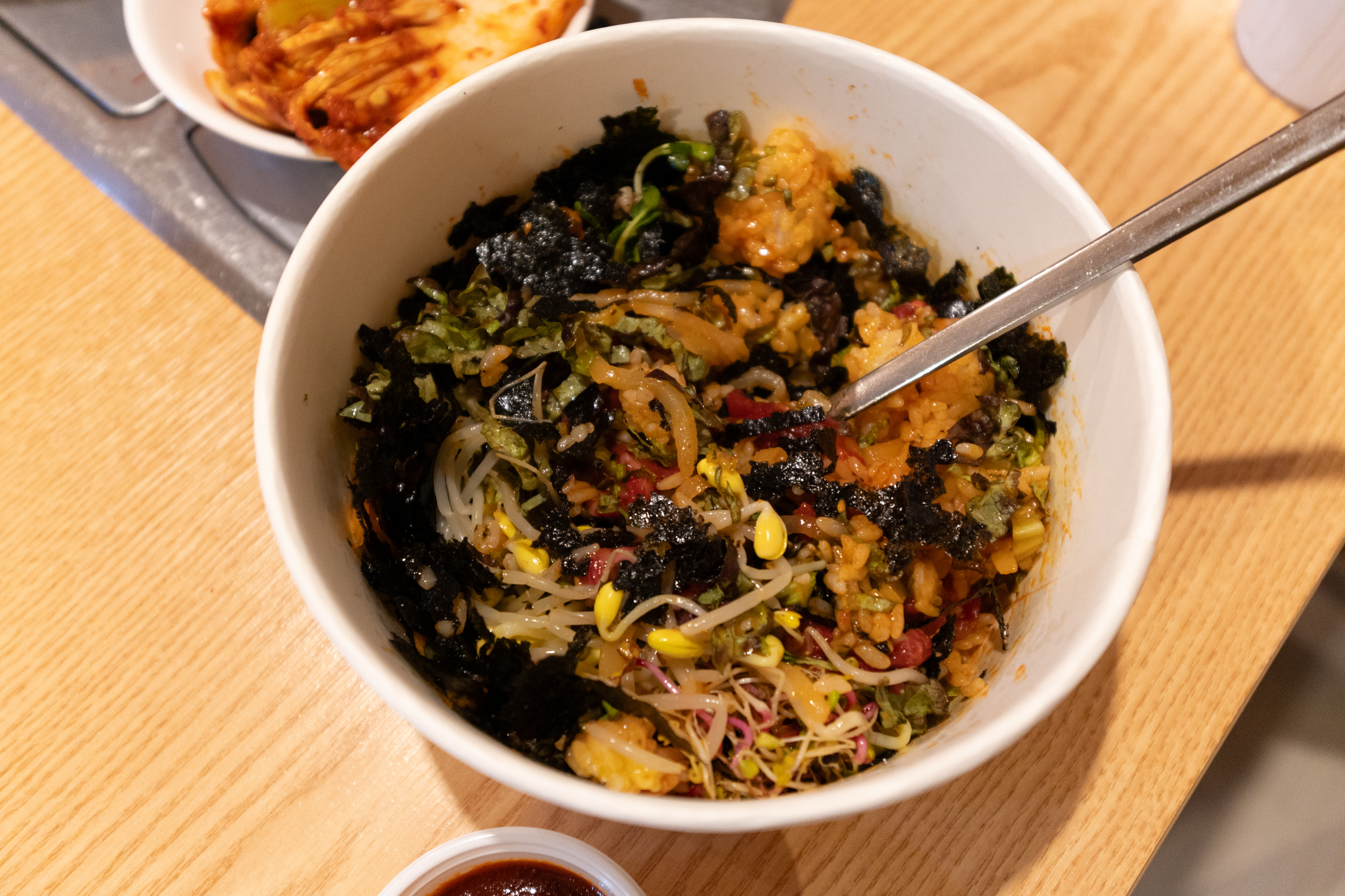 한우육회비빔밥의 모습은 위와 같습니다. 나물과 상추, 한우육회와 달걀은 밥이랑 따로 제공하고 있어서, 육회가 미리 익어버리는 일을 방지해서 좋았습니다. 특히 이 가게는 김치가 맛있다고 하던데요, 배추김치와 무김치 모두 맛이 괜찮더라고요. 그리고 장국이 제공되었습니다.