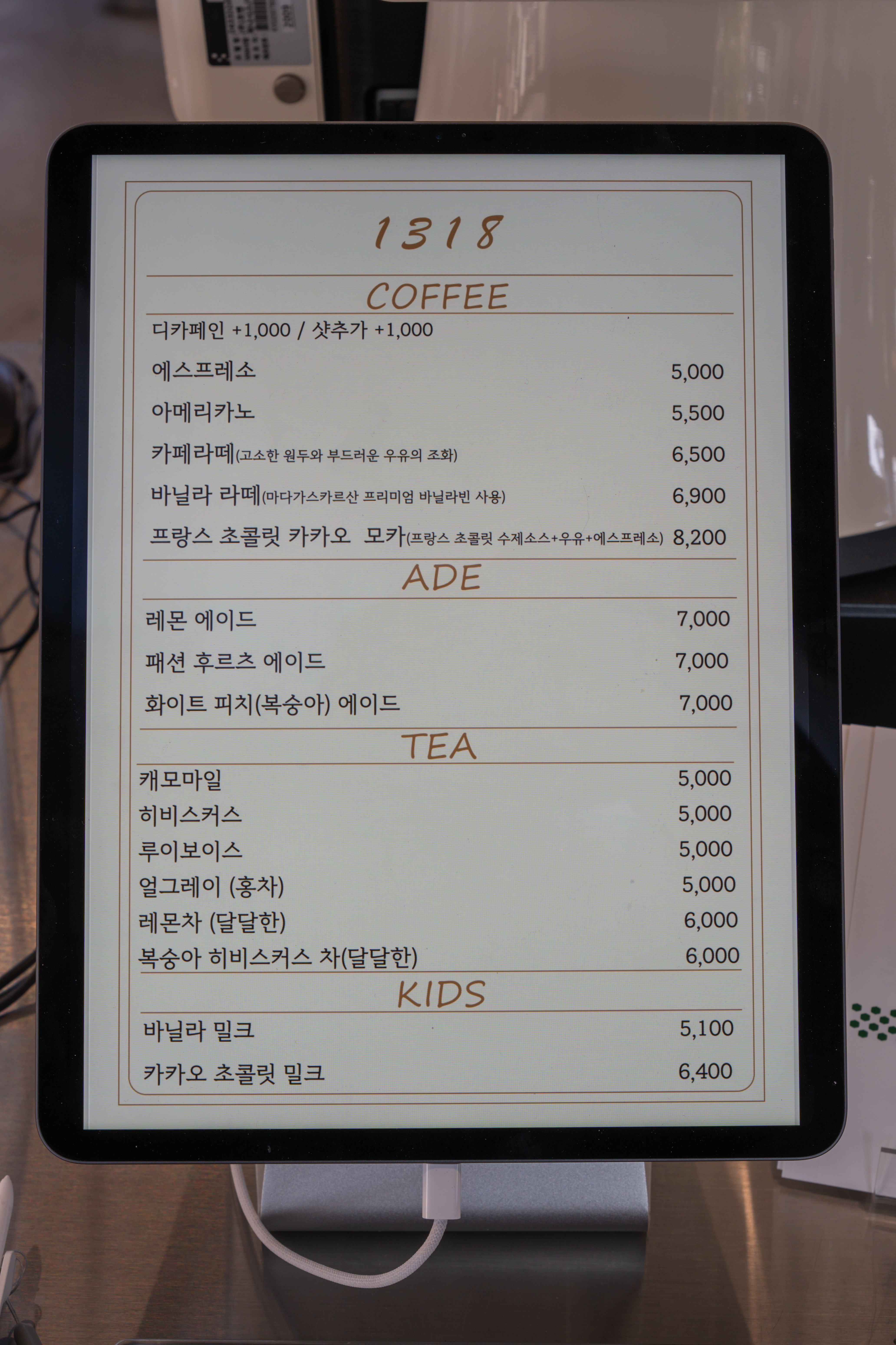 1318 커피의 음료는 에스프레소, 아메리카노, 카페라떼, 바닐라라떼, 프랑스초콜릿카카오모카, 레몬에이드, 패션후르츠에이드, 화이트피치에이드, 캐모마일, 히비스커스, 루이보이스, 얼그레이, 레몬차, 복숭아히비스커스차, 바닐라밀크, 카카오초콜릿밀크가 있었습니다. 이곳은 베이커리 카페답게 가게에서 직접 만드는 디저트류가 돋보였습니다.