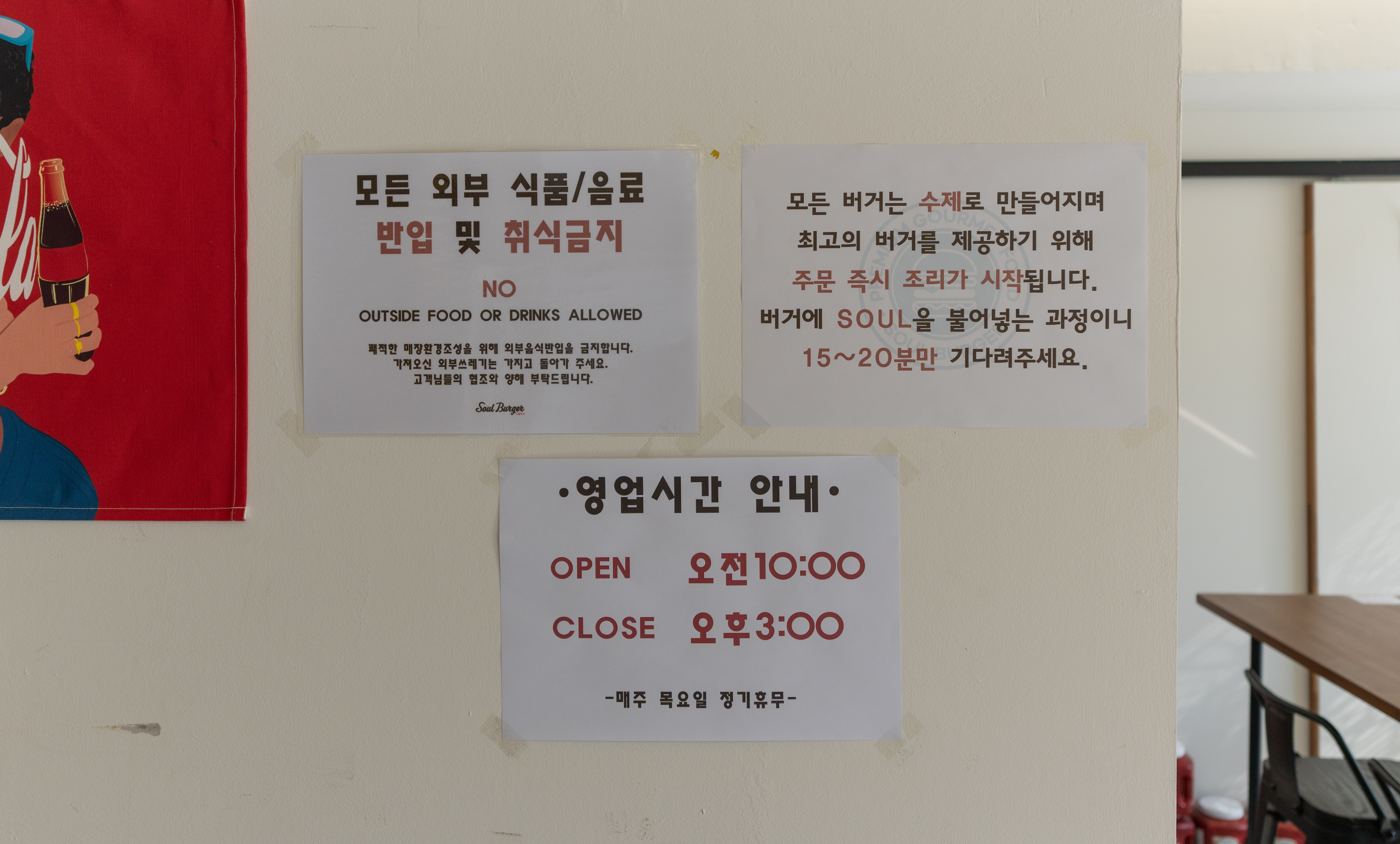 소울버거 영업시간은 10:00-15:00 였고, 매주 화요일은 휴무라고 합니다. 가게 내부도 무난한 인테리어에 전체적으로 화이트 톤으로 깔끔한 느낌이 있었습니다. 가게 분위기도 밝고 좋았습니다.