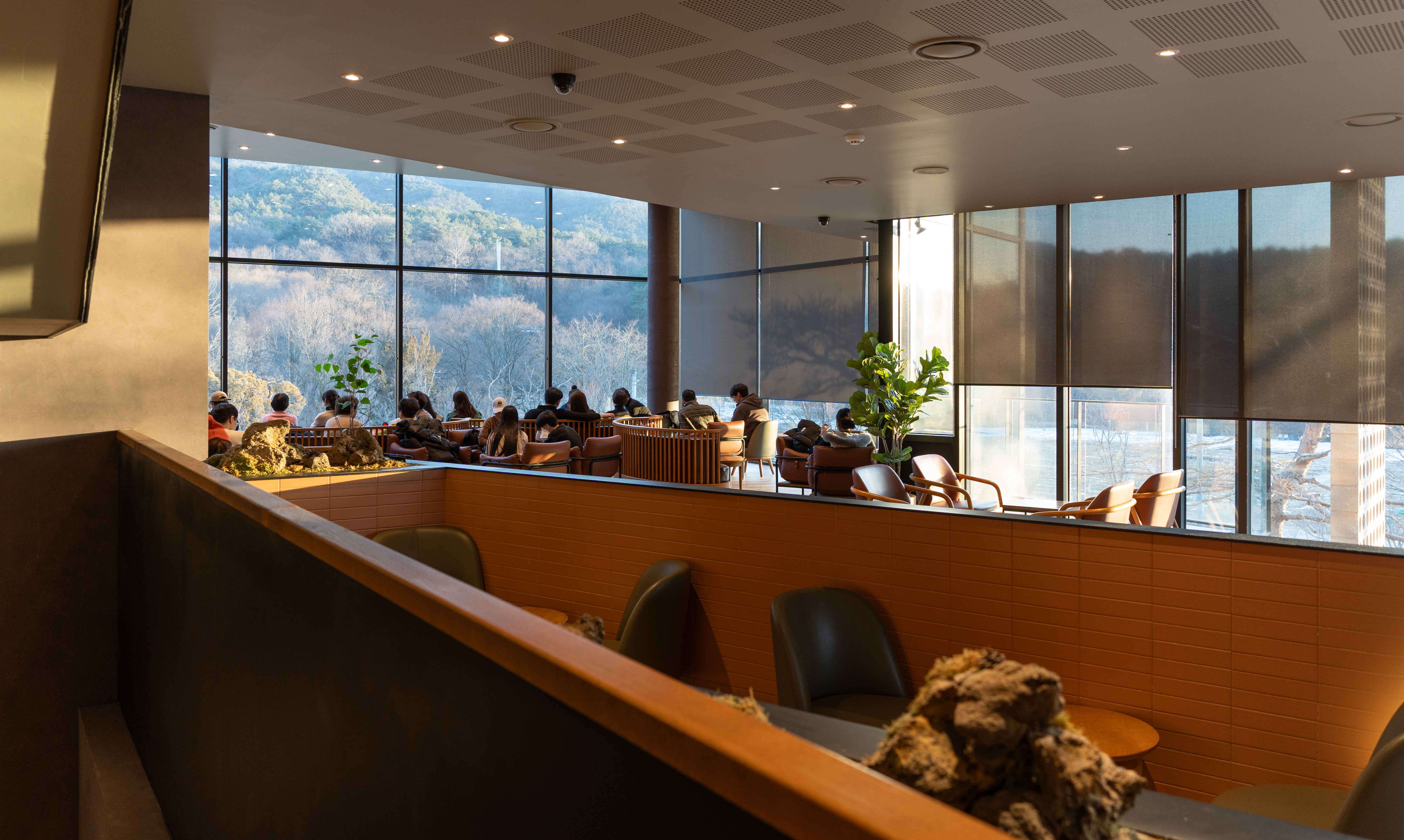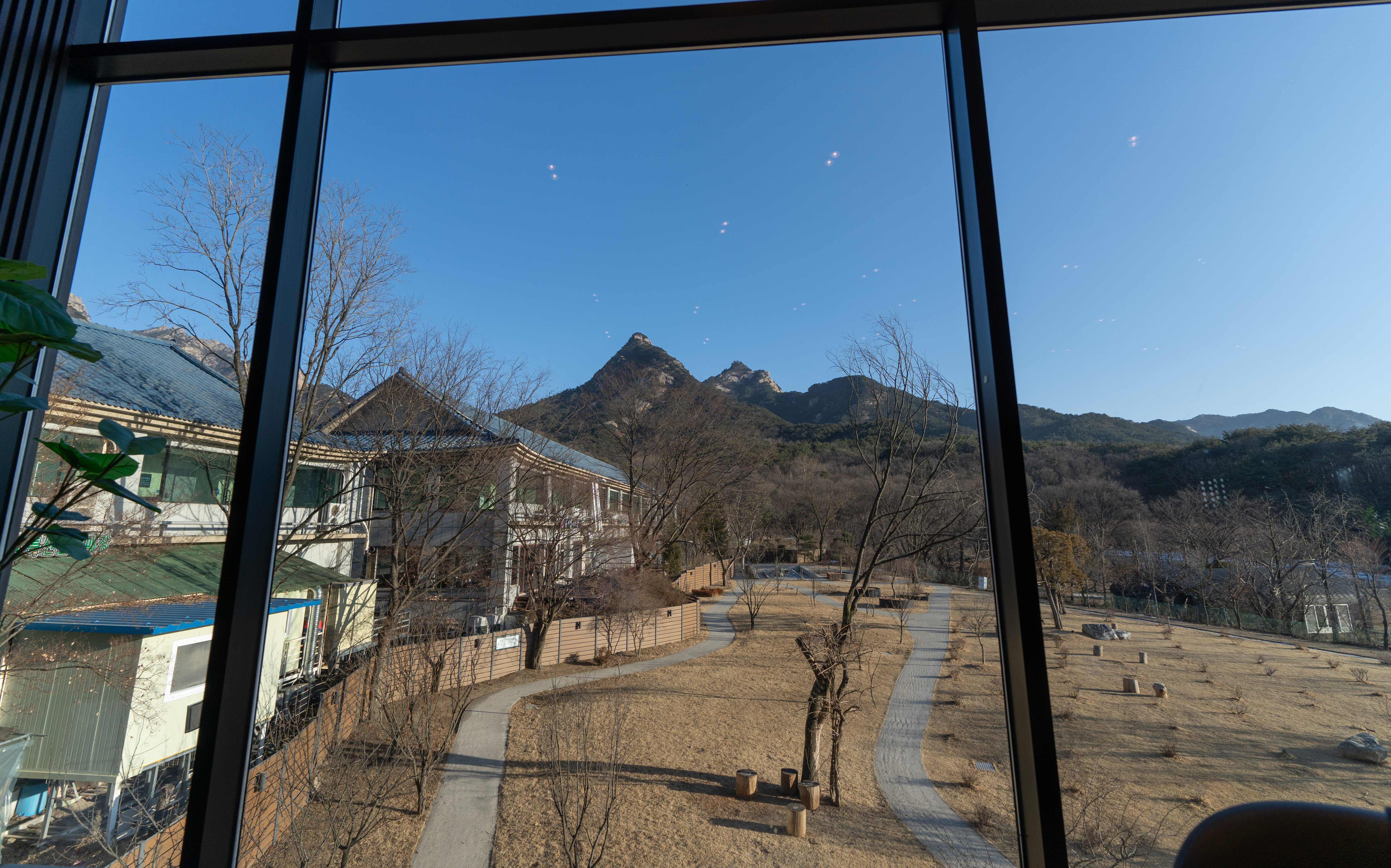 2층으로 올라가면 더 큰 공간이 나오는데요, 저희는 타이밍 좋게 북한산 뷰가 보이는 창가 쪽 자리를 잡을 수 있었습니다. 북한산 뷰가 멋들어지게 펼쳐져 사진 찍기에도 좋았고 웅장한 산새가 매력 있더라고요.