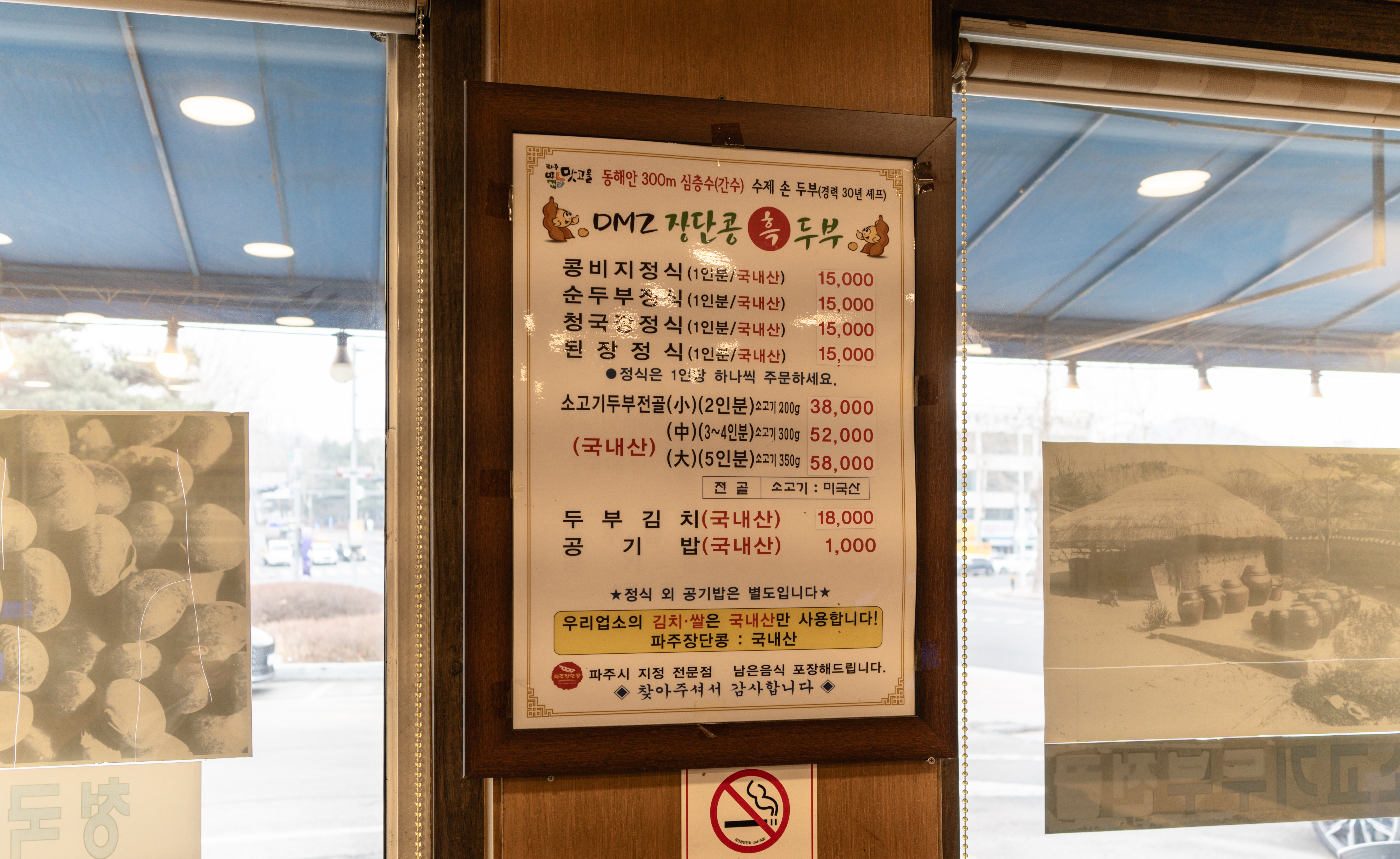 파주 DMZ 장단콩 두부마을의 메뉴는 콩비지정식, 순두부정식, 청국장정식, 된장정식, 소고기두부전골, 두부김치 가 있었습니다. 정식 메뉴의 경우 1인 15,000원으로 가격은 살짝 있는 듯했지만 크게 부담되는 금액도 아니었습니다.