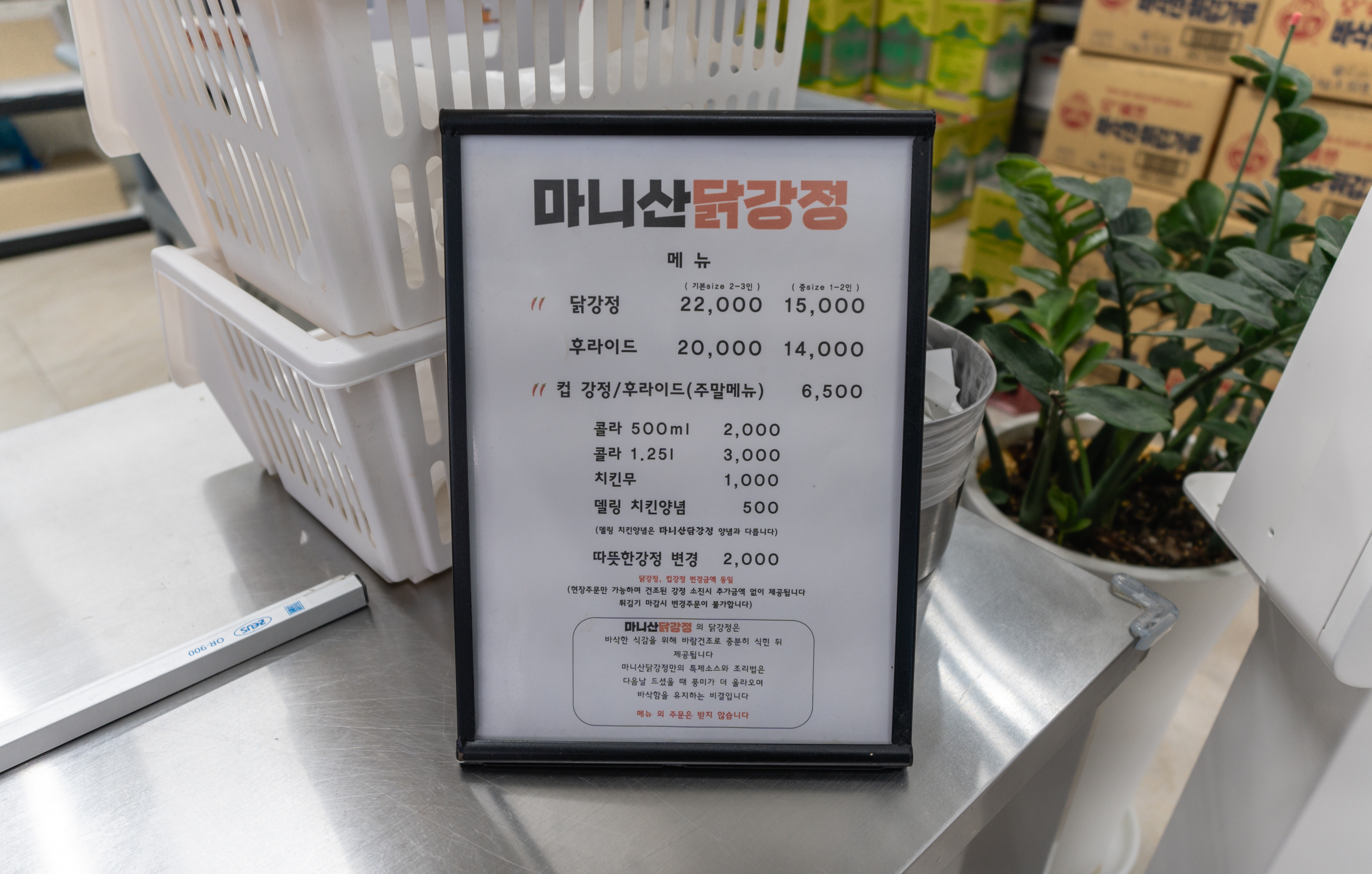 강화 마니산닭강정의 메뉴는 다음과 같습니다. 닭강정, 후라이드, 컵강정, 컵후라이드가 있었습니다. 가격은 닭강정 22,000원, 후라이드 20,000원 이었습니다.