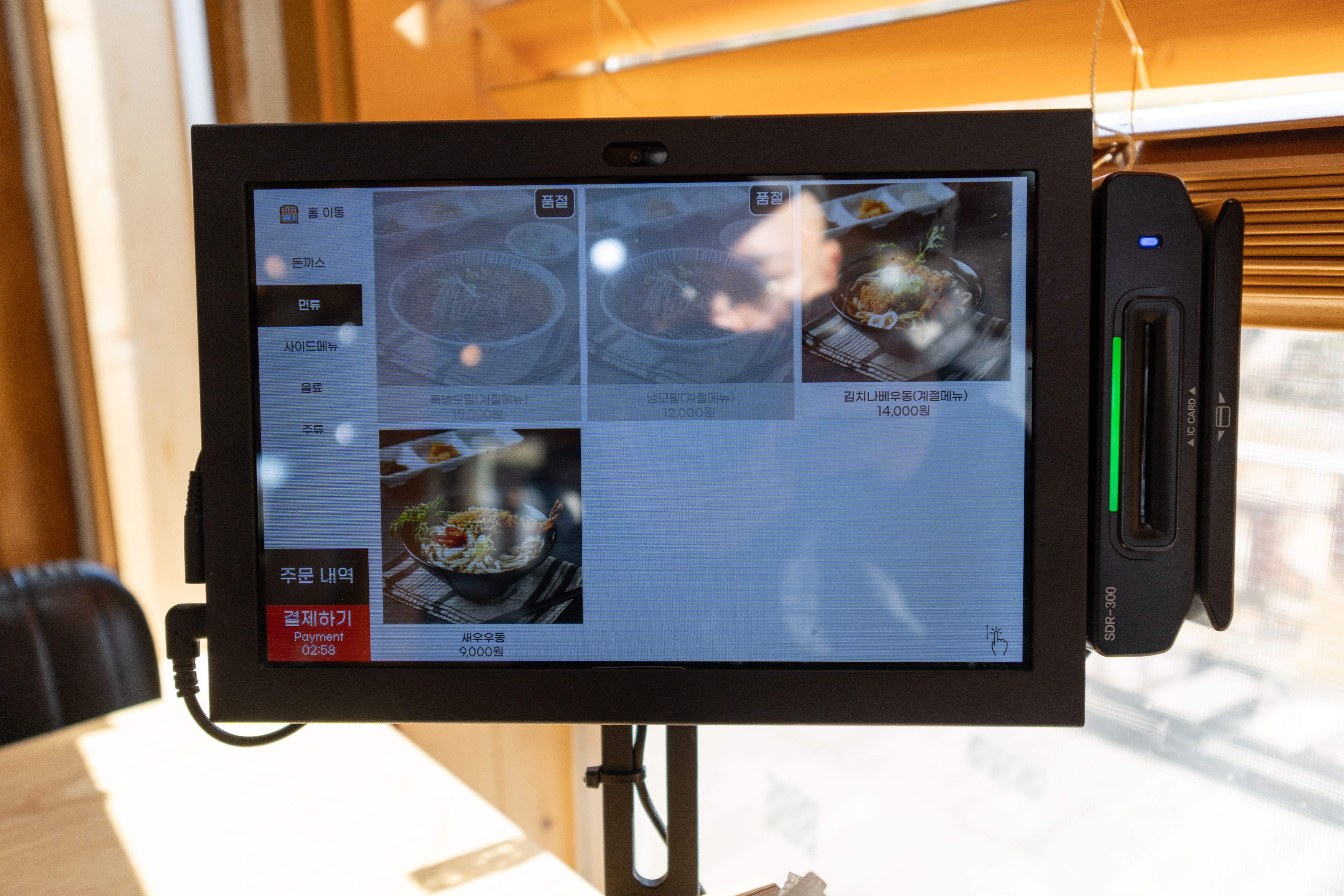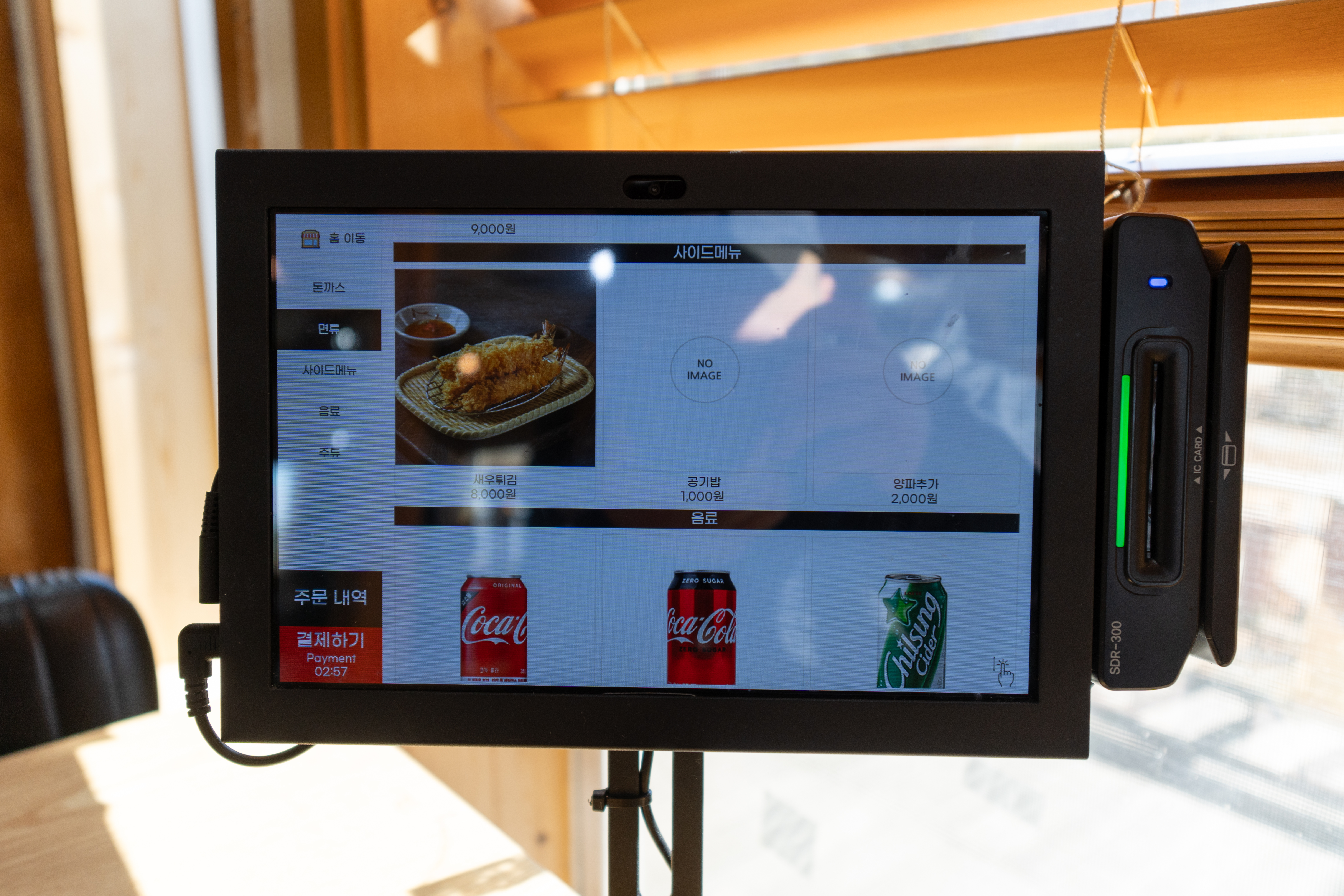 강화 마니온 돈까스의 메뉴는 돈까스, 생선까스, 어니언돈까스, 멘치카츠, 치즈돈까스, *김치나베우동, *냉모밀, 도토리냉묵밥, 새우우동, 새우튀김 등이 있었습니다. 여기서 (*) 표가 있는 메뉴는 계절 메뉴로 여름, 겨울 한정판매 중인 메뉴였습니다. 메뉴는 자리에서 태블릿을 통해 직접 주문에서부터 결제까지 가능했습니다.