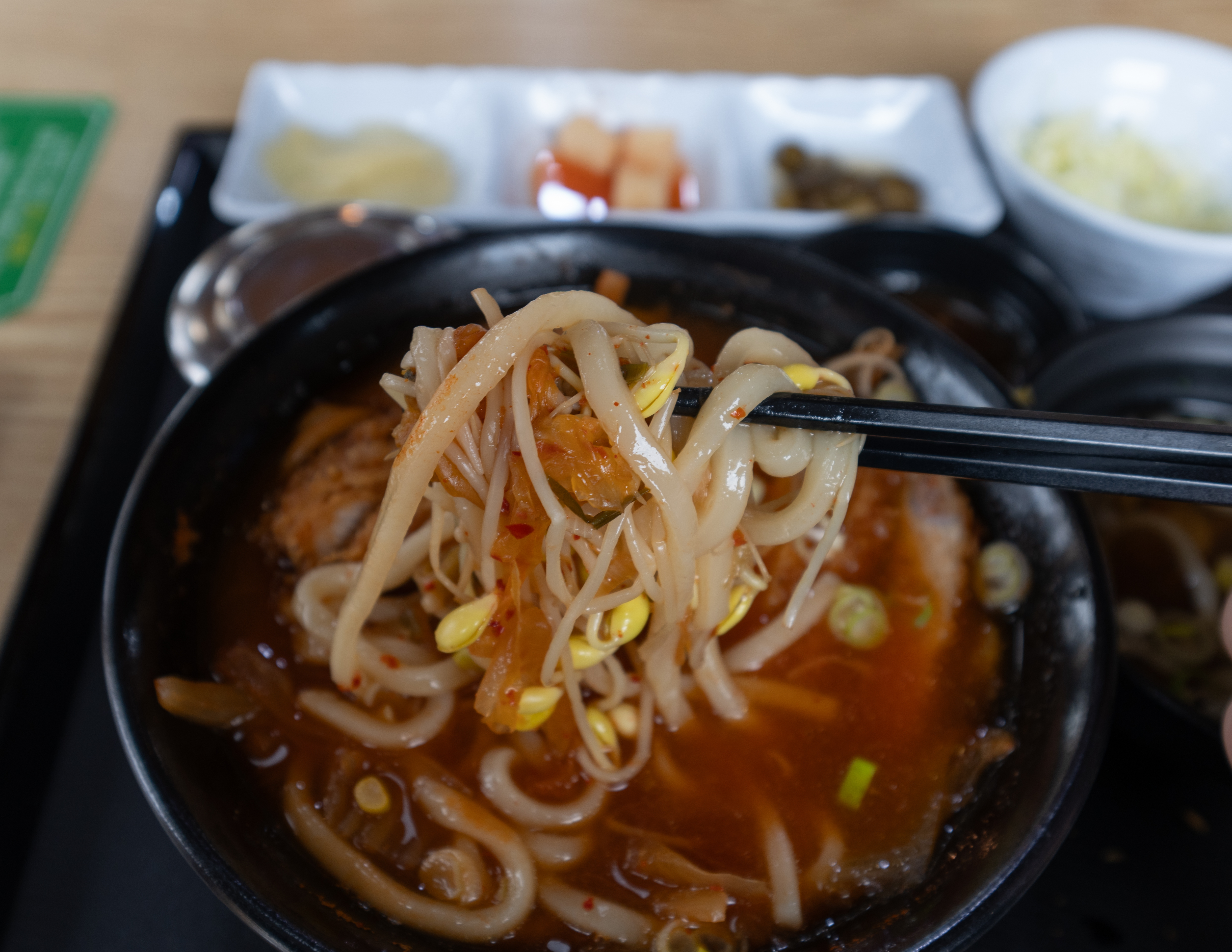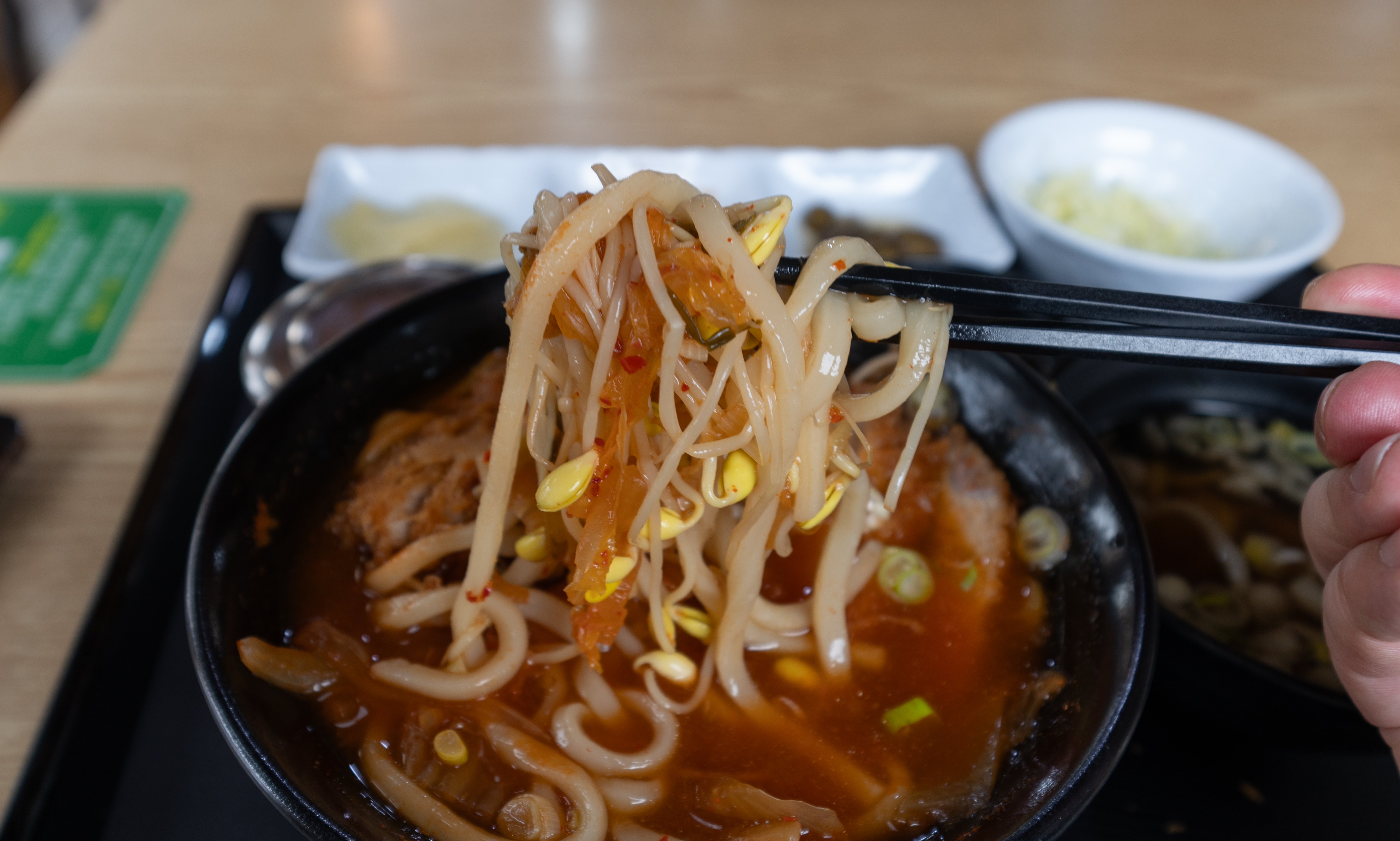 바로, 강화도 마니온의 김치나베우동인데요. 이 메뉴는 얼큰한 김치우동에 돈까스를 올려 만든 메뉴였습니다. 돈까스의 고기가 담백해서 김치우동과 함께 곁들이니 마치 김치찌개(?)를 먹는듯한 느낌도 들더라고요. 아무래도 깔끔담백한 맛이 특징인 메뉴이다보니, 아이들은 치즈돈까스를 어른들은 김치나베우동을 선택하면 괜찮을 것 같았습니다.