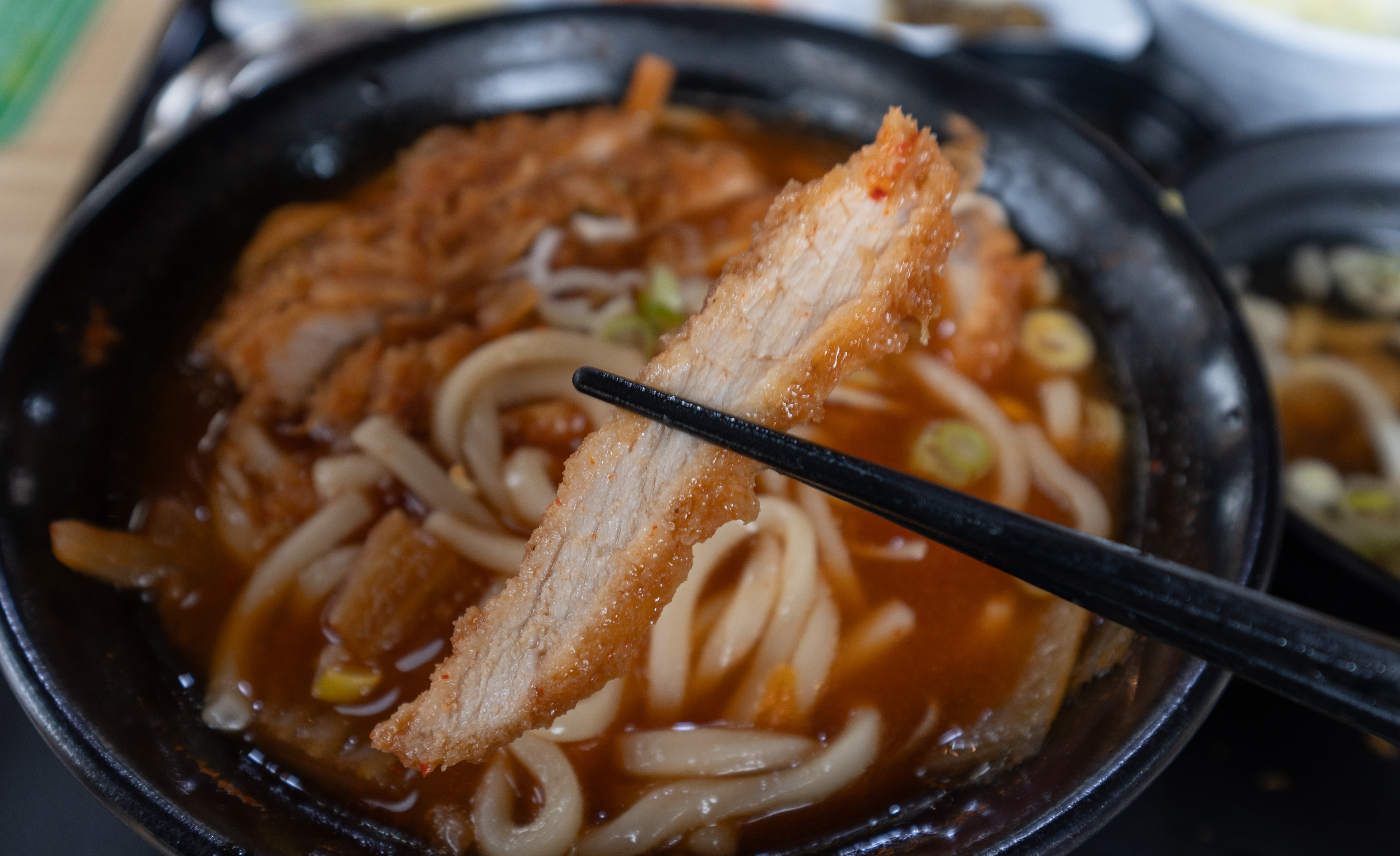바로, 강화도 마니온의 김치나베우동인데요. 이 메뉴는 얼큰한 김치우동에 돈까스를 올려 만든 메뉴였습니다. 돈까스의 고기가 담백해서 김치우동과 함께 곁들이니 마치 김치찌개(?)를 먹는듯한 느낌도 들더라고요. 아무래도 깔끔담백한 맛이 특징인 메뉴이다보니, 아이들은 치즈돈까스를 어른들은 김치나베우동을 선택하면 괜찮을 것 같았습니다.