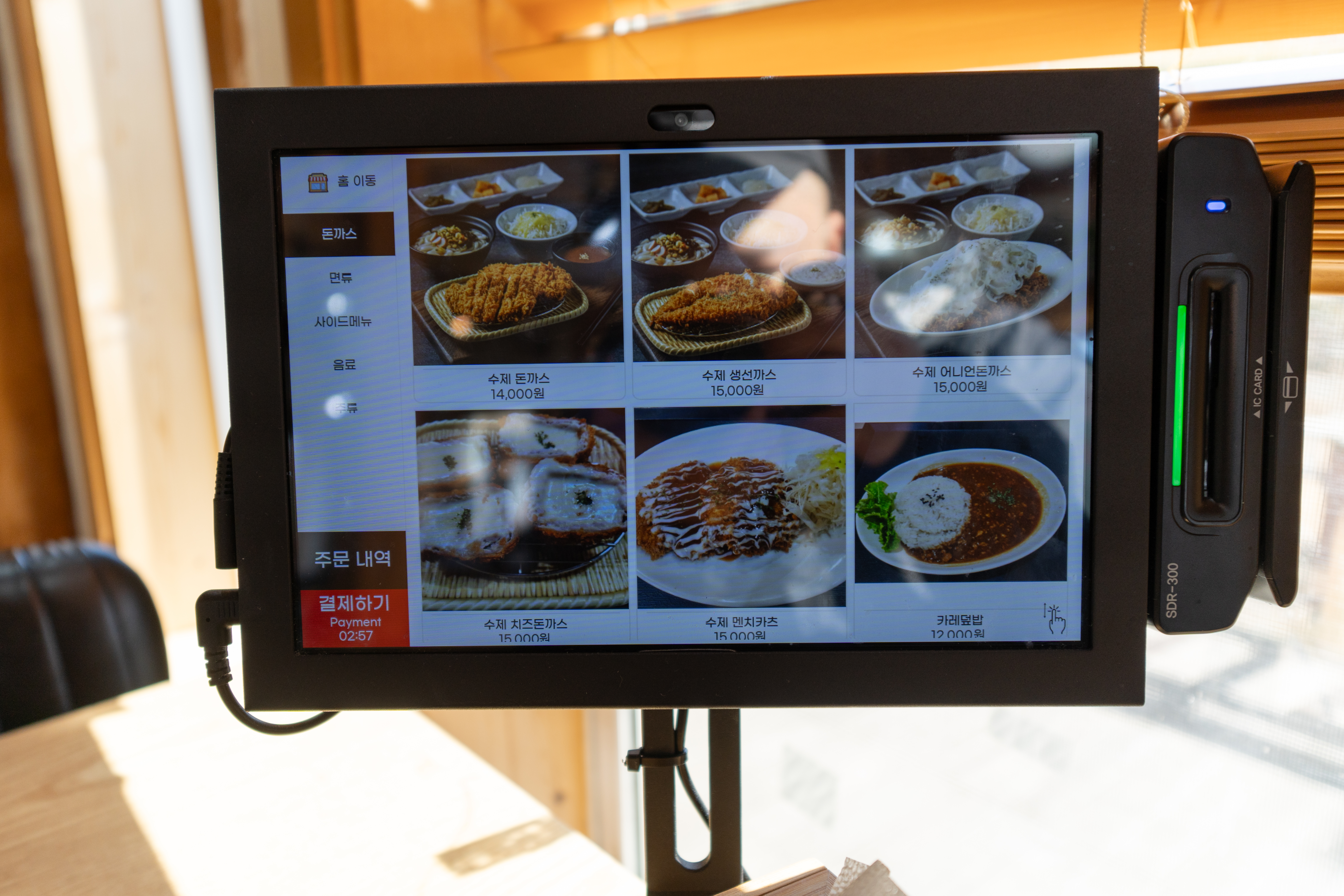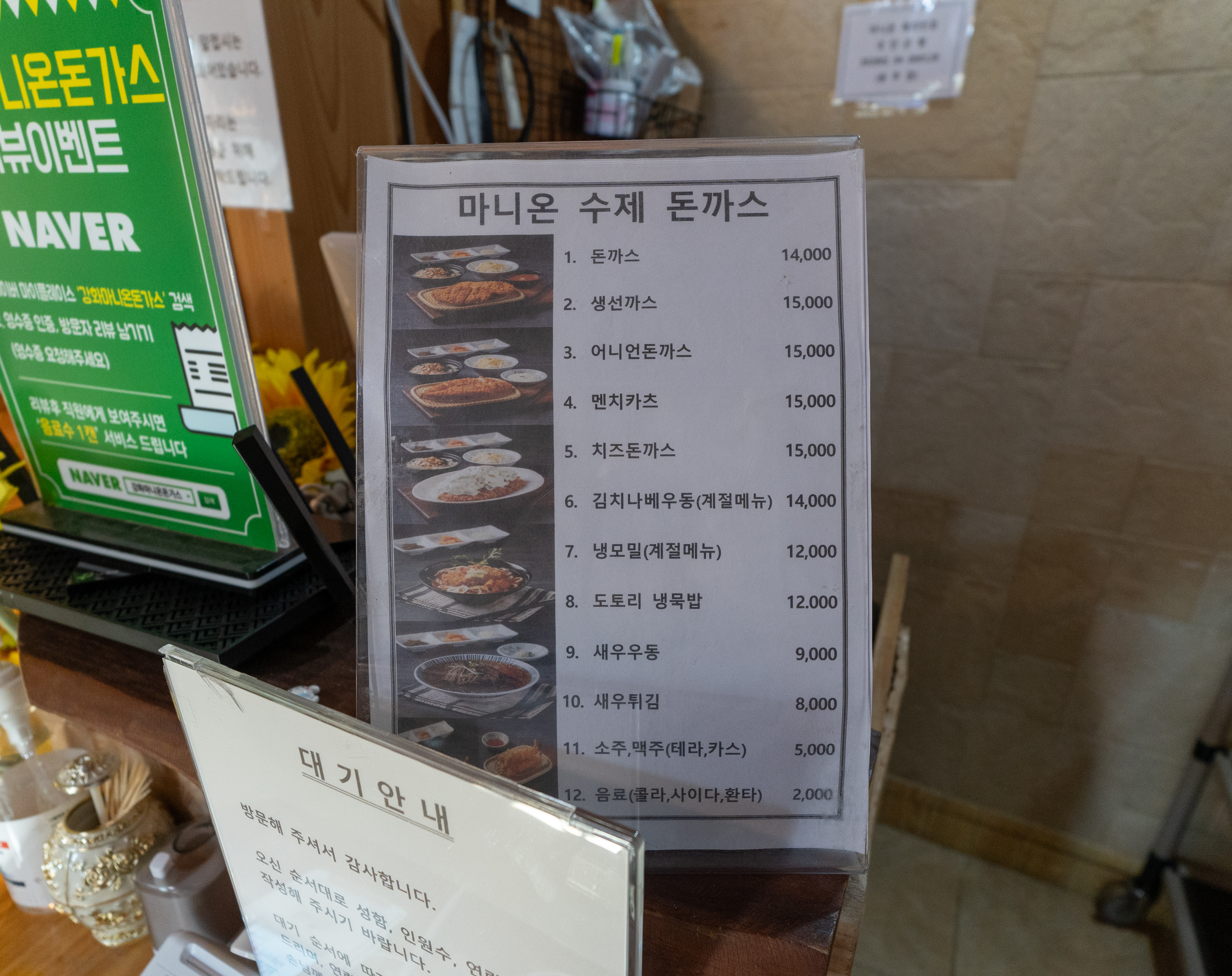 강화 마니온 돈까스의 메뉴는 돈까스, 생선까스, 어니언돈까스, 멘치카츠, 치즈돈까스, *김치나베우동, *냉모밀, 도토리냉묵밥, 새우우동, 새우튀김 등이 있었습니다. 여기서 (*) 표가 있는 메뉴는 계절 메뉴로 여름, 겨울 한정판매 중인 메뉴였습니다. 메뉴는 자리에서 태블릿을 통해 직접 주문에서부터 결제까지 가능했습니다.