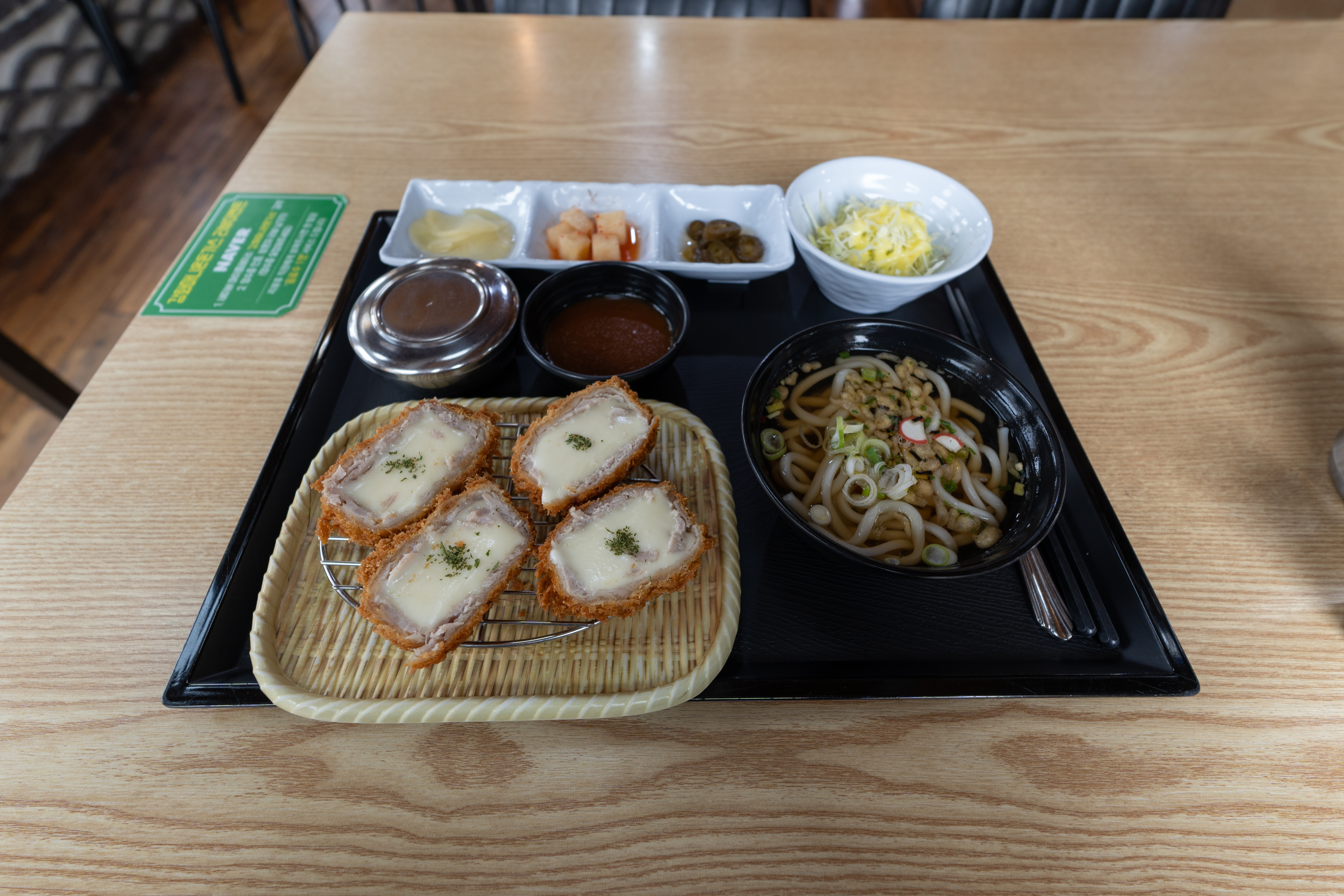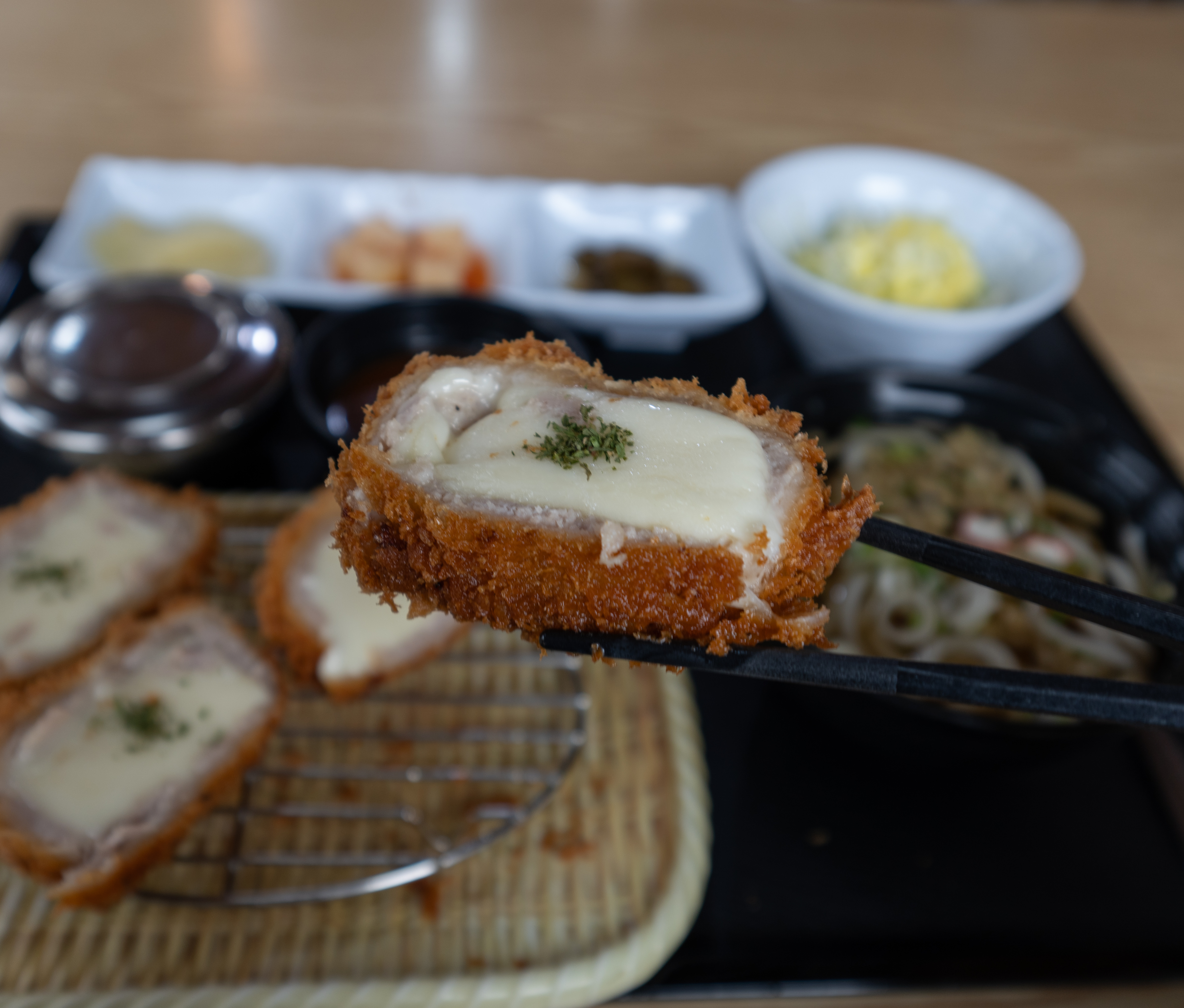 치즈돈까스는 기본 돈까스랑 형태가 살짝 다른데요, 주머니처럼 생긴 돈까스에 쭈-욱 늘어나는 모차렐라 치즈를 듬뿍 넣어 고소하면서도 특색 있는 메뉴였습니다. 치즈돈까스도 기본 돈까스와 마찬가지로 우동과 미니 공깃밥이 같이 제공되고 있었습니다. 이번에 제 블로그에서 새로 소개해드릴 이 메뉴는 어르신들이 좋아할 만한 메뉴였는데요,