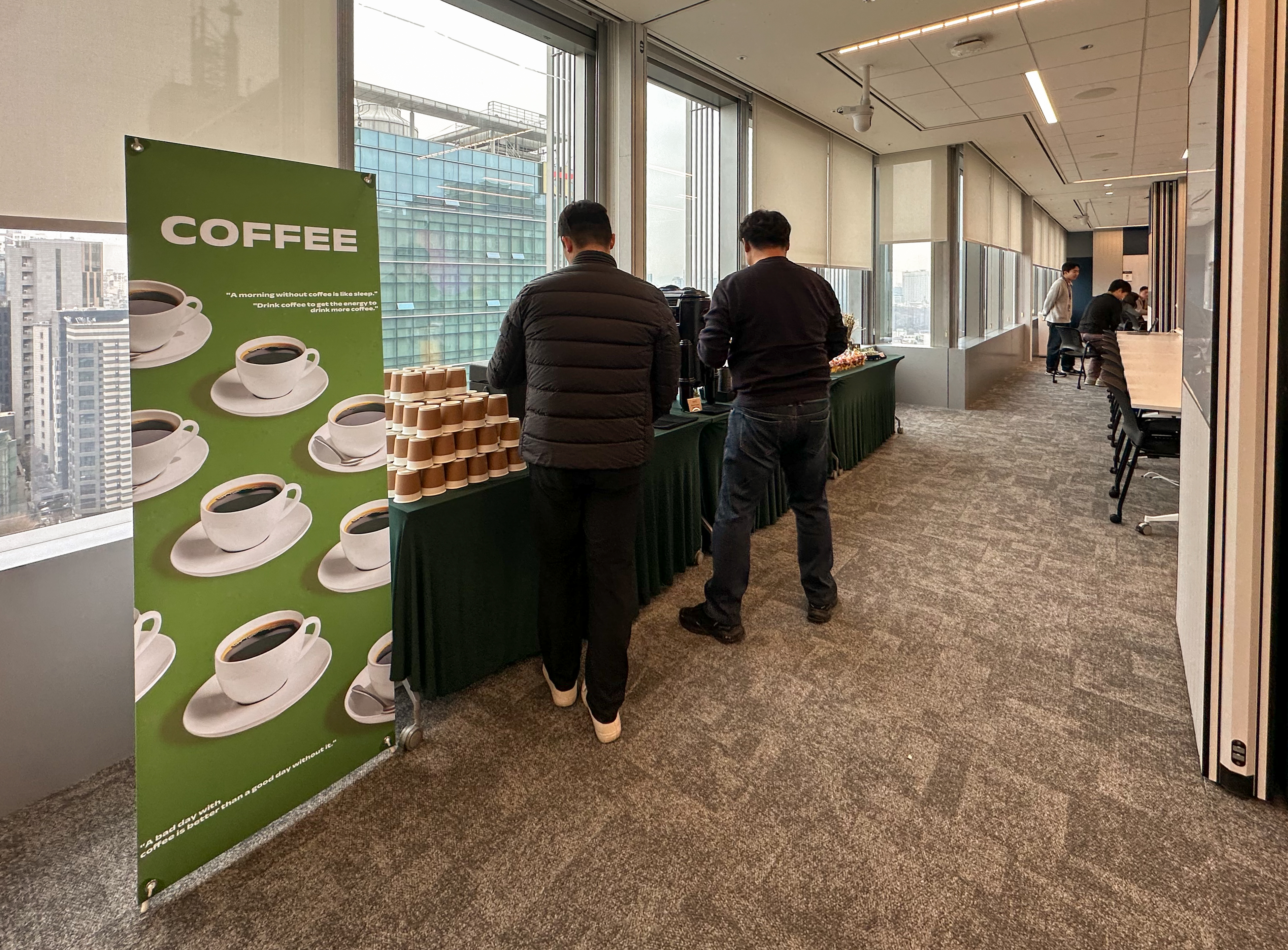 이곳은 서울 인재개발원 커피버스의 딜리버리 서비스가 있었는데요, 커피 딜리버리는 위와 같이 커피 바리스타가 출장하는 대신 커피와 음료를 미리 행사장 인원수에 맞춰 준비해서 최소한의 관리 인원으로 운영하여 커피 케이터링 서비스에 비해 비용적 부담이 상대적으로 적은 편이죠.