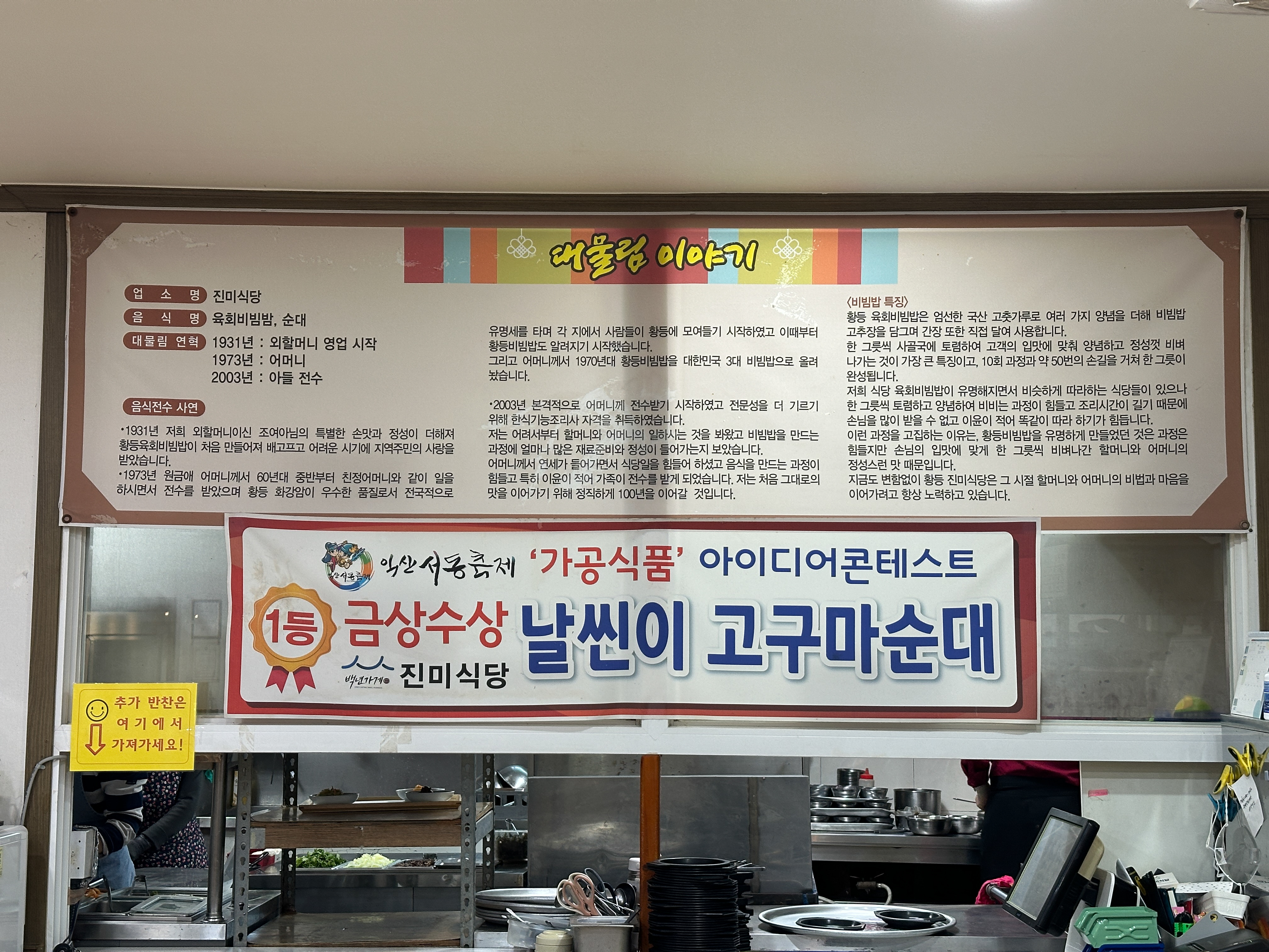 진미식당 가게 안으로 들어가면 고구마순대라는 메뉴도 판매하고 있었고, 1대인 1931년 외할머니를 시작으로, 1973년 어머니, 2003년 아들에 이르기까지 3대에 걸쳐 운영하는 가게라고 적혀있더라고요. 인근에 비슷한 육회비빈밥 가게들이 있었는데, 제가 이 진미식당에 끌린 이유는 아무래도 100년에 가깝게 운영된 대를 이어온 가게라는 점이었습니다.