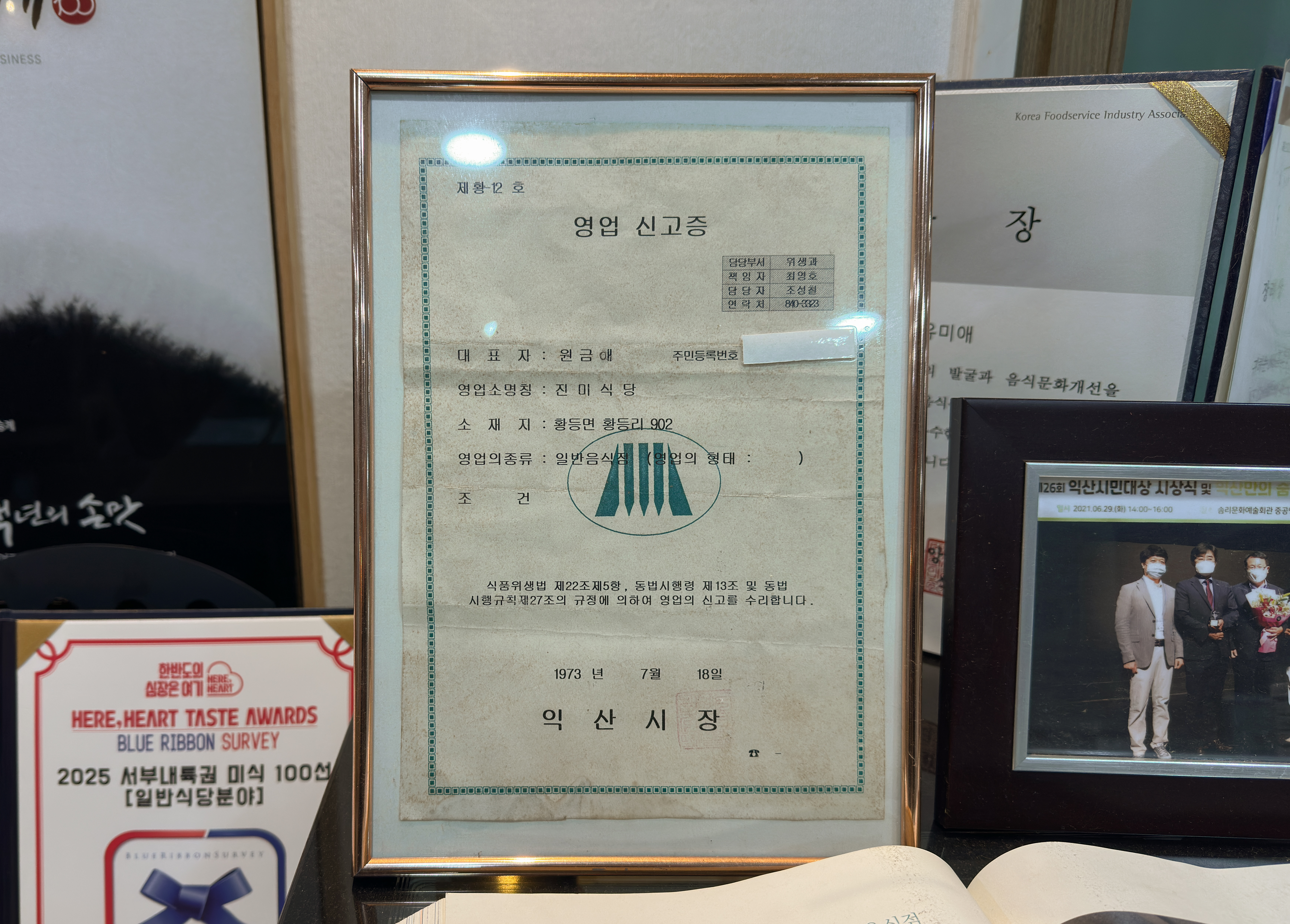 진미식당은 전북특별자치도 익산시 황등면 황등로 158, 1층에 위치해 있었습니다. 주차는 인근 황등 전통시장 주차장에 하면 되었고, 전통시장 주차장에서 걸어서 1-2분 거리라 편리했습니다.