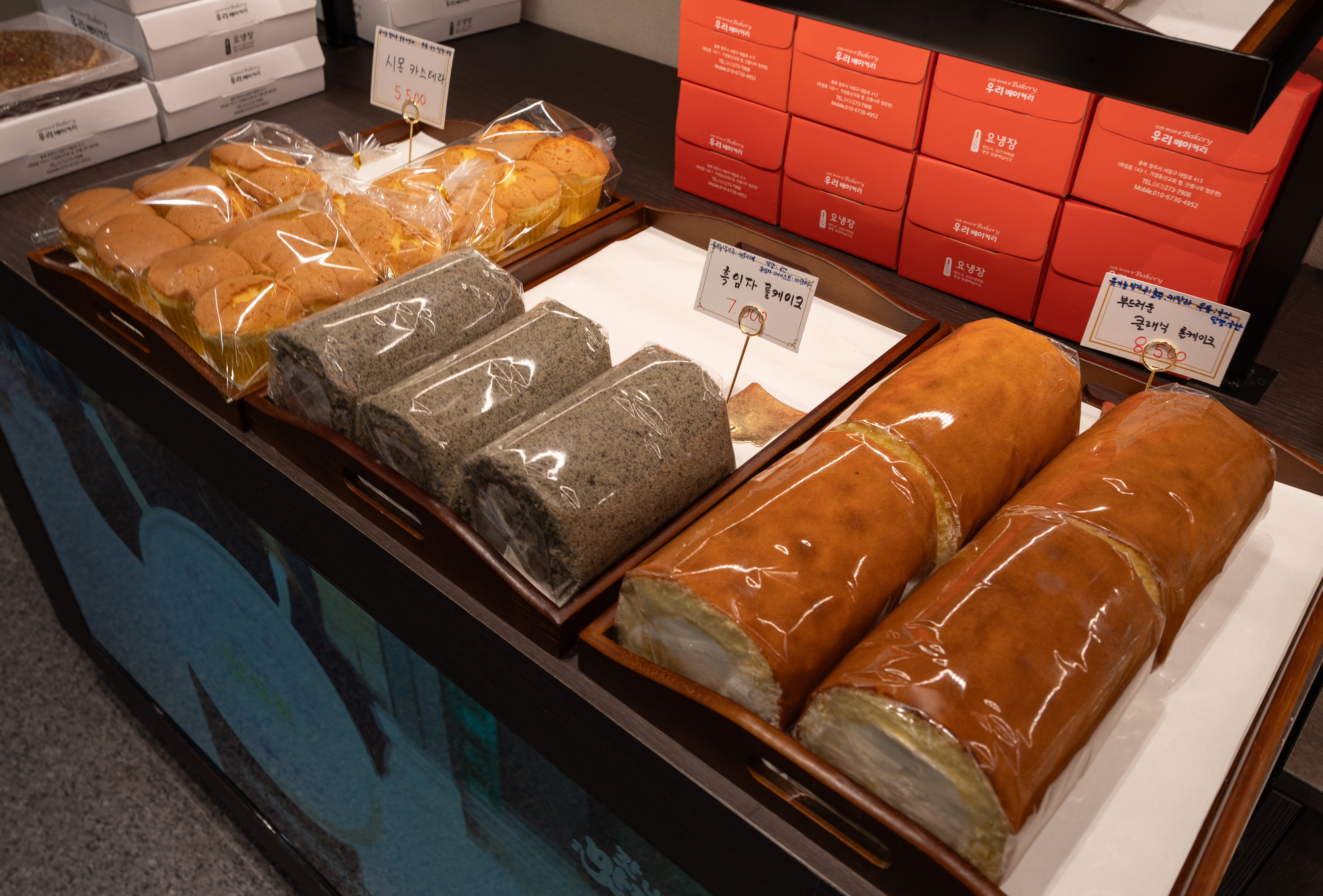 청주 우리베이커리는 초코 케이크로 유명한 가게여서 그런지 무인 키오스크까지 두고, 케이크를 구입할 수 있도록 하고 있었습니다. 우리 베이커리는 빵집답게 가짓수는 많지 않지만 특색있는 빵들도 판매하고 있었습니다.