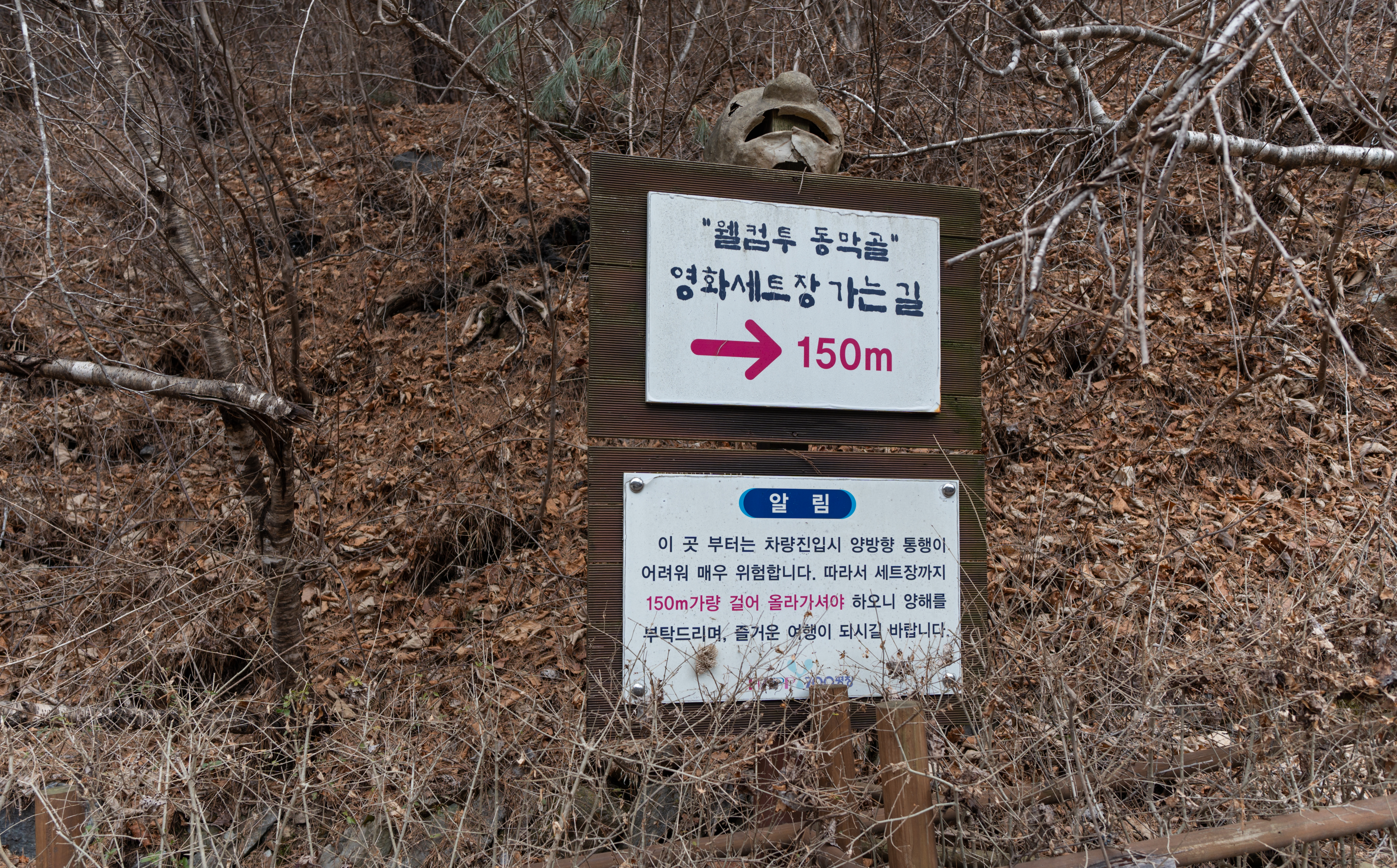 동막골 세트장의 모습은 이렇게 생겼습니다. '걸어서 올라가라'라는 안내문이 붙어있음에도 기어코 차를 끌고왔는지 타이어 자국이 사방에 나 있더라고요. 이번에 왕과사는남자라는 영화를 보았는데, 영화상 노루골은 배우 '안재홍'이 촌장으로 있는 마을로 초반부에 잠깐 나오고 있었지만, 확실히 제가 곳곳을 돌아다니고 사진찍었던 장소여서 그런지 눈에 익더라고요.