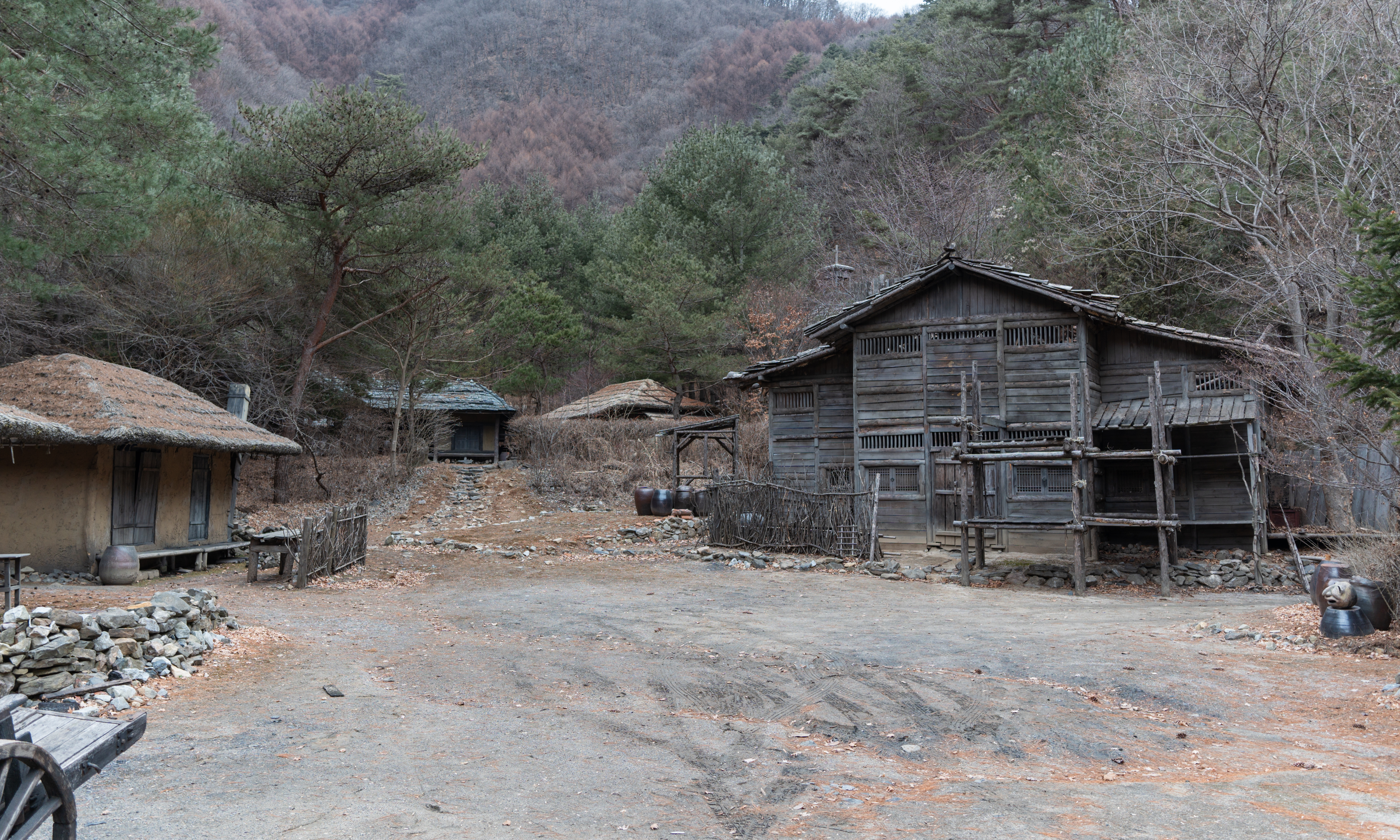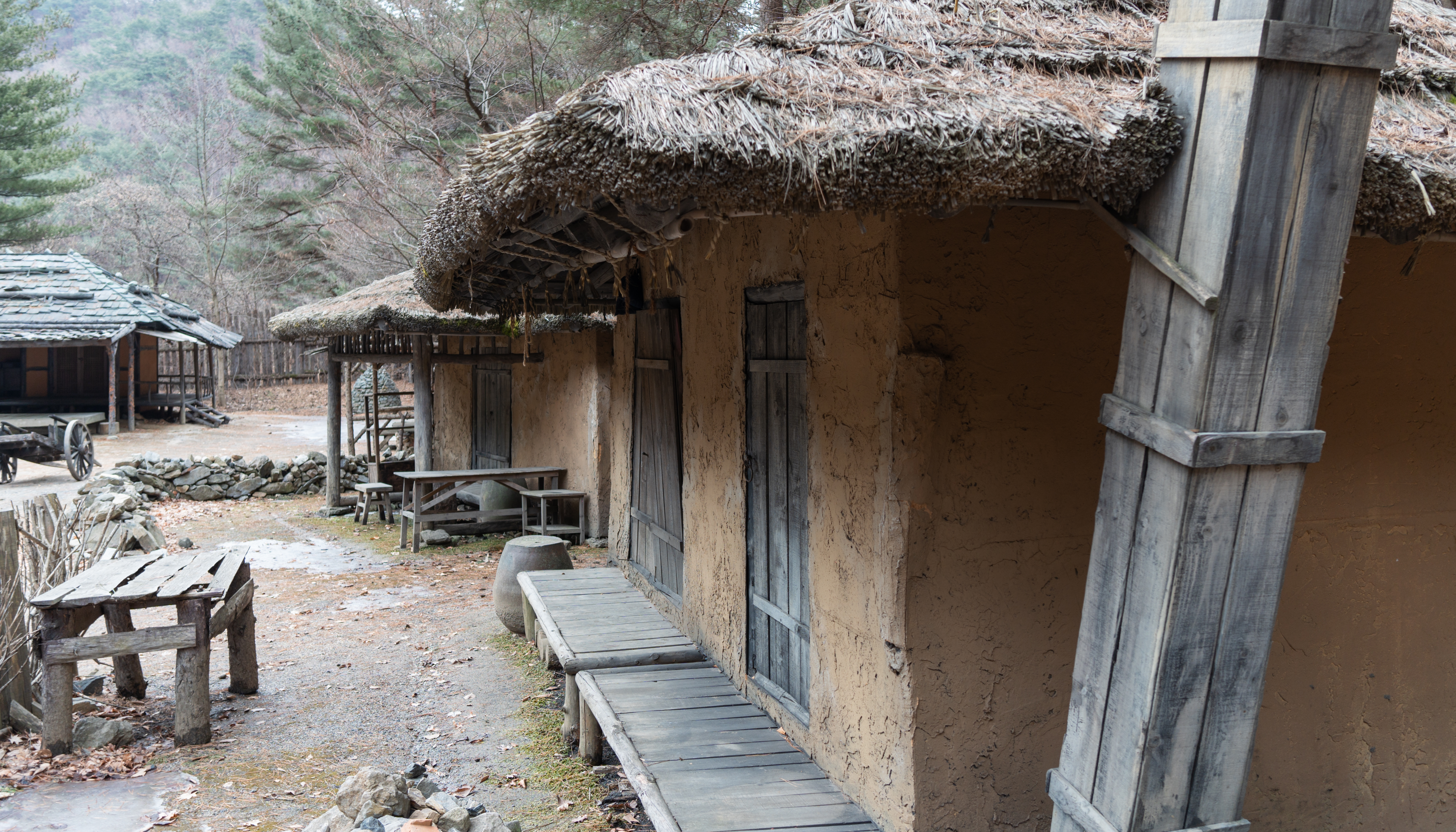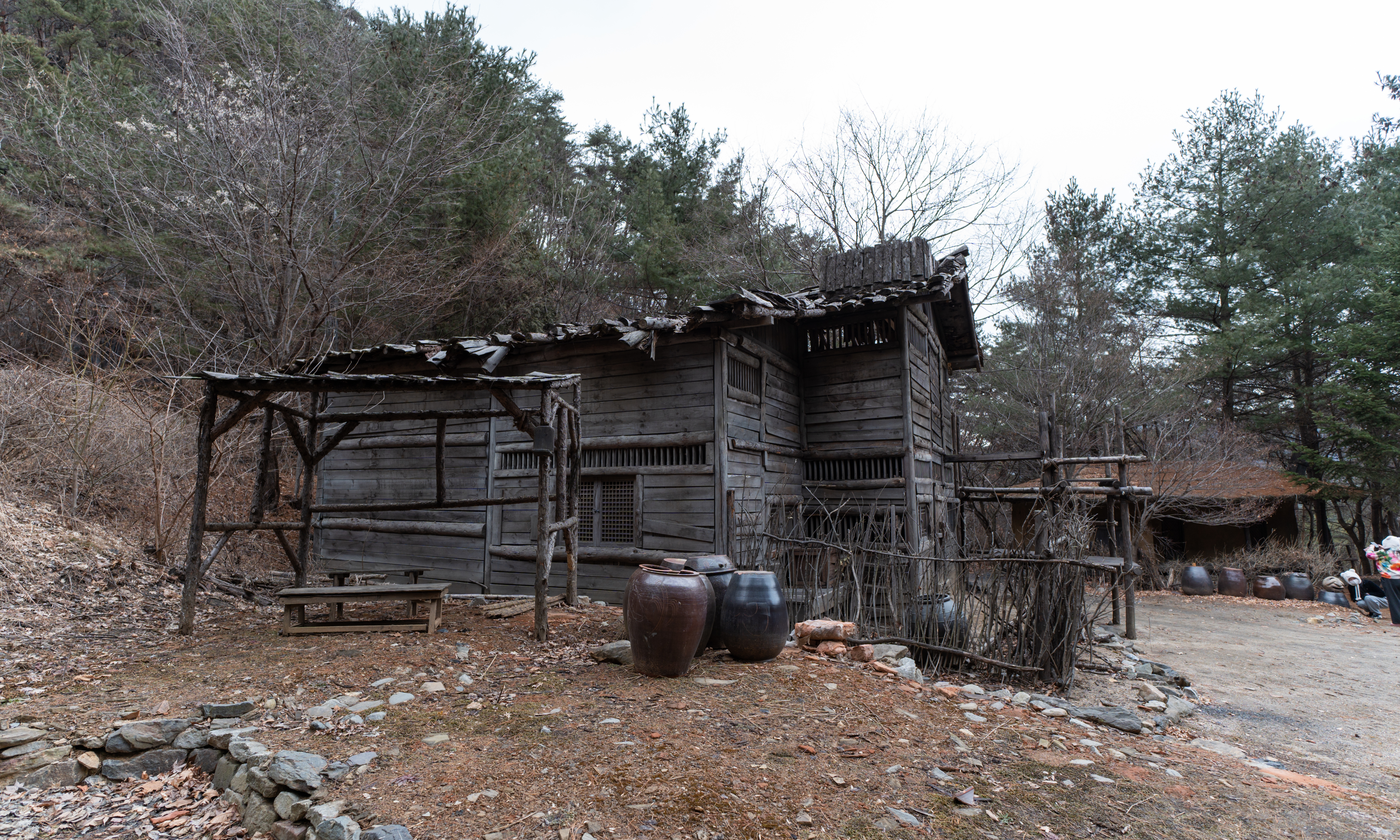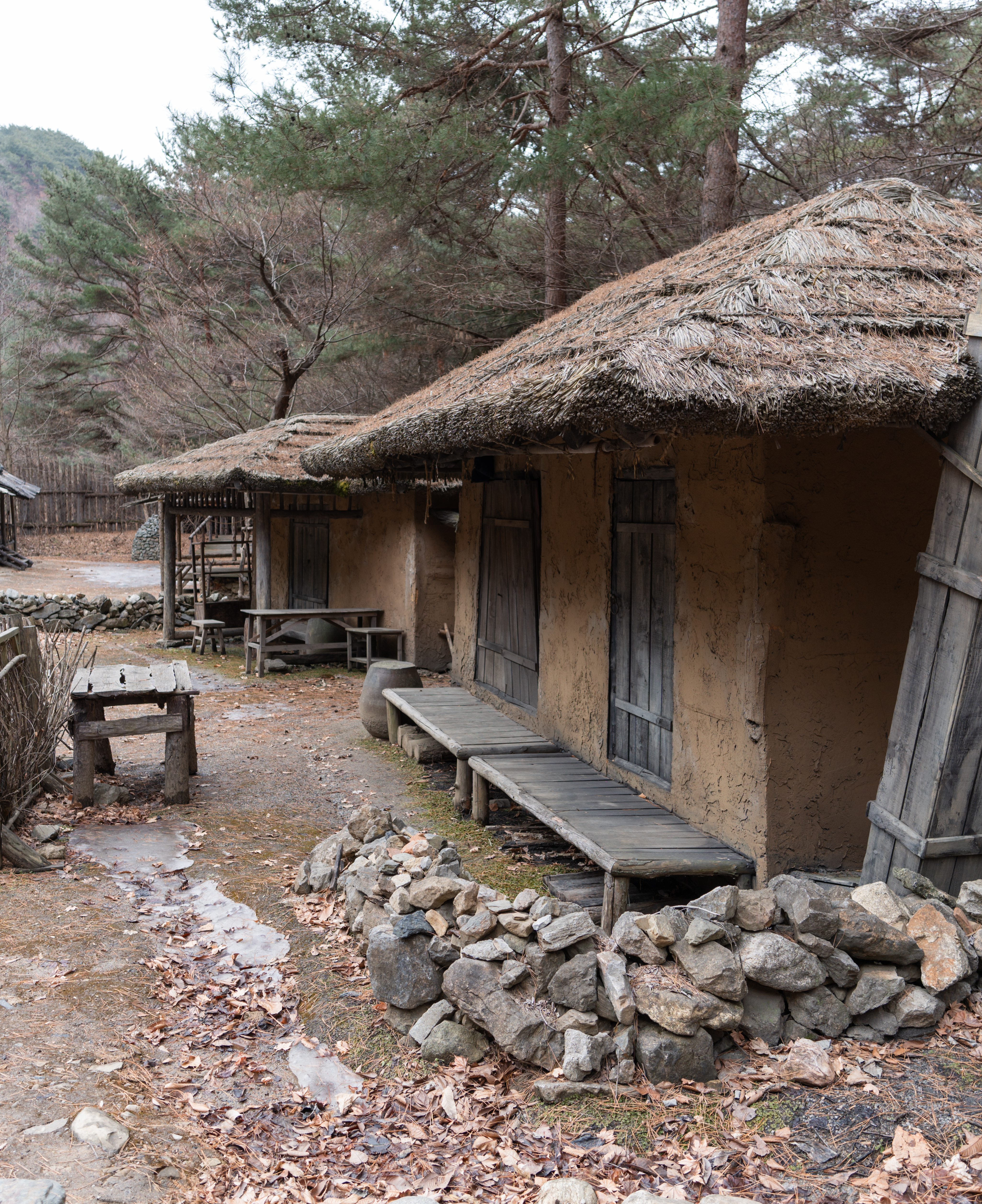 건물들은 실제로 사람들이 살던 터가 아니라 세트장이라 모양만 대충 흉내내놓았을 것 같았는데, 실제로 가보면 그래도 마루나 의자 같은데 잠깐 쉴 수도 있어 보이더라고요. 제가 간 날은 비가 막 내리기 전이라 하늘이 잔뜩 흐려서 1시간 내로 사진만 후다닥 찍고 내려가자는 입장이었는데, 진짜로 제가 촬영을 마치고 내려가니 비가 내리더라고요.