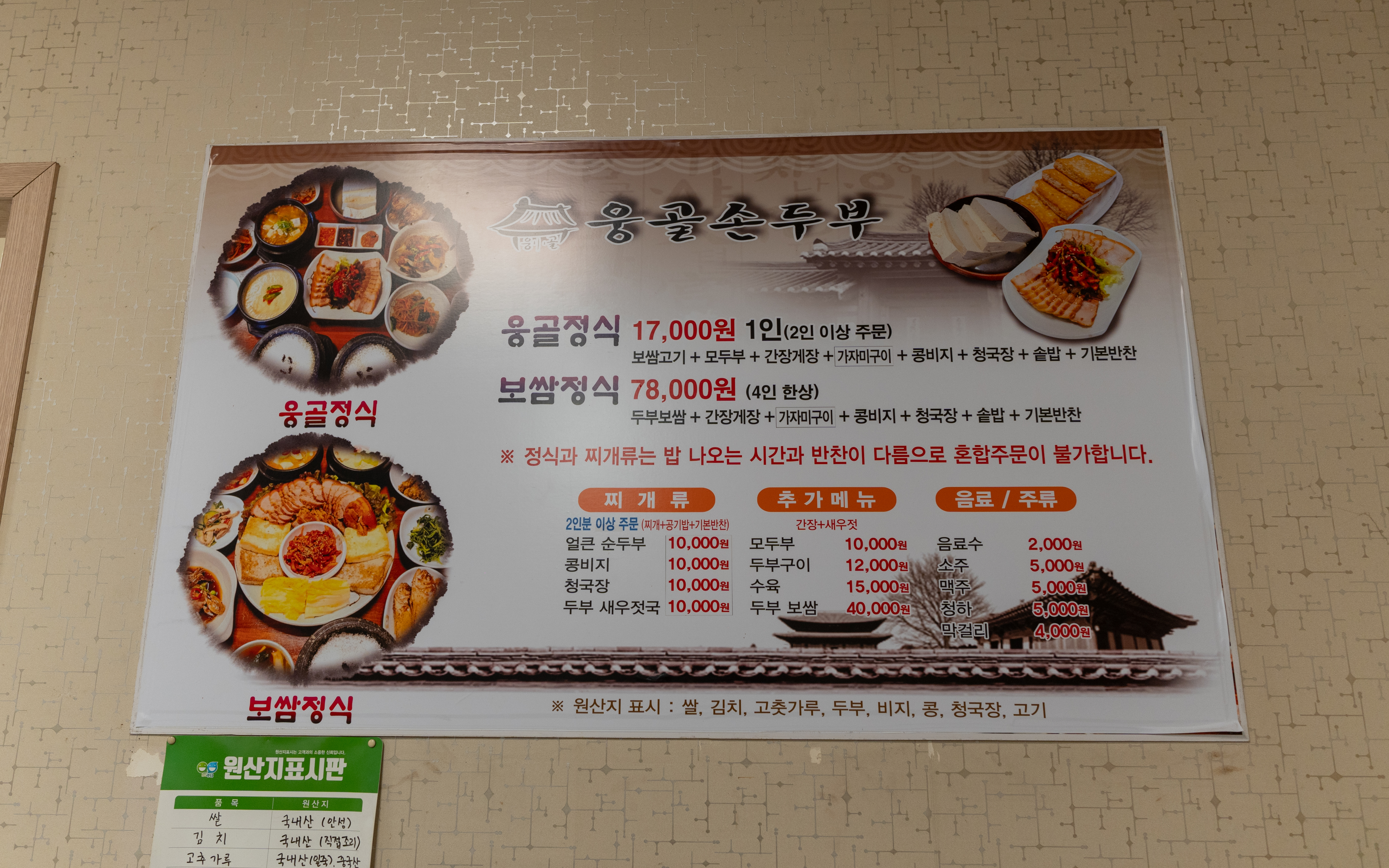 안성 웅골손두부의 메뉴는 웅골정식, 보쌈정식, 얼큰순두부, 콩비지, 청국장, 두부새우젓국, 모두부, 두부구이, 수육, 두부보쌈 등이 있었습니다. 웅골정식의 경우 1인 17,000원으로 가격적으로 크게 부담되지 않았습니다.