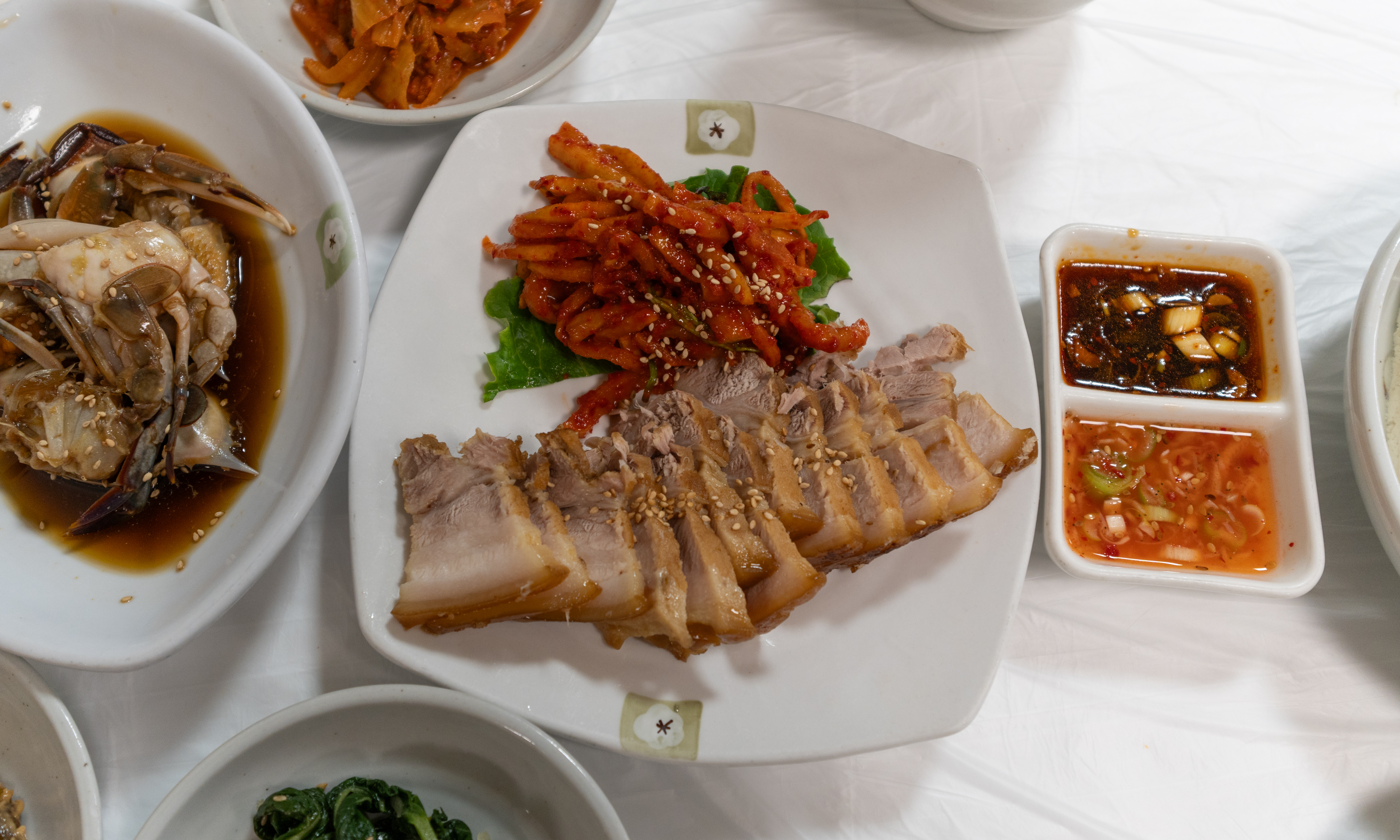안성 웅골손두부의 메뉴는 다음과 같이 준비되었습니다. 보쌈고기, 모두부, 간장게장, 콩비지, 청국장, 생선구이, 솥밥이 함께 나왔습니다. 반찬들은 전체적으로 깔끔하고 맛있었습니다. 특히 두부 전문점이라 모두부와 콩비지, 청국장 같은 메뉴들이 특화되어 맛있었습니다.