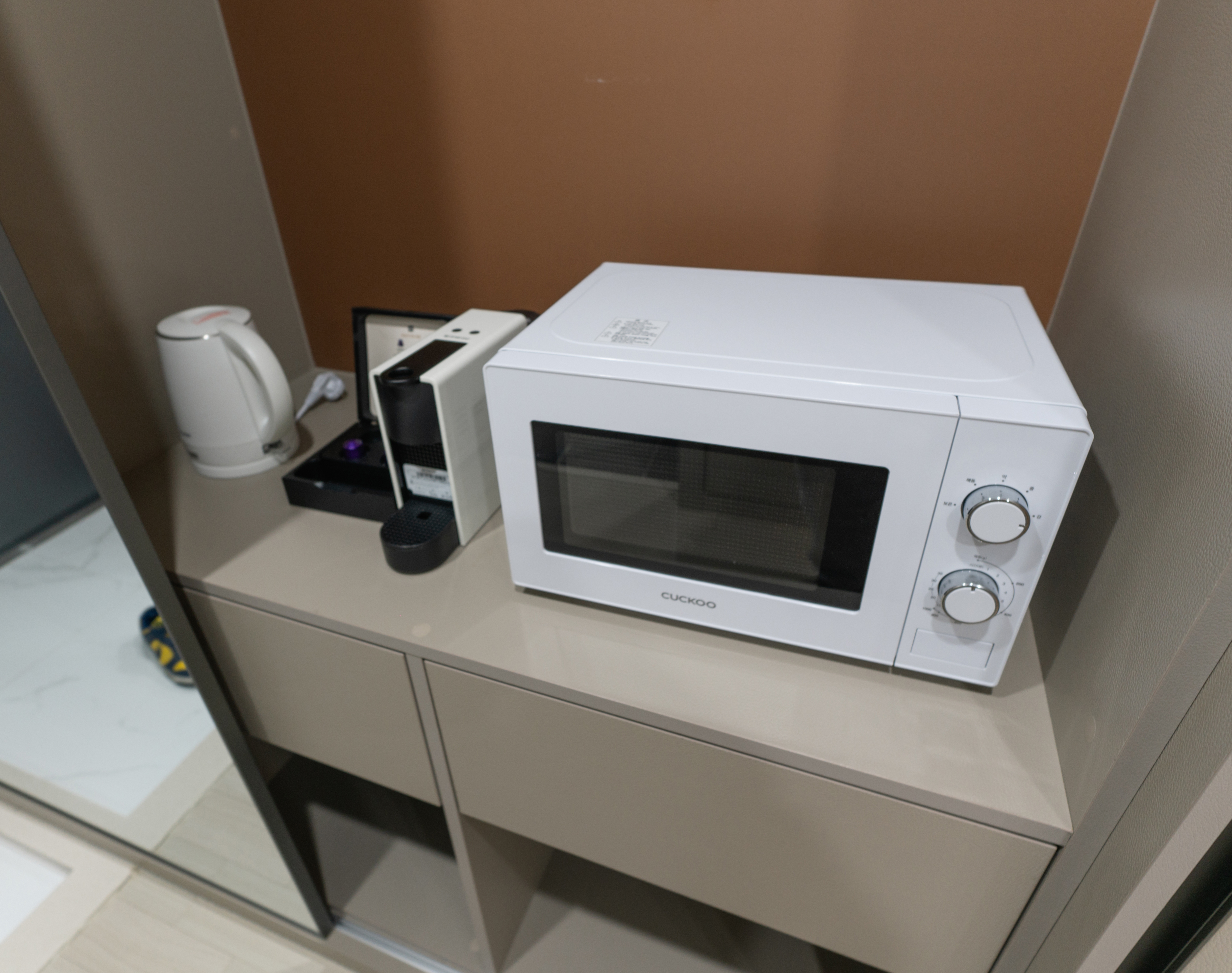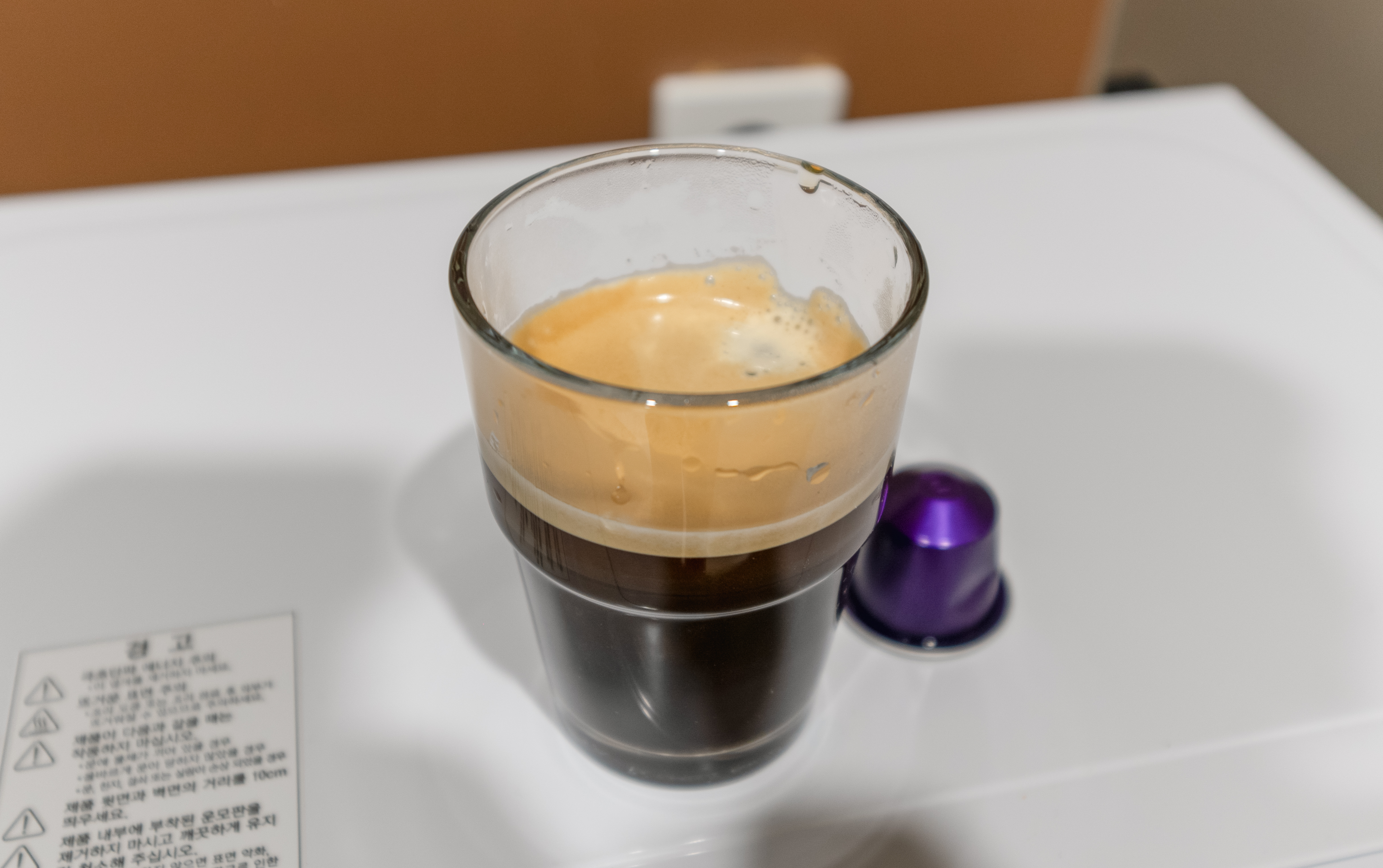 에어컨과 TV도 최신식으로 갖추고 있었고, 에이컨도 곰팡이 없이 깨끗하게 잘 유지되어 있어 좋았습니다. 요즘 전자레인지는 기본이고 조금 더 고급스러운 숙소는 캡슐형 커피머신(네스프레소)이 있는곳이 많이 늘어나는 추세인 것 같습니다. 캡슐을 기본 2개를 제공하고 있어서, 저녁에 한번 아침에 한번 타서 마셨습니다. 그밖에 제가 이용한 객실은 특별한 서비스가 있었는데요,