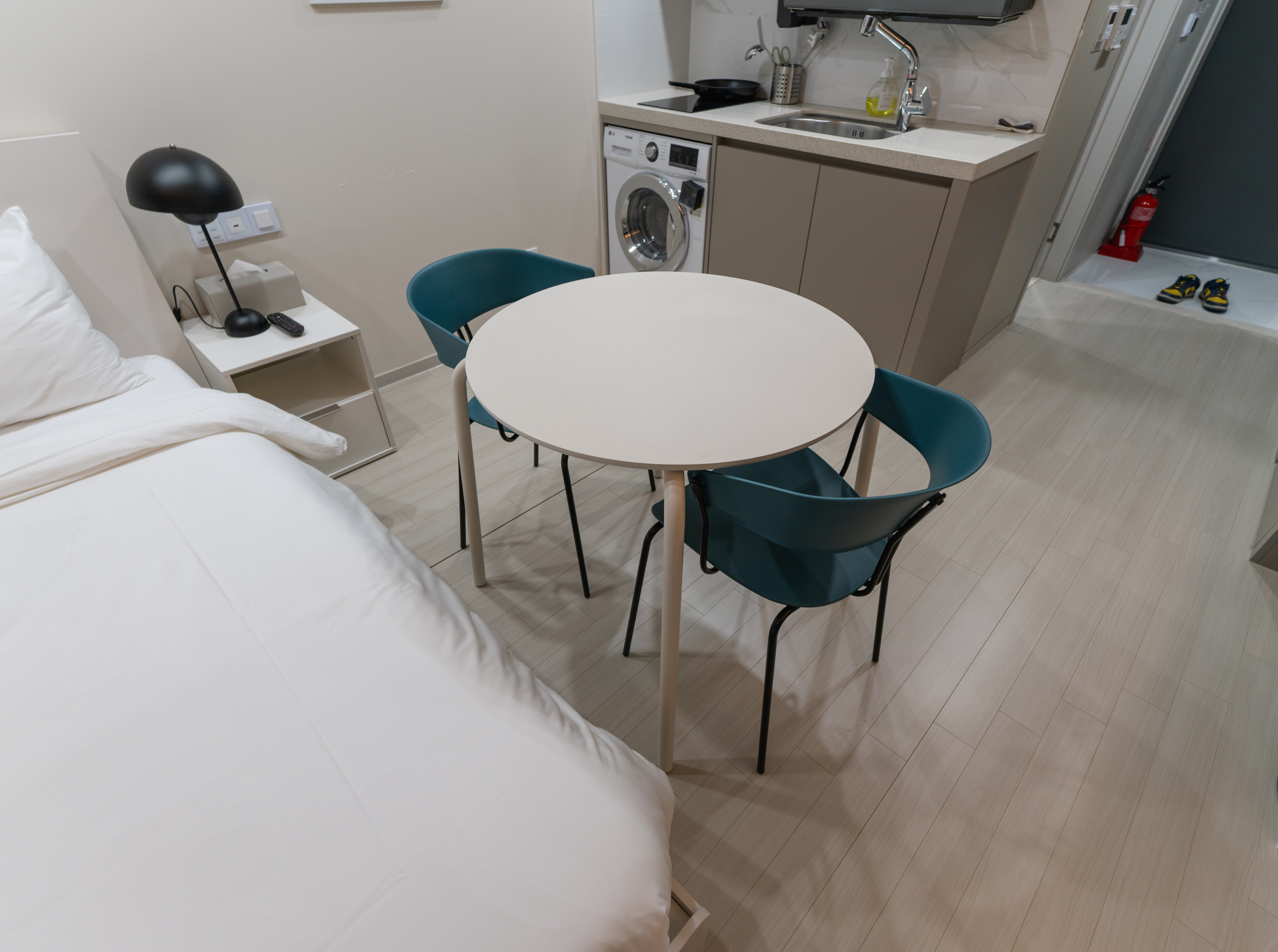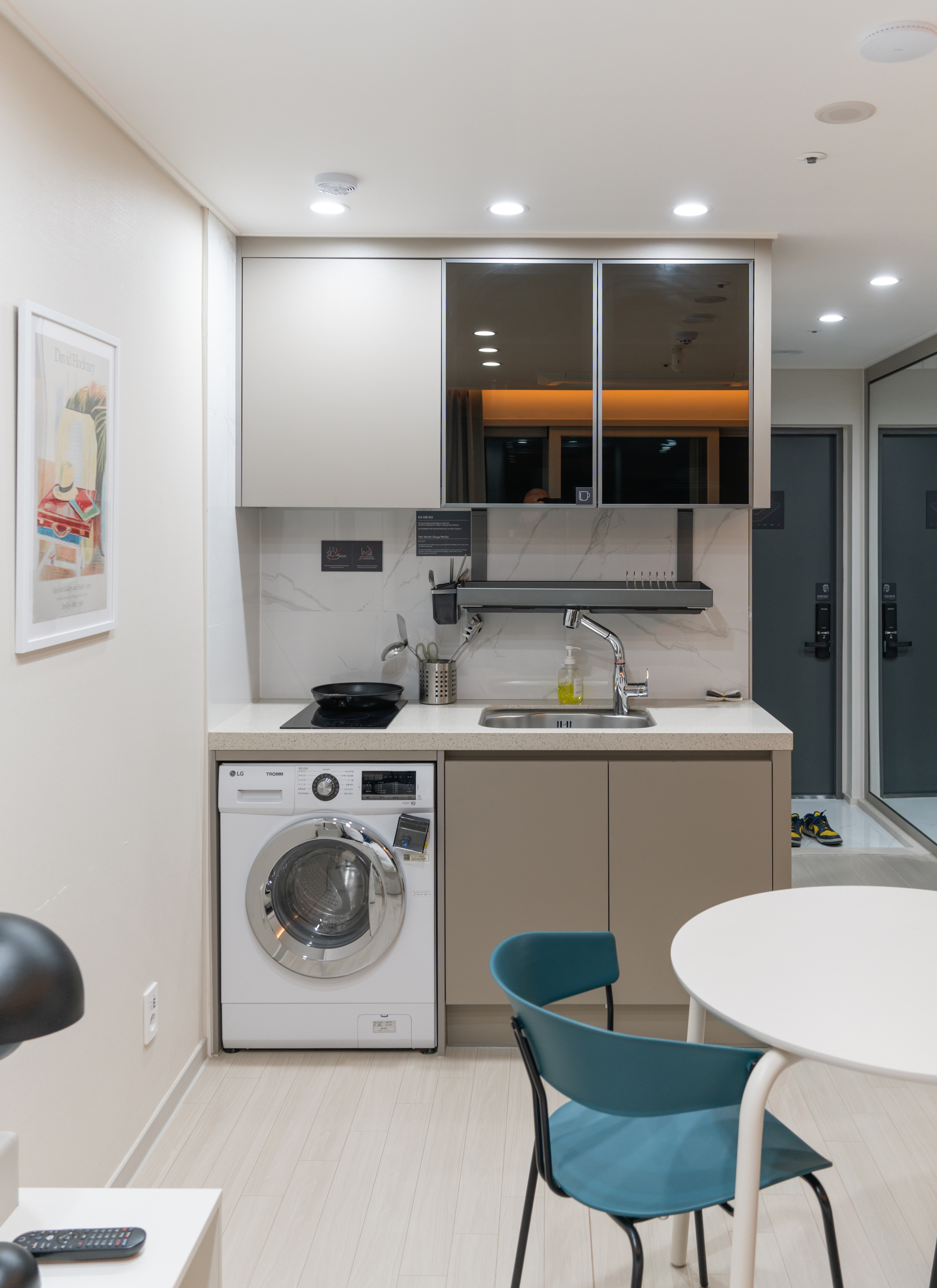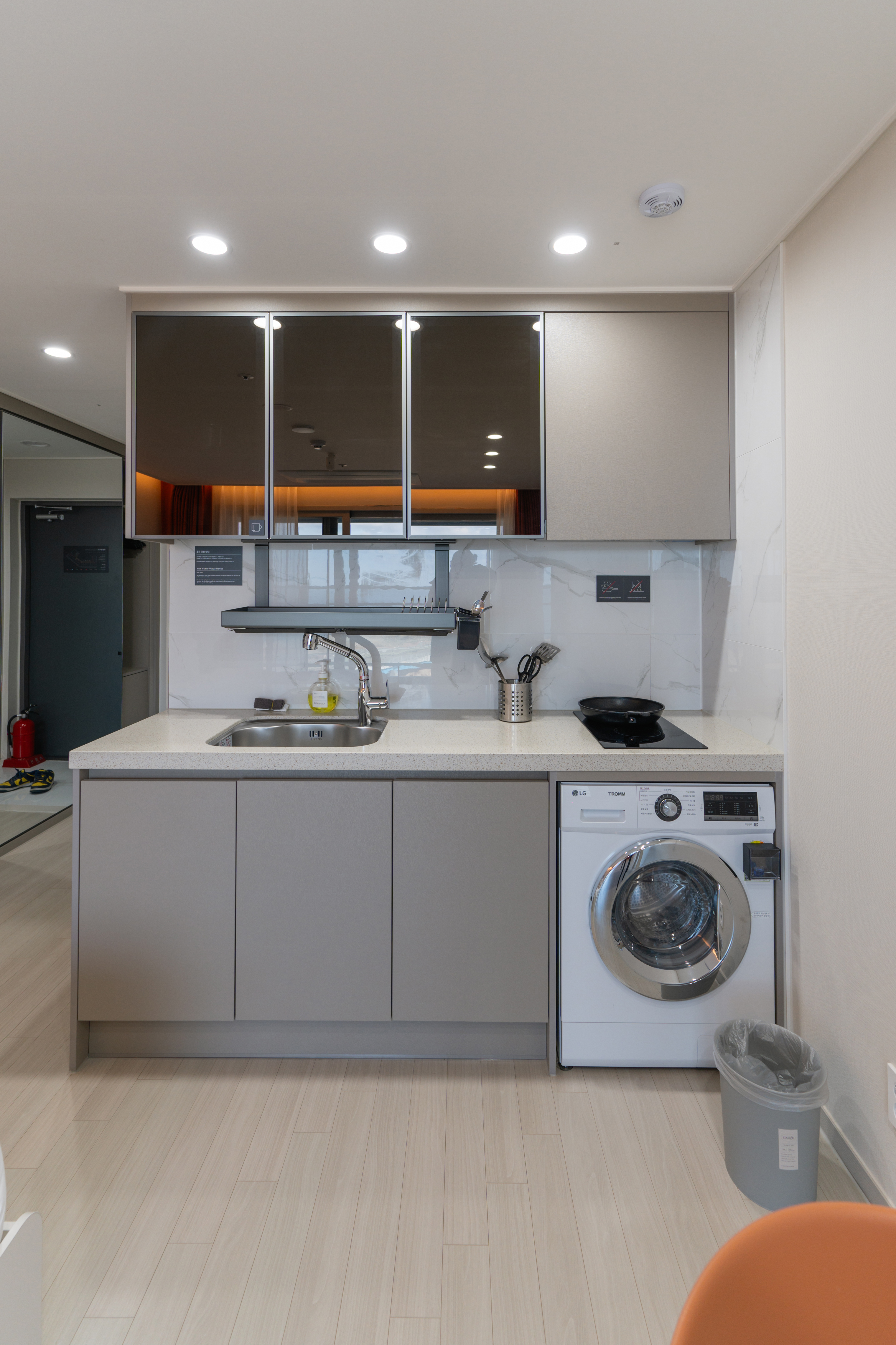 그밖에 주방에 접시와 간단한 조리도구 냄비 등이 있었고, 가위, 국자, 뒤집개, 집게 등 요리에 필요한 도구들도 잘 갖추고 있어서 좋았습니다. 저는 막상 사용할 일은 없었지만, 케이크를 하나 구입해서 덜어먹을 접시와 포크정도 사용했던 기억이 있습니다. 그리고 세탁기도 사용할 수 있도록 캡슐형 세제를 하나 제공하고 있어서 자기 전에 빨래도 돌려놓고 잘 수 있어서 좋았습니다. 부산의 어떤 호텔은 요리와 세탁기 이용 심지어 주차장까지 비용을 청구하던 것에 비하면 이곳은 거의 다 퍼주다시피(?) 하는 것 같습니다.