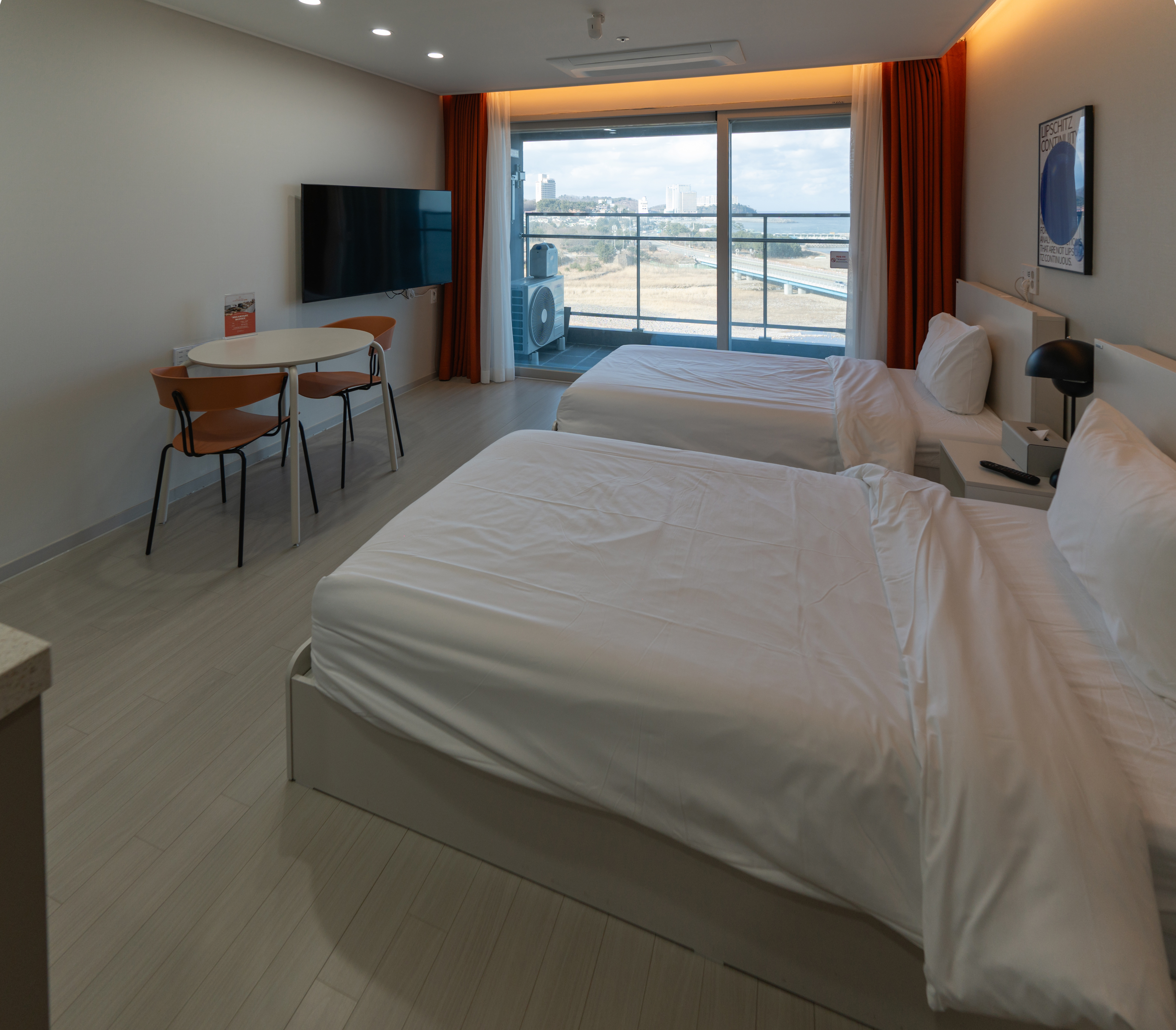 스탠다드 트윈 오션뷰는 어떤가요? 첫째 날 머물렀던 하프오션뷰보다는 괜찮았는데, 아무래도 바다에서 살짝 거리가 있다 보니 바다가 바로 펼쳐진 느낌이라기보다는 어느 정도 시원하게 트인 바다뷰를 볼 수 있다 정도인 것 같습니다.
