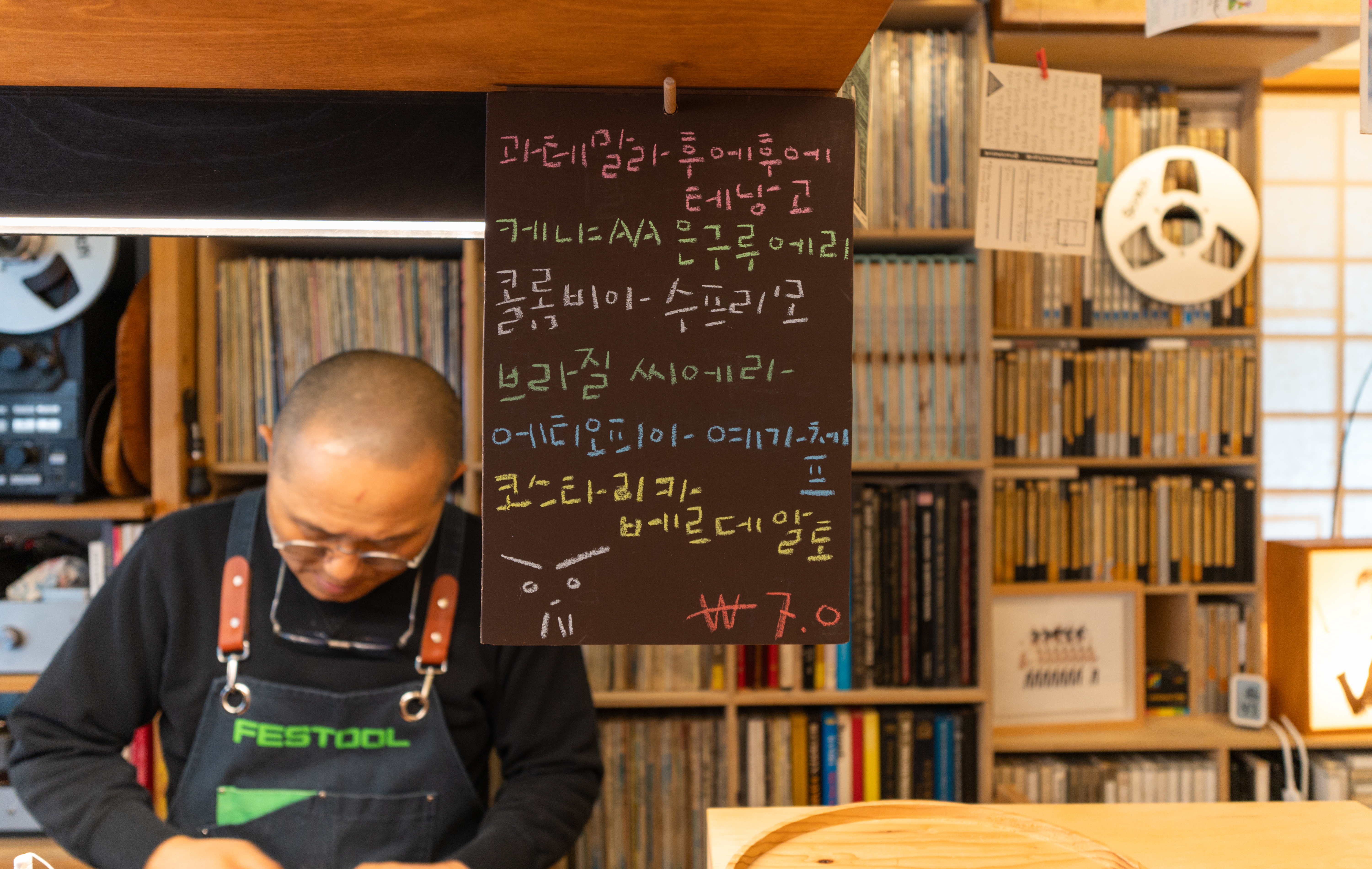 노란 조명이 주는 따뜻한 색감의 빛에 카페 전체적으로 화이트 앤 우드 톤을 사용하고 있어 더 아늑한 느낌이 있었던 것 같습니다. 카페 내 스피커는 진공관 앰프에 연결되어 있어 그런지 따뜻한 음색까지 더 오래 머무르고 싶어지는 그런 공간이었습니다. 우선 카페 메뉴부터 살펴보고 나머지 카페 분위기를 둘러보도록 하시죠.